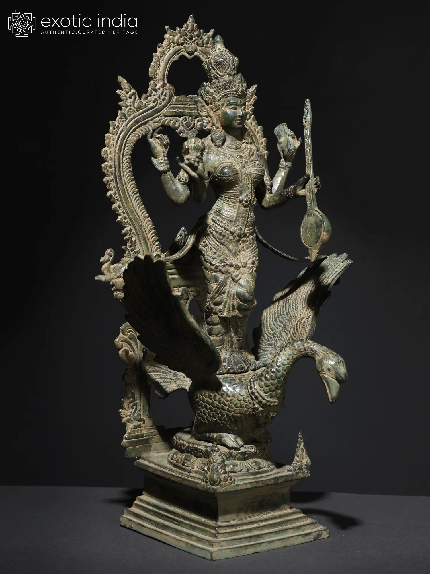 18" Four-Armed Hindu Goddess Saraswati Standing on Swan | Brass Statue from Indonesia