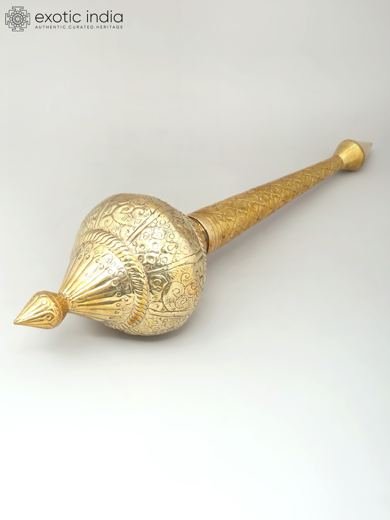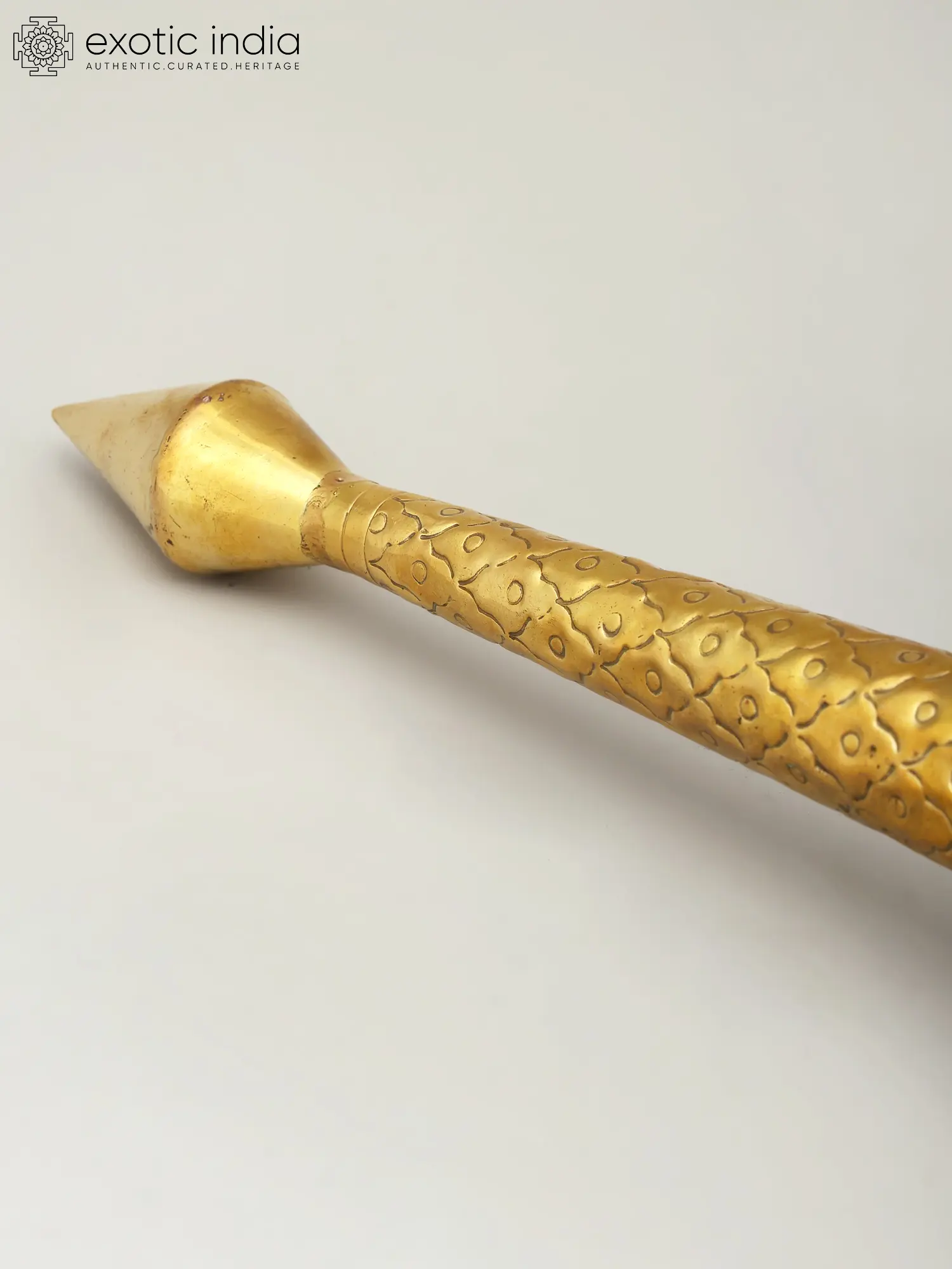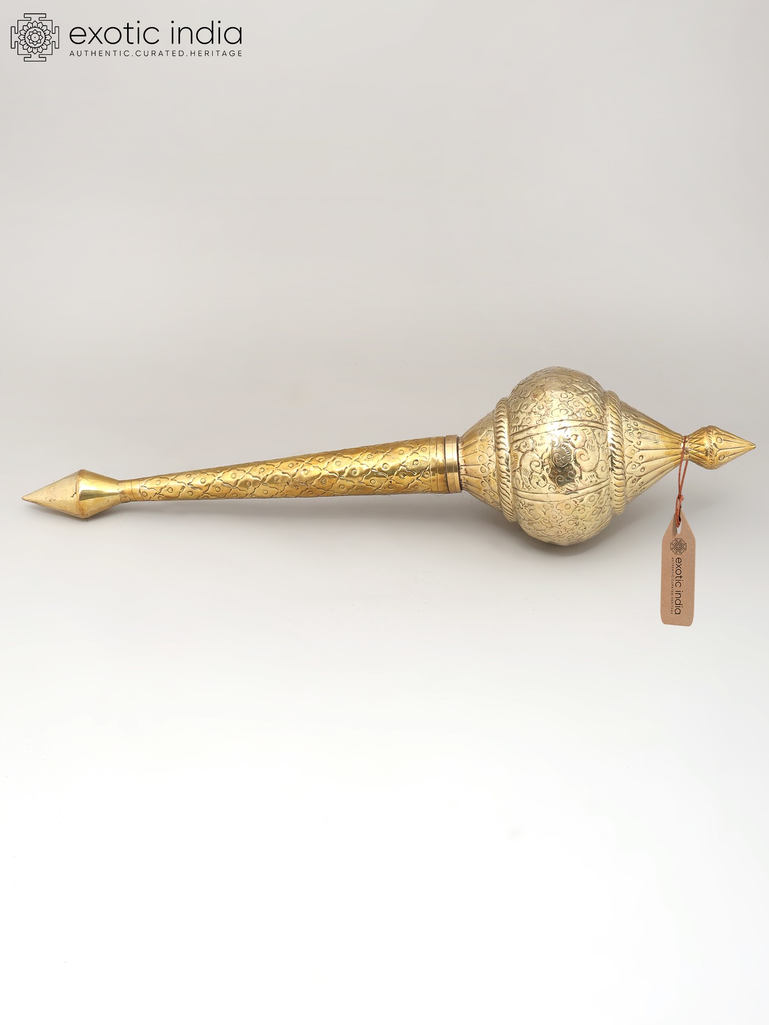 The Gada or mace of Bajarangabli for his devotee is a symbol of his unparalleled powers, which guard Dharma and its followers in Kaliyuga. Presenting the might of Lord Hanuman, this handmade brass Gada is splendidly molded and embellished, giving it a superb appearance. Placing this in one’s place of worship or offering the Gada to a Hanuman temple is bound to reward the devotee with boons of ever-lasting strength, in body, and character, and make them worthy of the compassion of Rama-Duta.
