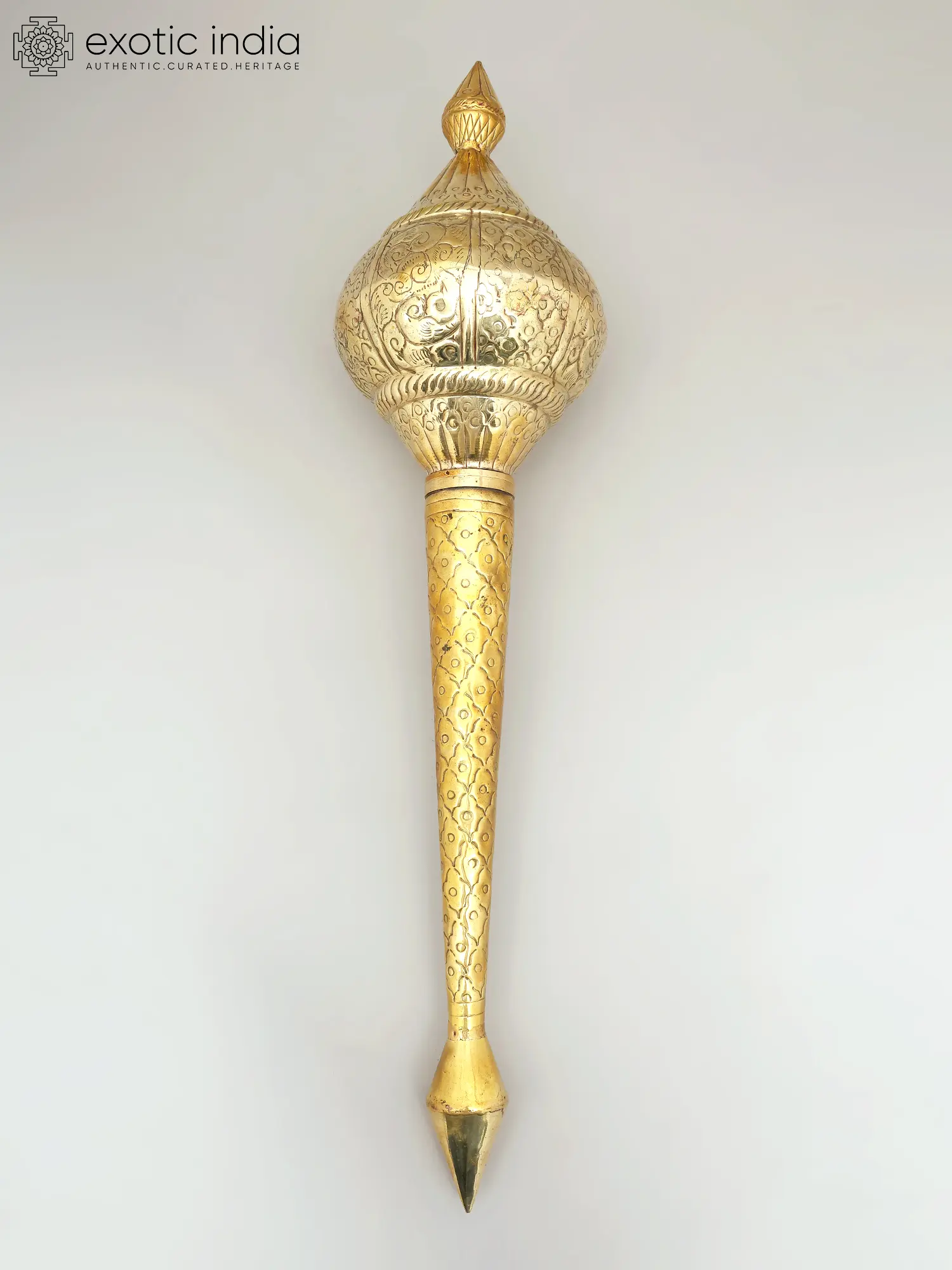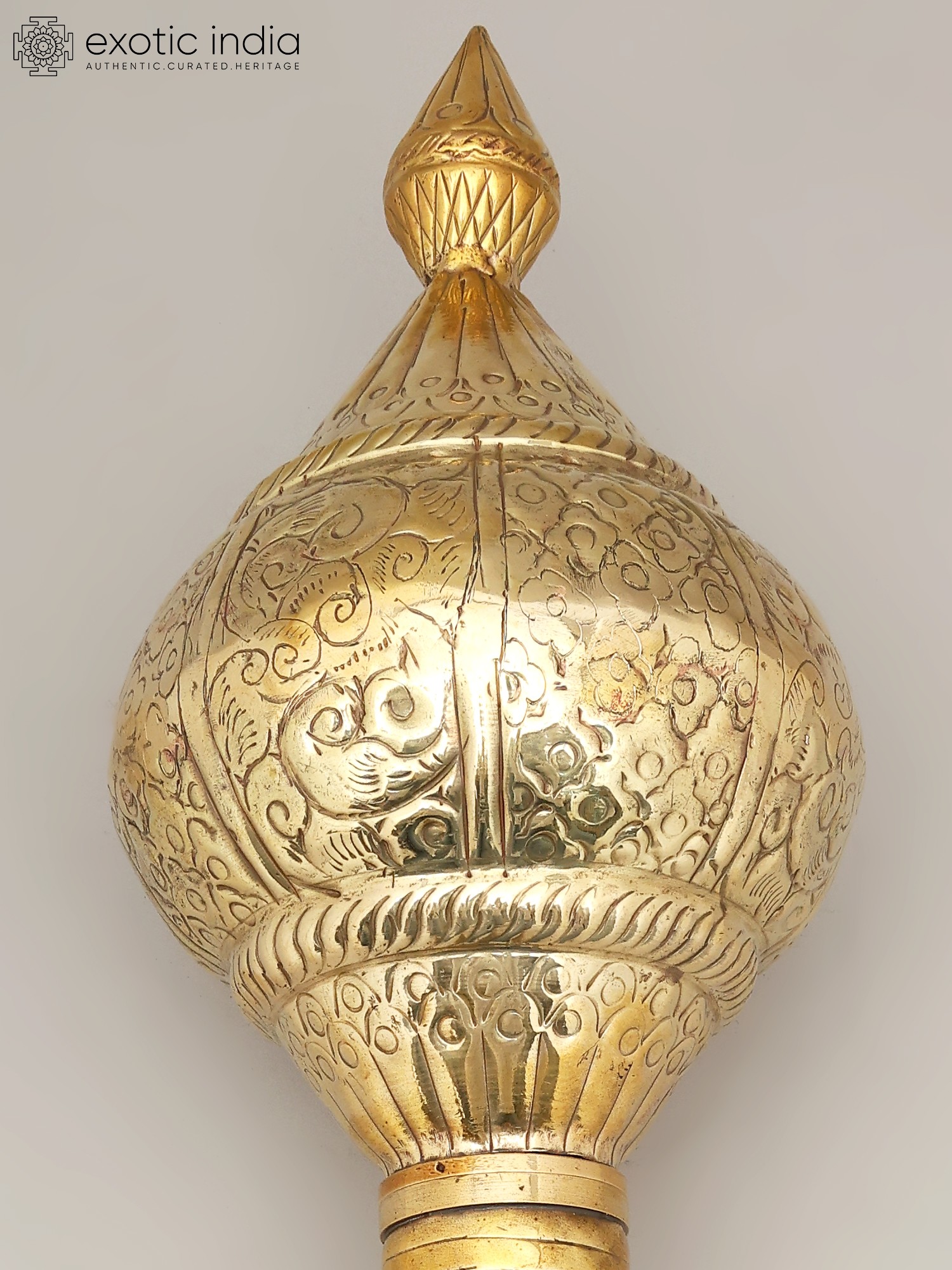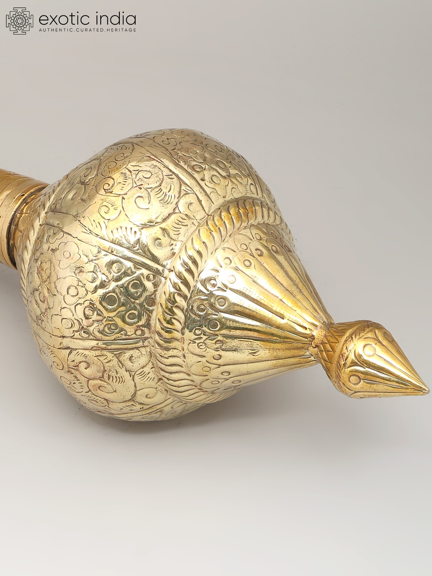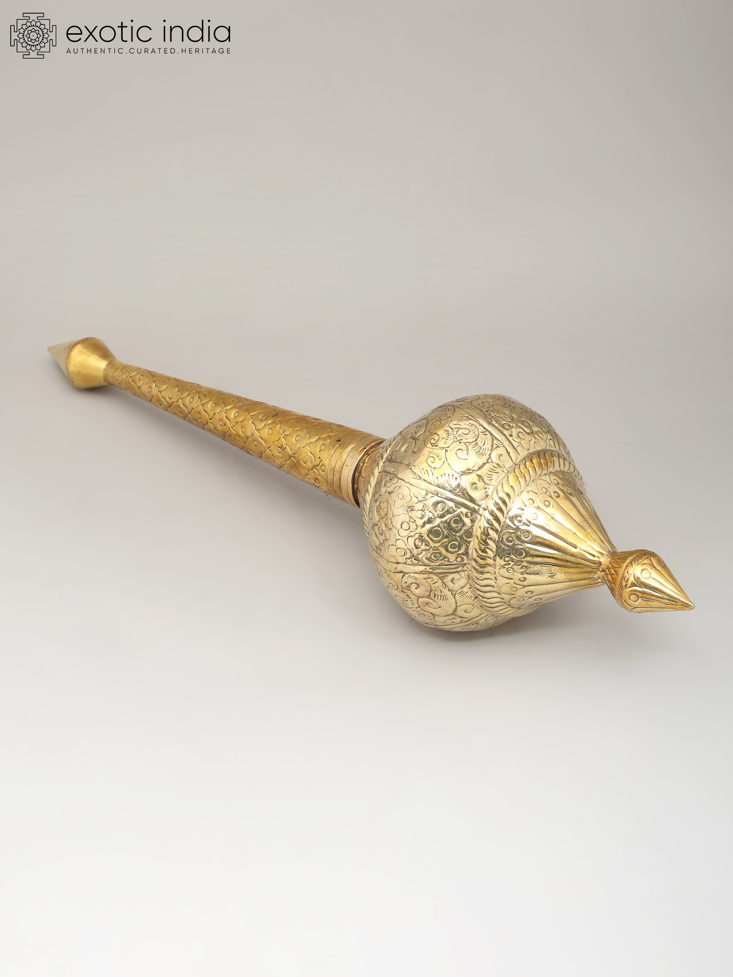 The Gada or mace of Bajarangabli for his devotee is a symbol of his unparalleled powers, which guard Dharma and its followers in Kaliyuga. Presenting the might of Lord Hanuman, this handmade brass Gada is splendidly molded and embellished, giving it a superb appearance. Placing this in one’s place of worship or offering the Gada to a Hanuman temple is bound to reward the devotee with boons of ever-lasting strength, in body, and character, and make them worthy of the compassion of Rama-Duta.