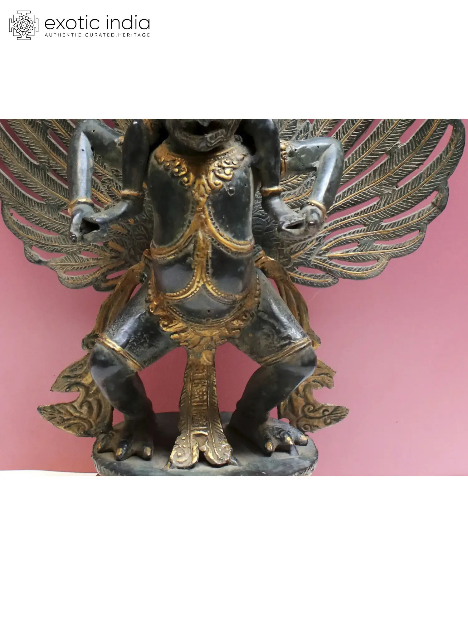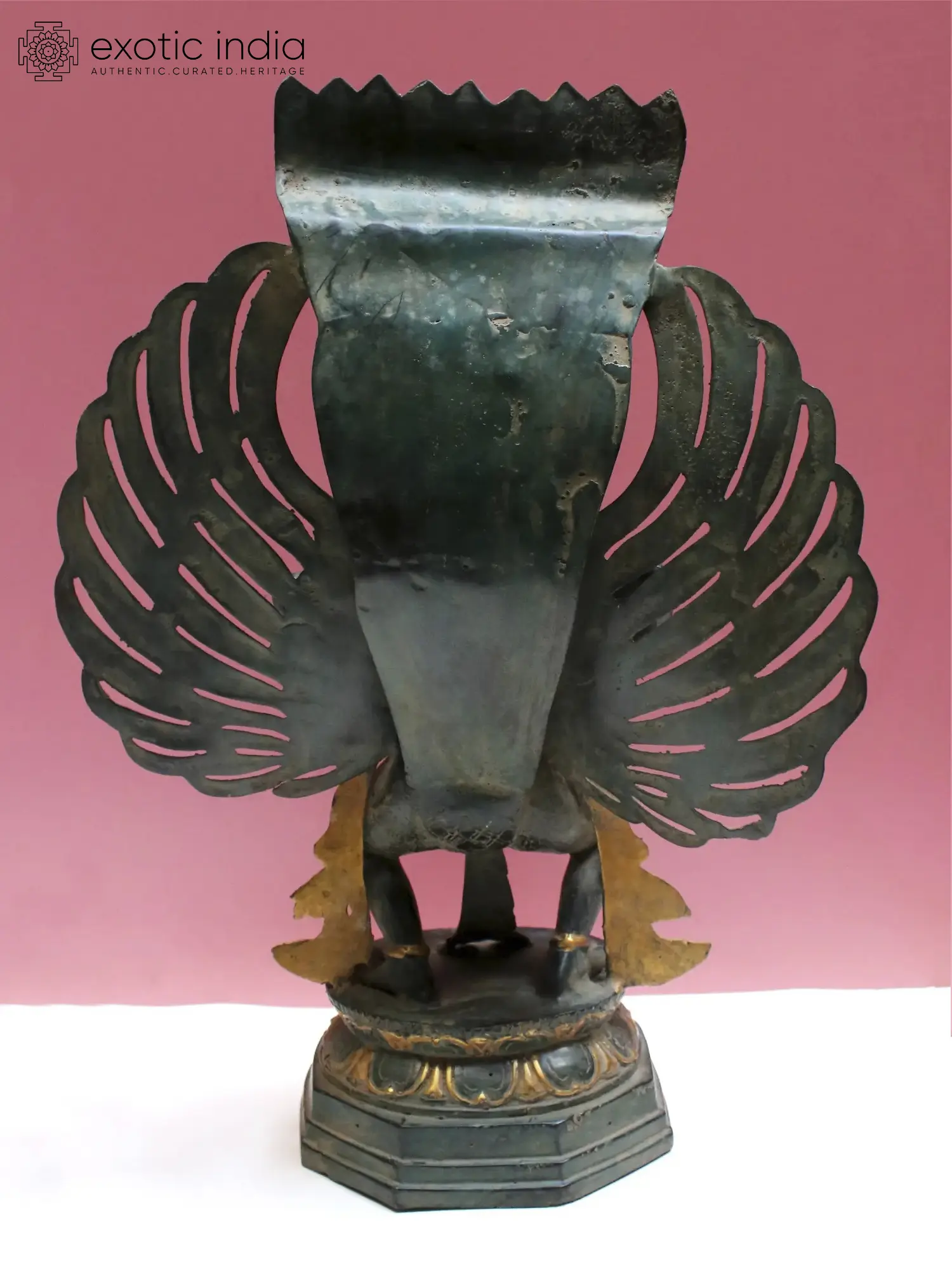From the splendor of the Garuda in Anjali Mudra at the Darbar square of Kathmandu to the bronze gilt images and sculptures of the divine bird, Vishnu’s celestial mount is a popular and powerful presence in Nepalese Hindu culture. A guardian deity and protector of the sacred land, Garuda has a special place in the Newari tradition of the valley. This copper statue from Nepal presents the characteristic form of the bird, as the mount or asana of Sri Vishnu, the protector of the cosmos.