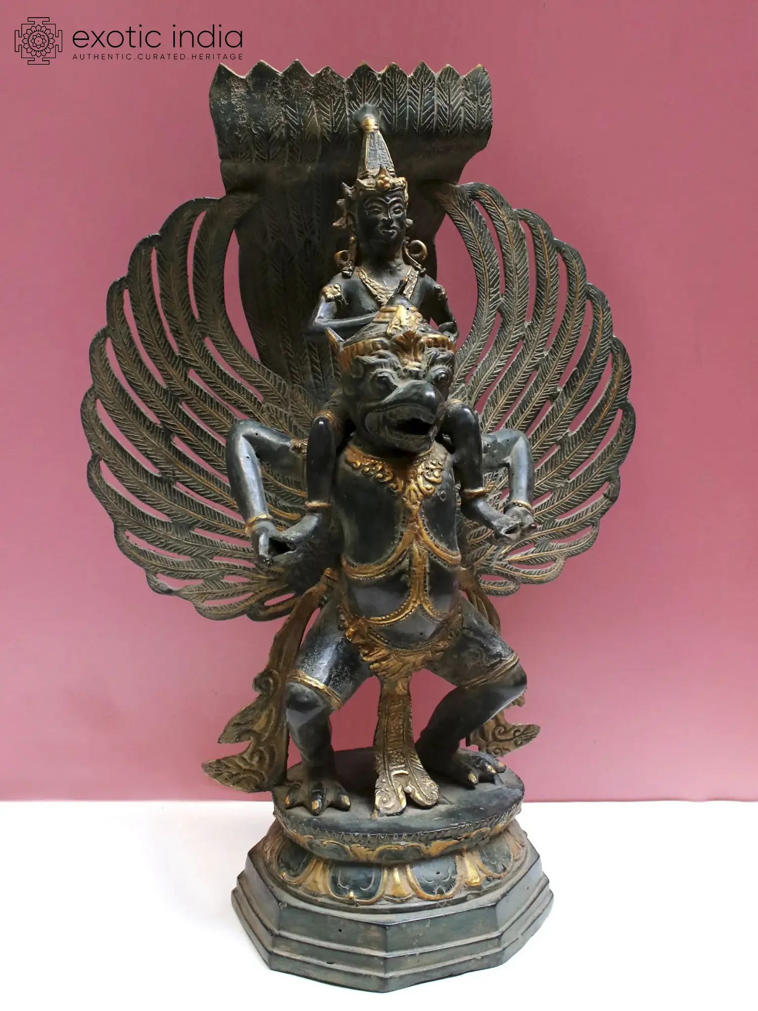 Garuda’s potencies are expressed by the makers of the statue by giving him a large-than-life appearance, with wings swaying on his sides, a gaping beak, large eyes, and a dynamic pose, in which Garuda seems to be readying himself to make a jump. Vishnu, in the traditional Nepalese iconography, is delineated with exquisite details, placed on the shoulders of Garuda, his legs dangling in the front, held by the anthropomorphic bird in his hands, symbolizing his devotion to his Lord.
