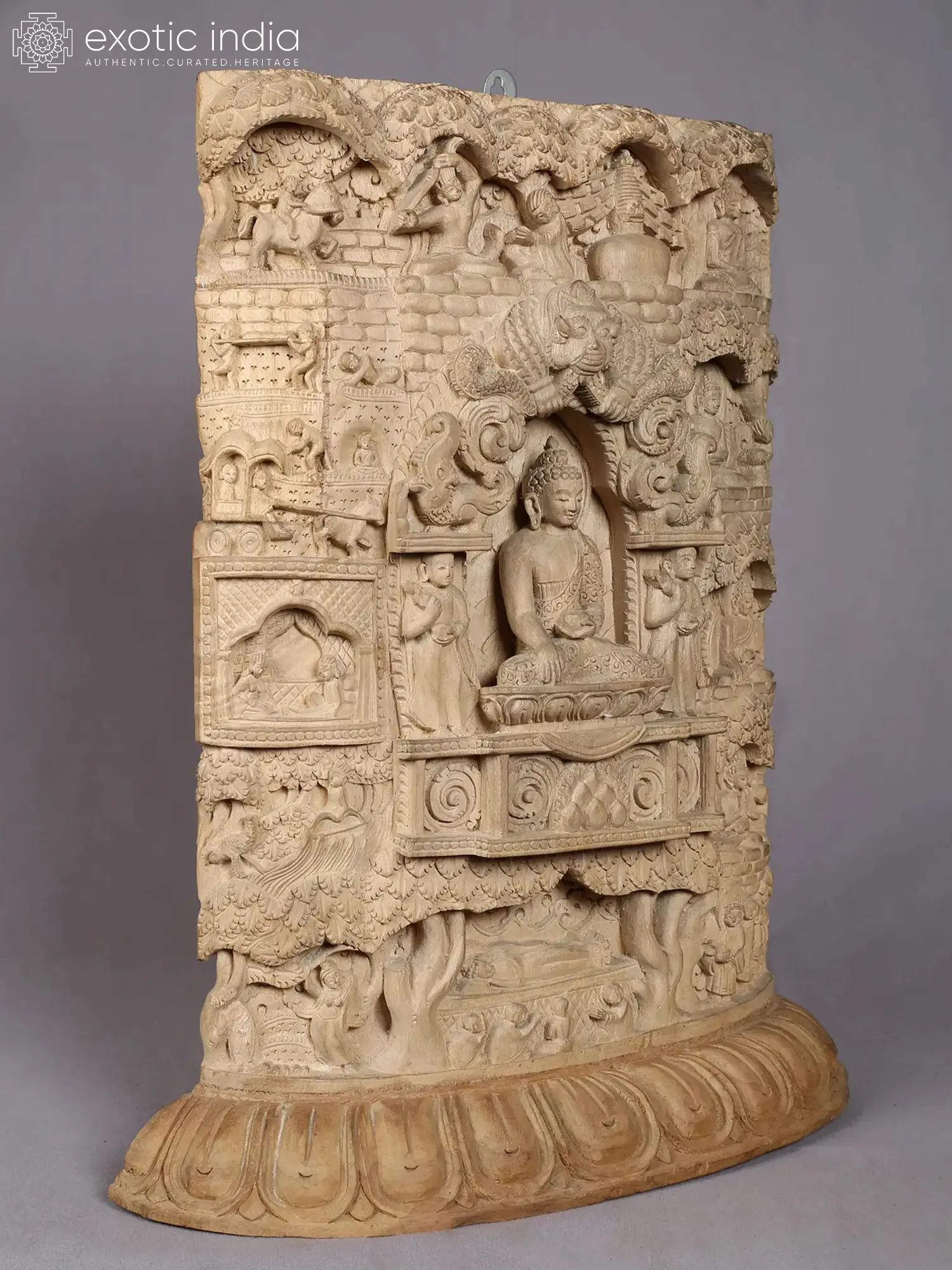 This magnificent wooden sculpture is a profound testament to the life and teachings of Gautama Buddha, the founder of Buddhism. Expertly handcrafted in Nepal, this piece is not merely a decorative object but a devotional artwork that captures the essence of the Buddha's spiritual journey. Each panel and carving tells a story, inviting contemplation and reverence. The intricate detail speaks to the dedication and skill of the artisans, who have brought to life a narrative that has shaped the spiritual landscape for centuries.