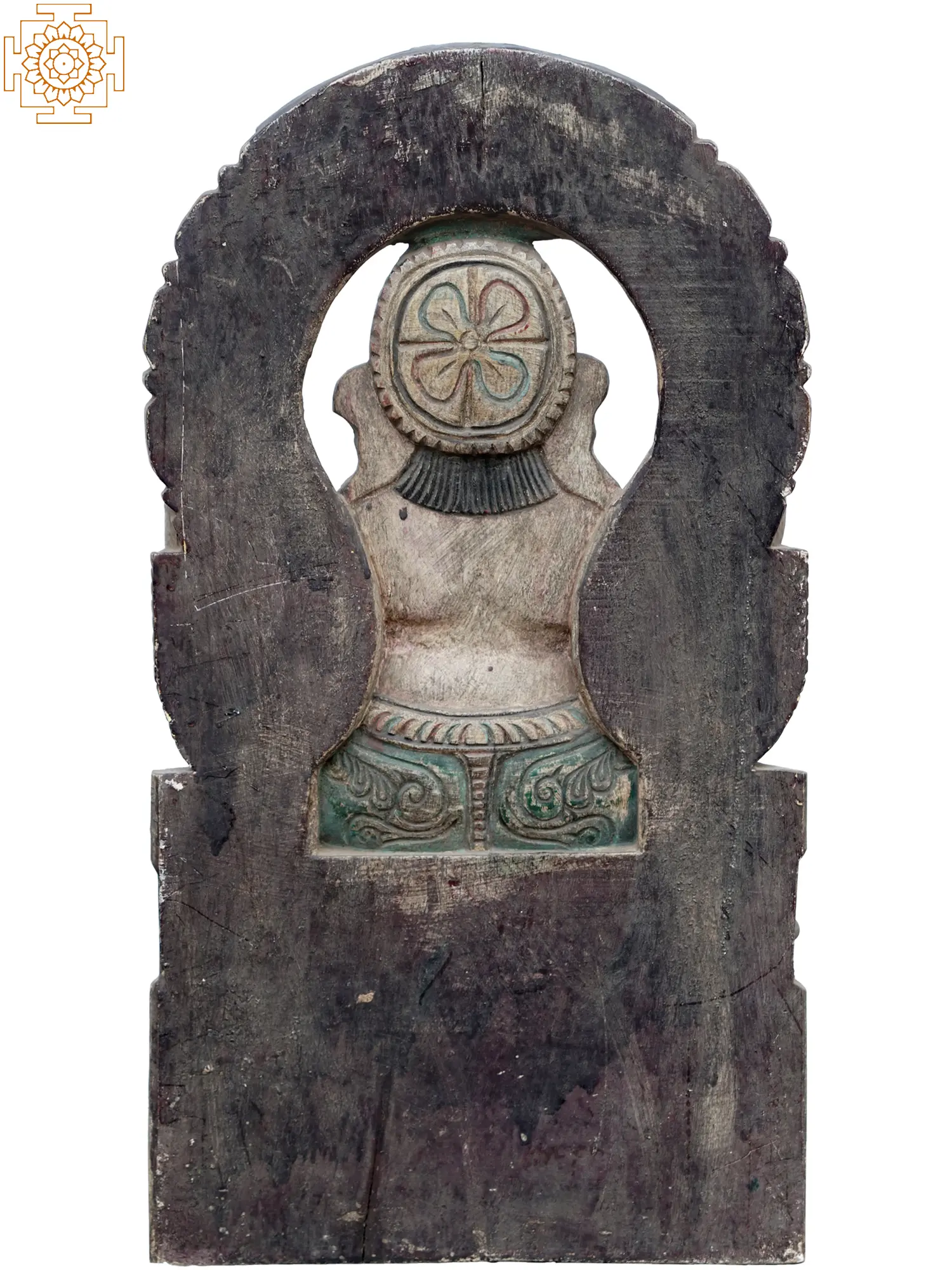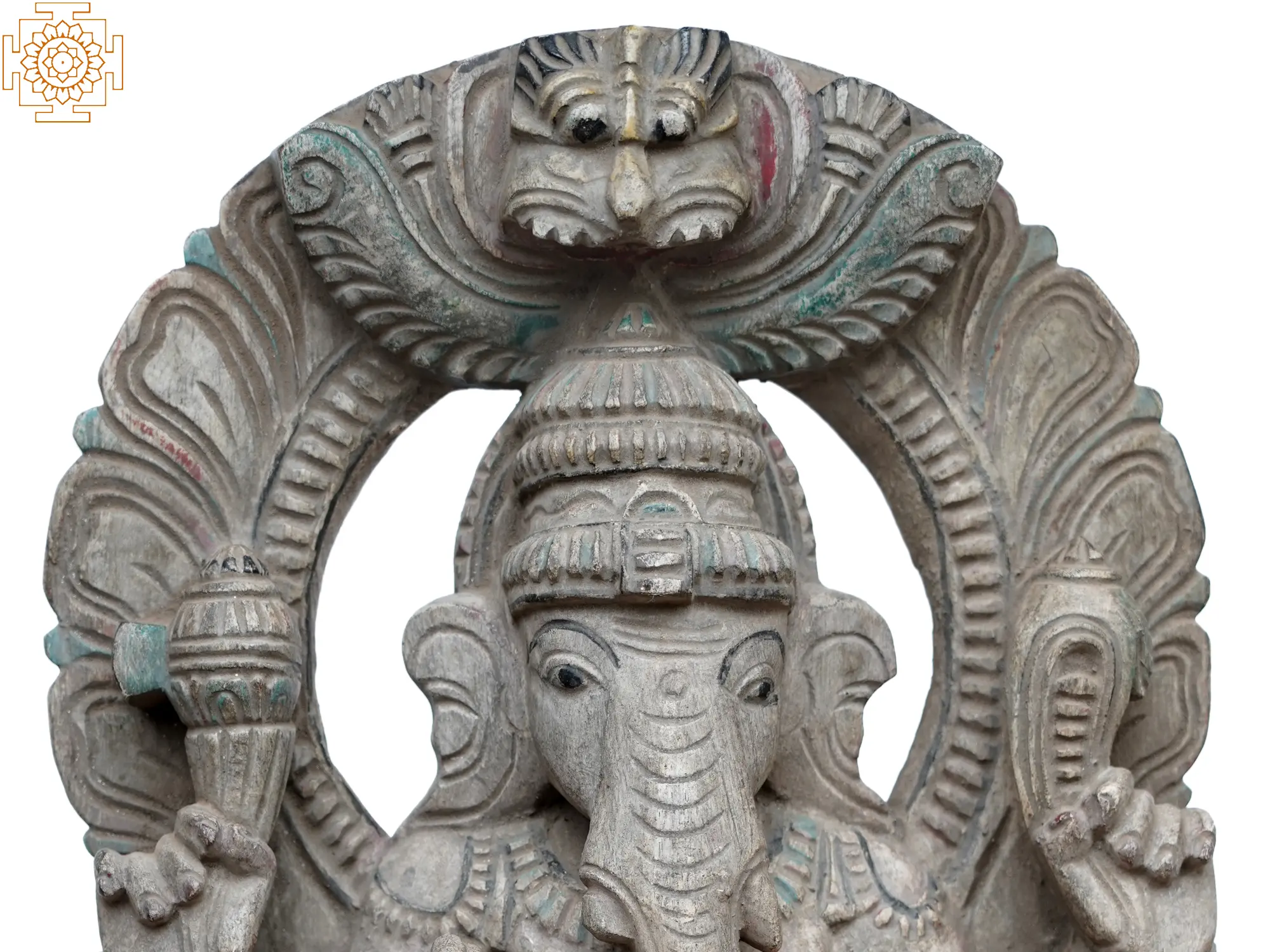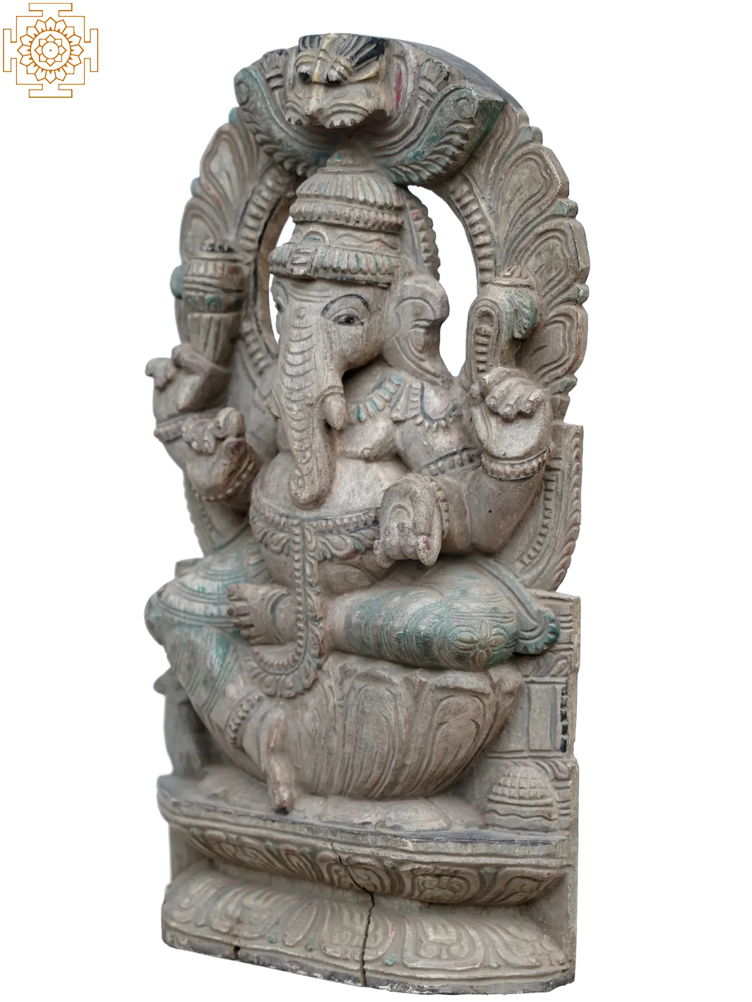 Exuding an old-fashioned charm, displaying the classic skills of Indian shilpis (sculptors), this wooden statue of Ganesha presents the auspicious one in a four-armed Roopa, sitting on a lotus seat, which is a popular throne for divinity in the culture of India. Ganesha holds his characteristic attributes- pasha (noose), Ankush (goad), Danta (his broken tusk), and Modaka in his hands.