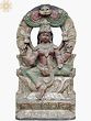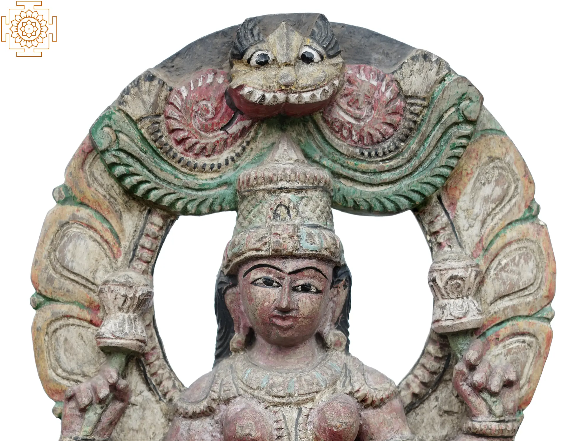 A hint of colors on the wooden surface gives the statue an antique aesthetic quality, which is enhanced by the beautiful Kirtimukha prabhavali around the mother goddess.