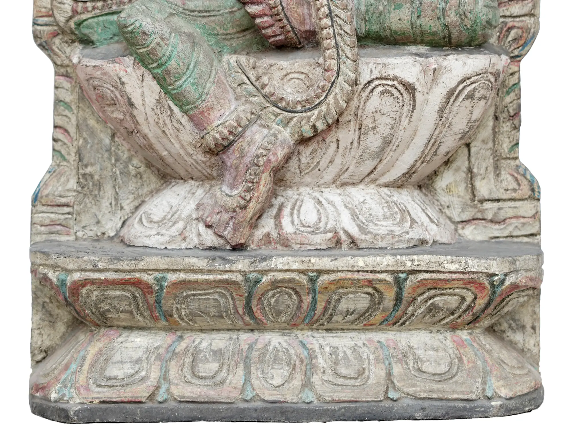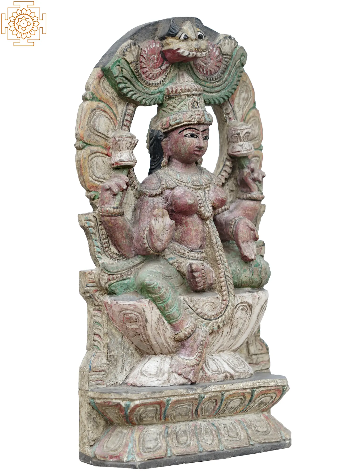 Goddess Lakshmi in Hinduism is the bestower of eternal wealth, who looks after the creation of Brahma as the supreme mother. In this wooden statue, Devi Lakshmi is in her popular chaturbhuja or four-armed form, sitting on a Padmasana or lotus throne, holding two lotuses in her secondary hands and making the gesture or mudra of Abhaya (fearlessness) and Varada (giving boons) with his primary hands.