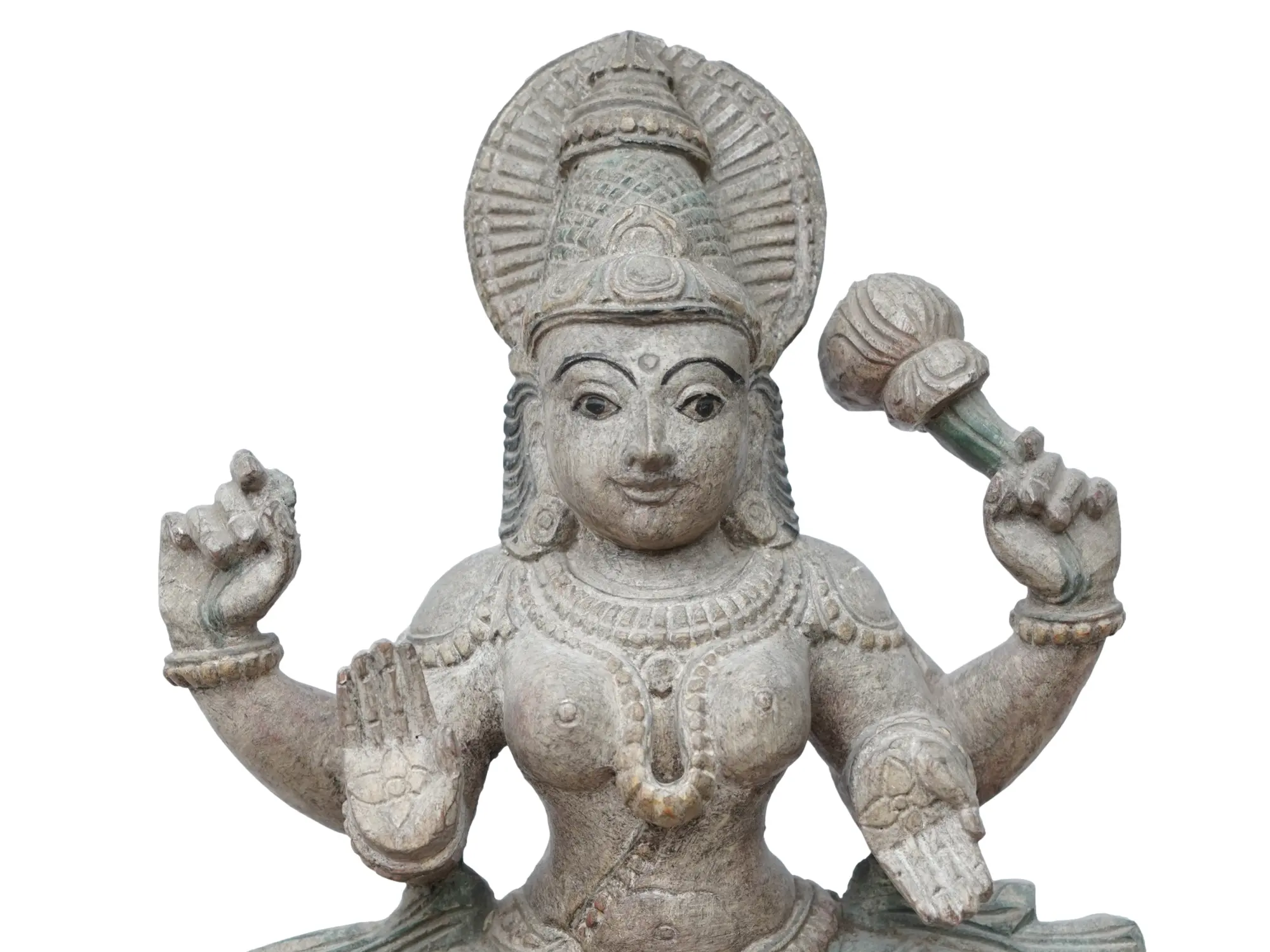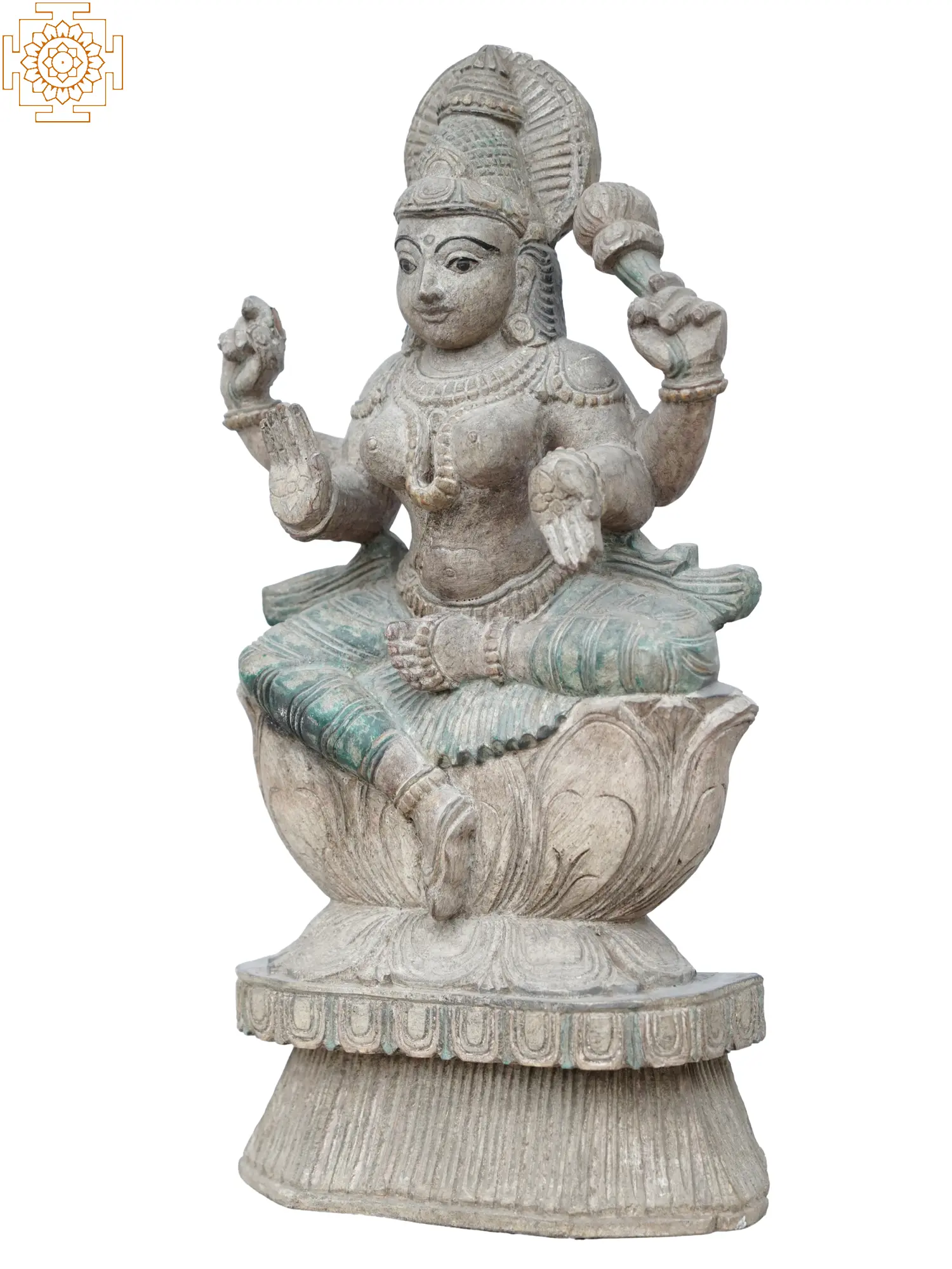 Admire the magnificent wooden figure of Goddess Lakshmi sitting gently on a lotus seat, her heavenly beauty truly radiant. Lakshmi is heavenly elegant and full of abundance; she is the epitome of good fortune, money, and success. Blessings and grace are excused by her peaceful countenance and bright radiance, while the lotus represents enlightenment and purity. created with great attention to detail, vengeance, and illumination.