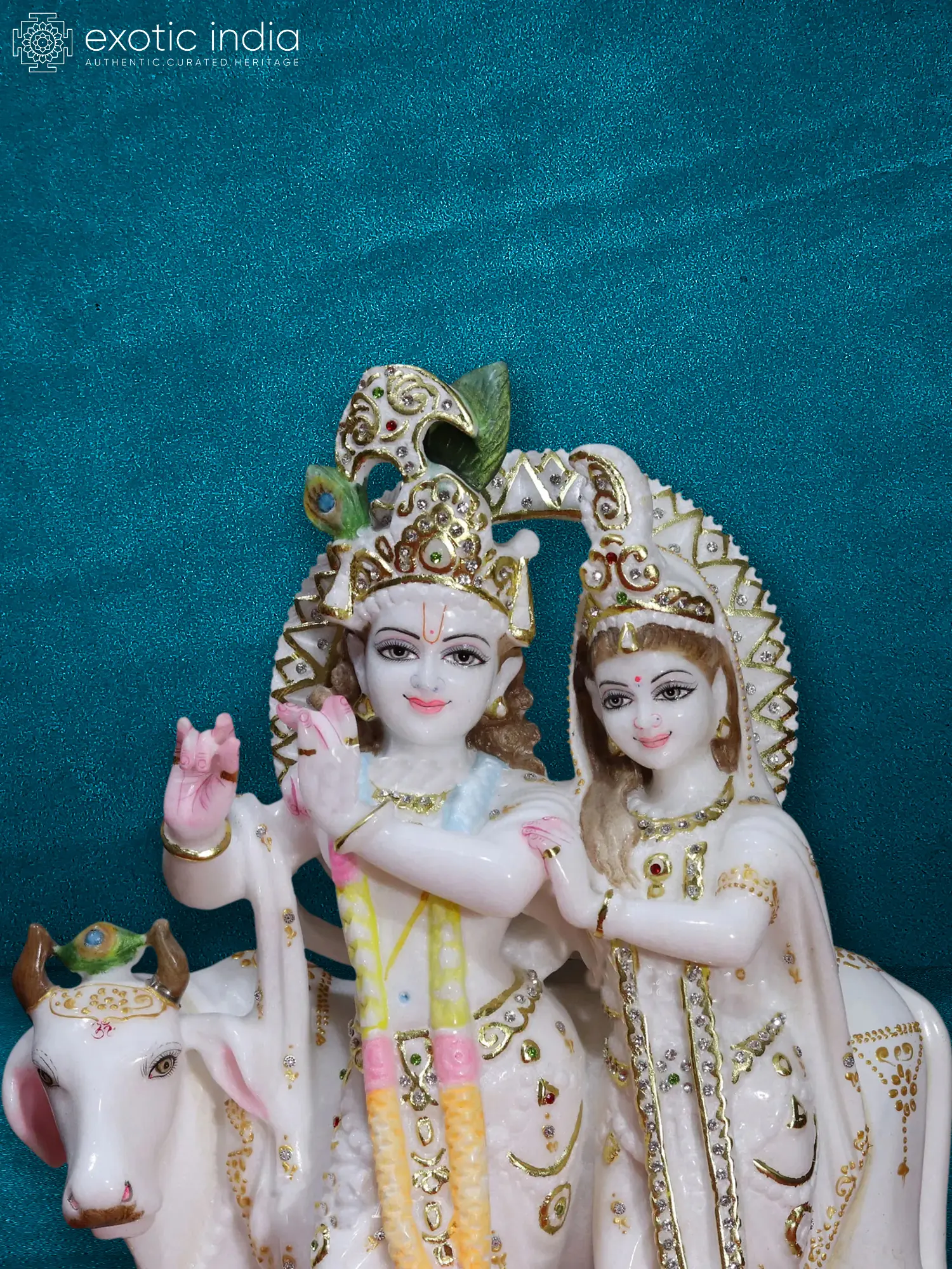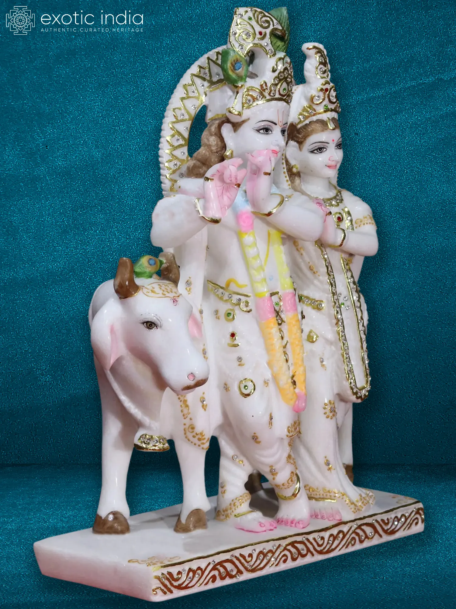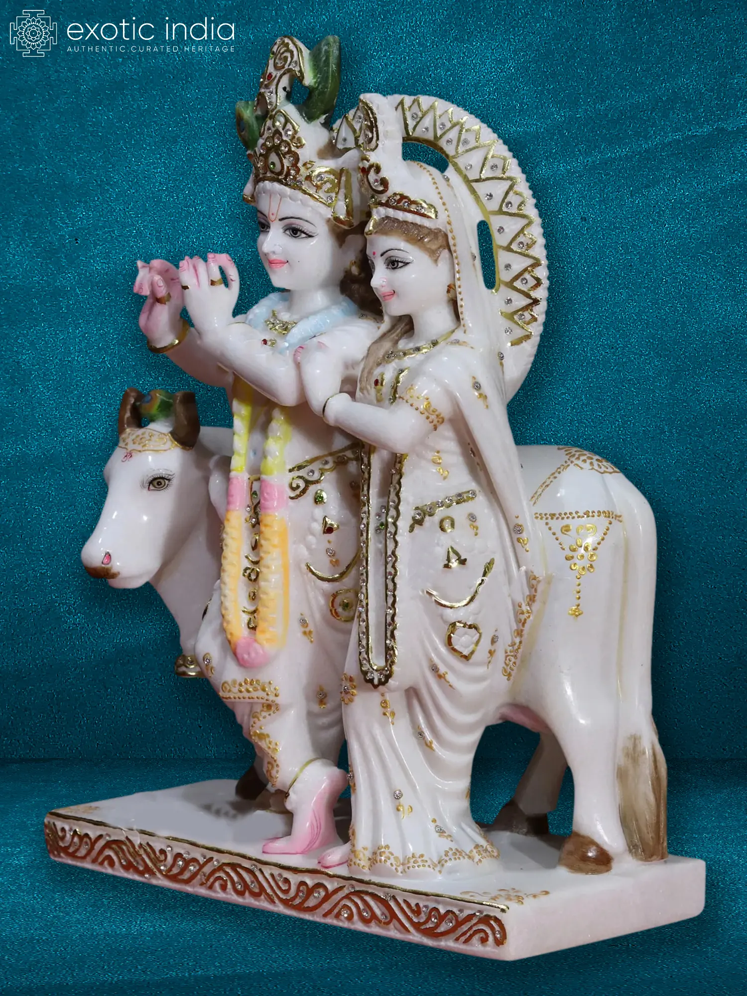 This exquisite 18-inch sculpture captures the divine essence of Radha and Krishna, the iconic lovers from Hindu mythology, as they ride their faithful holy cow. Crafted from pristine Super White Makrana marble, renowned for its luminous quality, this piece is a testament to both artistry and devotion. The detail is breathtaking; each delicate feature, from Krishna's flute to Radha's radiant smile, is meticulously rendered. The flowing drapery, adorned with subtle gold accents and sparkling crystal embellishments, adds a touch of opulence. The holy cow, a symbol of purity and devotion in Hinduism, stands majestically beside the couple, completing the enchanting scene.