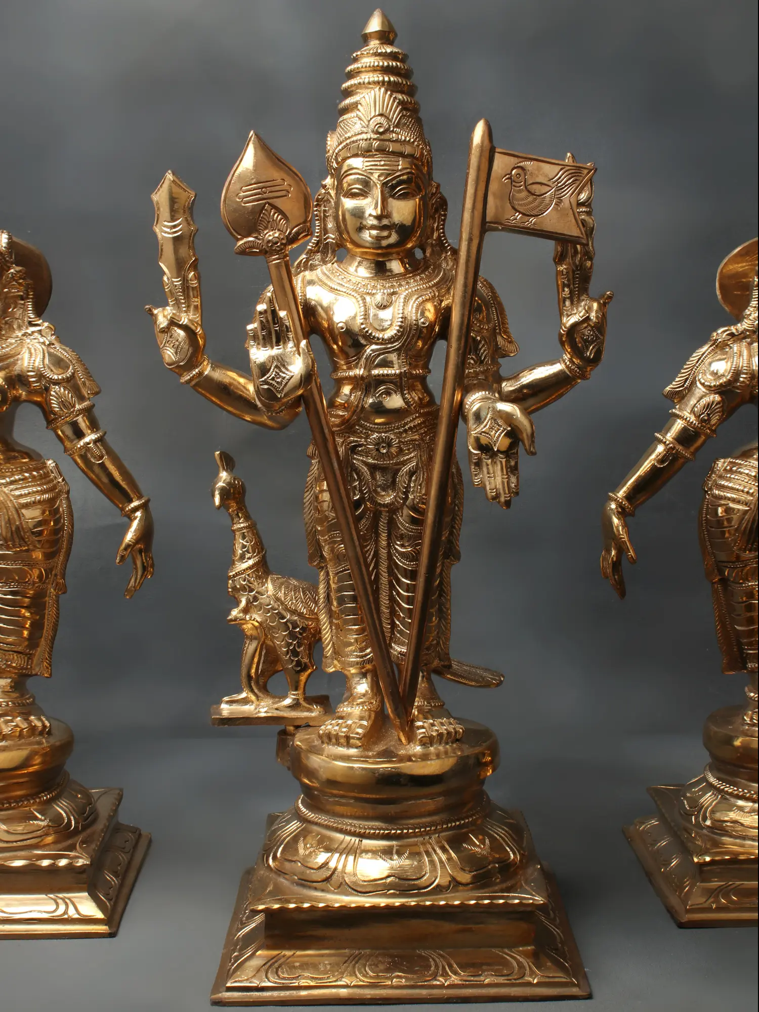 In this artwork of Panchaloha bronze, Lord Karttikeya, “the Commander of the Devas”, stands atop a lotus pedestal with an aura of transcendence. Clad in majestic attire, Lord Karttikeya wields the Soola Kathi (A Diamond-Shaped Spear) and Trishul (The powerful Trident), exuding a harmonious blend of power and grace. The “Sakthi Vel”, bearing the sacred Tamil OM, resonates with cosmic vibrations. His Flag, “Seval Kodi” weaves a narrative of his cosmic authority. With “Abhaya Mudra”, his right hand bestows reassurance, while the left, in “Varada Mudra”, imparts benevolence.