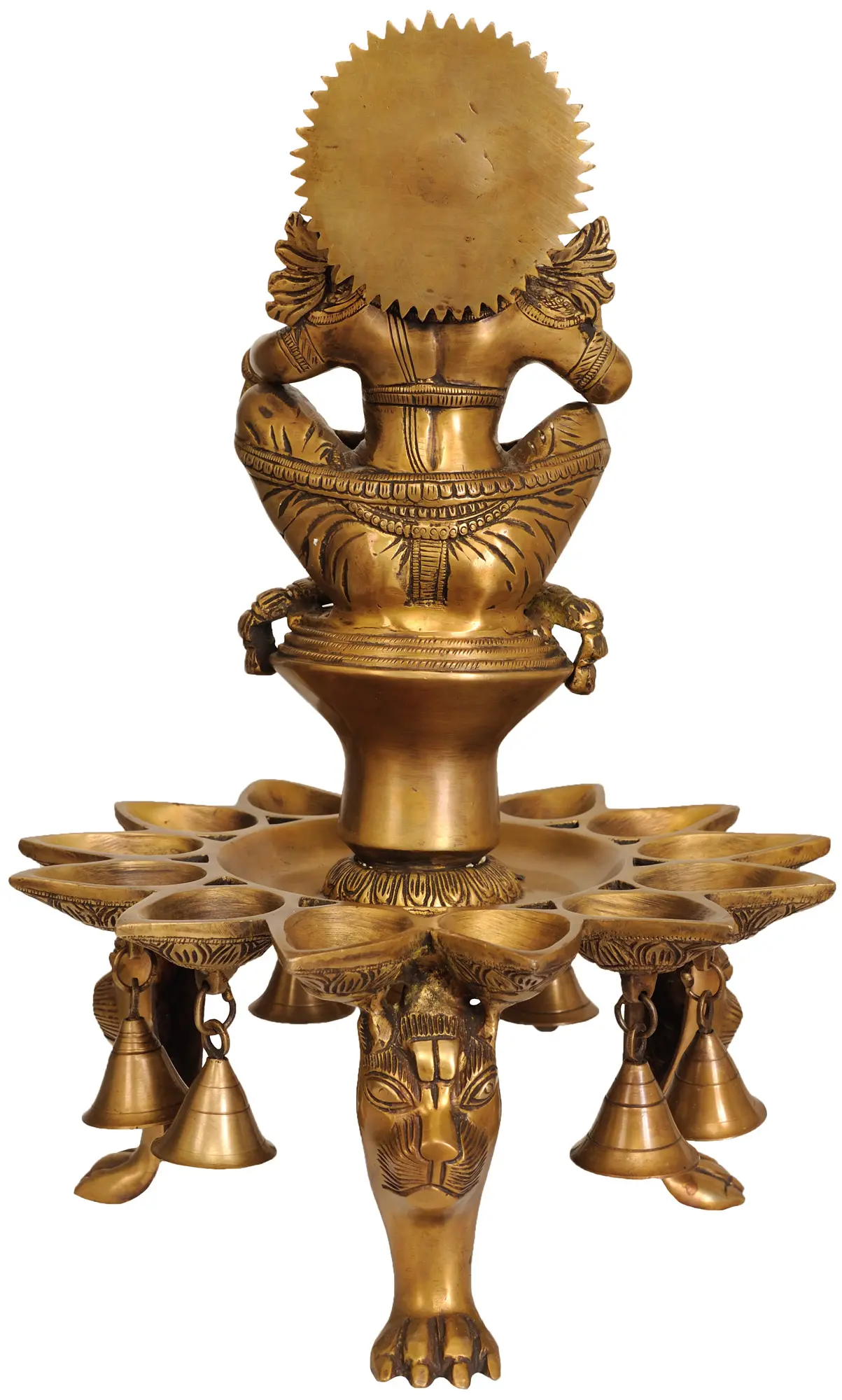 Further enhancing its aesthetic and spiritual appeal are the elegantly crafted lion head legs. The lion is a symbol of power, courage, and royalty, often associated with divine beings and their authority. The presence of these majestic lion heads grounds the lamp, adding an element of regal strength and protective energy. Hanging from the base are finely tuned brass bells. The sound of bells in Hindu rituals is considered auspicious, believed to ward off evil spirits, awaken deities, and create a harmonious atmosphere conducive to prayer and meditation. The gentle chime of these bells will add a melodious dimension to your spiritual practice.