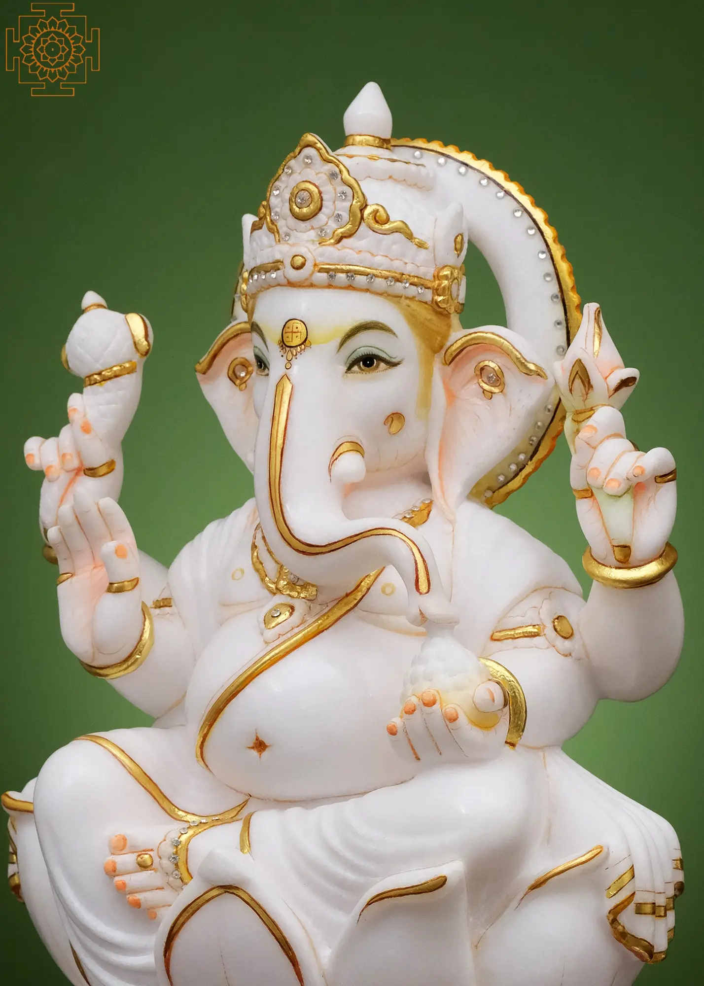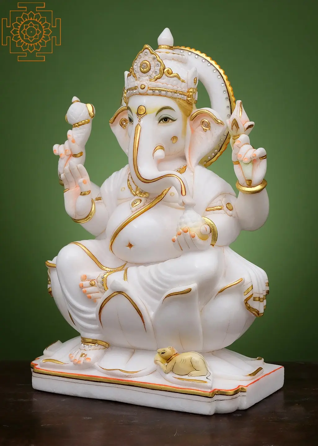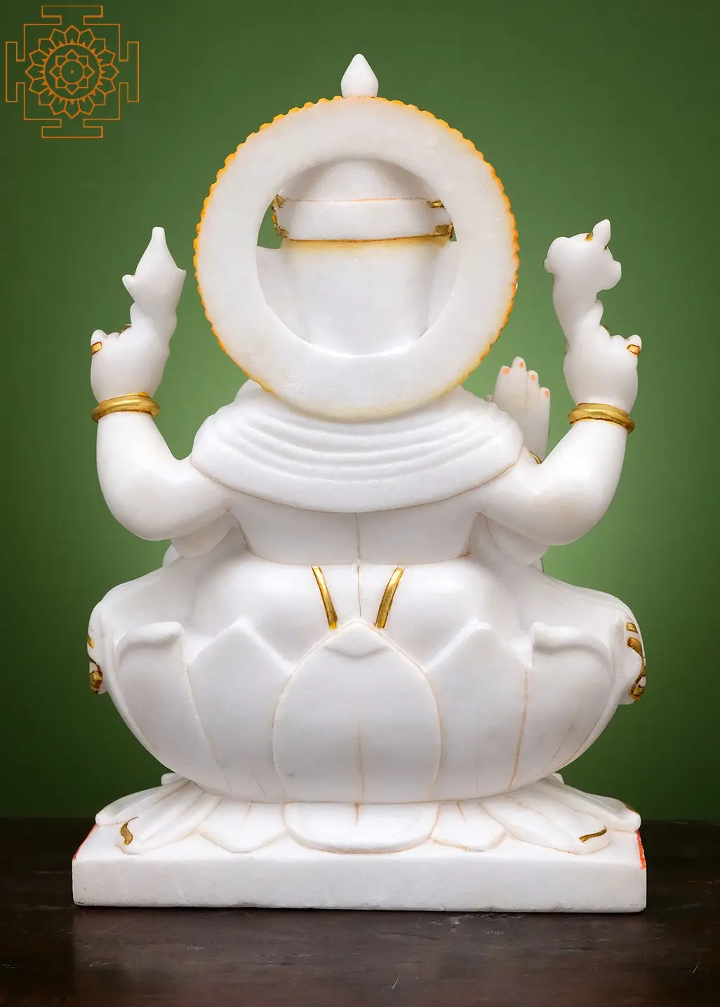 18" Lord Ganesha Seated on Lotus | Handmade | White Marble Ganesh Statue | Ganpati Statue | Ganesh Sculpture