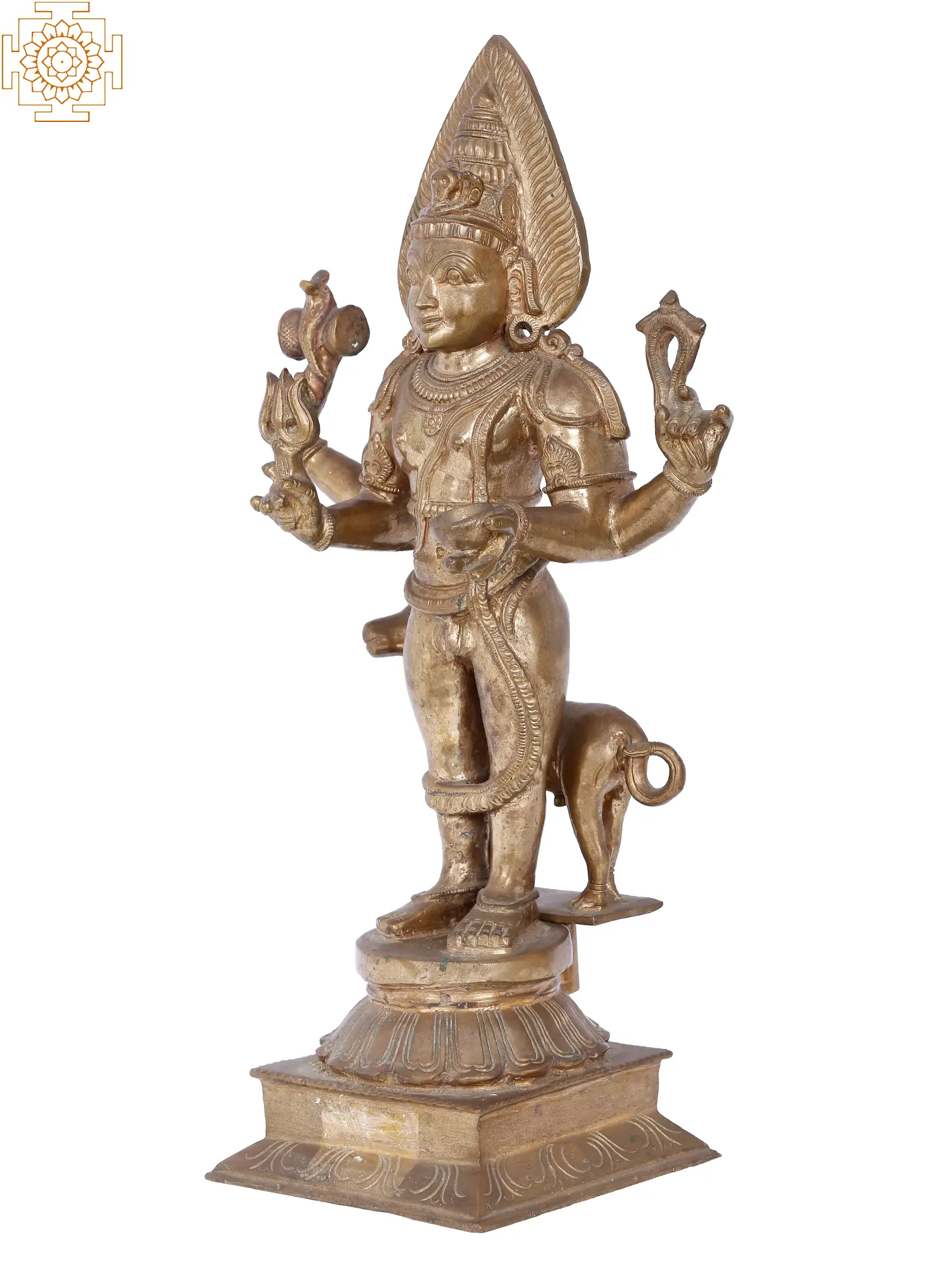 This exquisite bronze statue depicts Lord Shiva in his fierce and protective form as Bhairava. Standing at an imposing height, this magnificent piece is crafted using the ancient Madhuchista Vidhana, or lost-wax, casting technique by master artisans in Swamimalai, a region renowned for its sculptural heritage. The Panchaloha alloy, a sacred blend of five metals, lends this deity a timeless patina and a profound spiritual resonance.