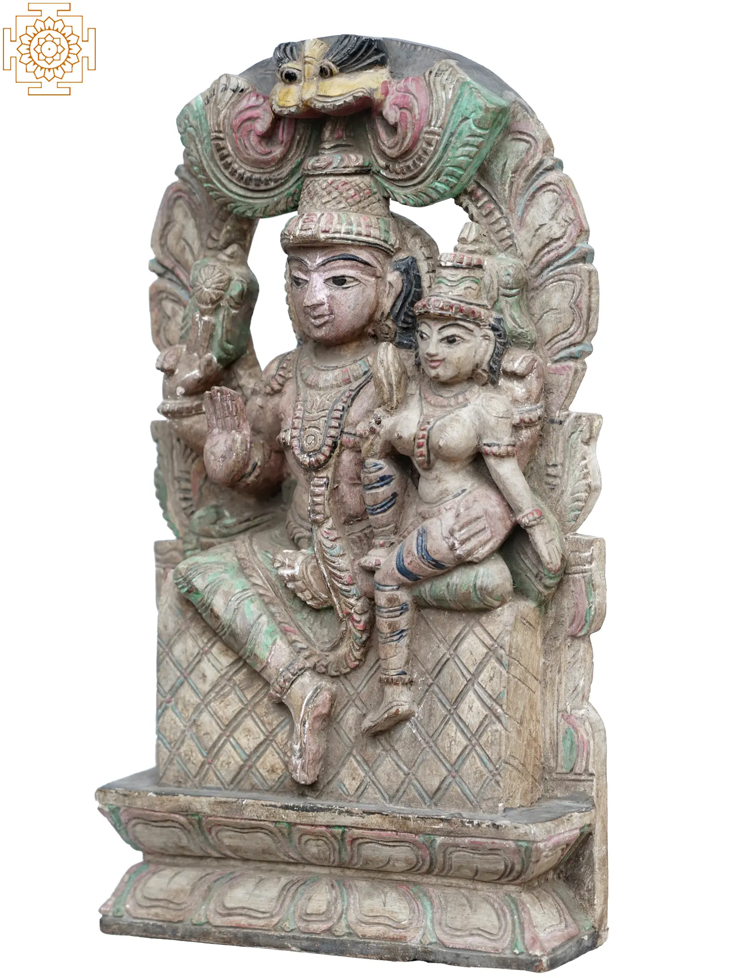 Sri and Sripati (Vishnu with Lakshmi) is an auspicious vision in Hindu culture, the coming together of the nurturing powers of Paalankarta Vishnu and his Shakti, Devi Lakshmi. This wooden statue of Vishnu and Lakshmi presents the divine duo sitting on a throne placed on a lotus base. Sri Vishnu appears in his four-armed form, carrying Devi Lakshmi in his lap.