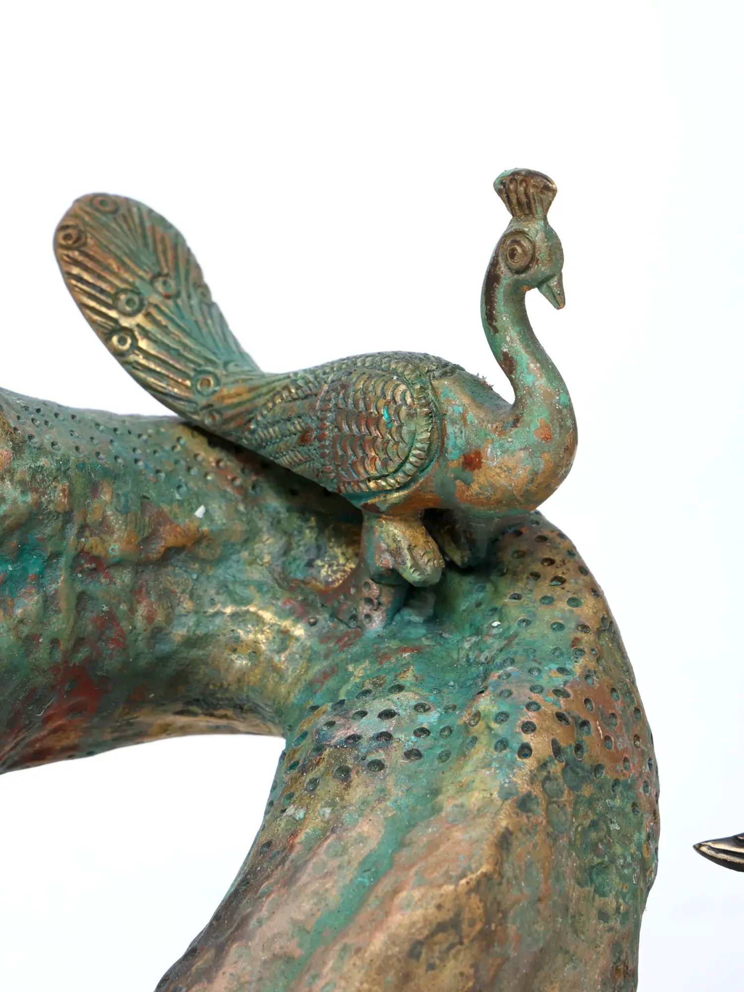 The statue is masterfully crafted from brass, with an antique finish that enhances its timeless appeal. Each detail, from the intricate folds of Radha's attire to the delicate features of Krishna’s face and the lifelike representation of the Kadamba tree's leaves and branches, reflects exceptional artistry. The aged patina adds depth and texture, making the piece look as though it has been treasured for generations. Two peacocks, revered birds in Indian culture often associated with beauty, grace, and divine messengers, are featured alongside the lovers, further enriching the symbolic narrative. Their presence underscores the divine nature of this profound relationship. This is not just a decorative piece, but a work of art that embodies a rich cultural heritage.