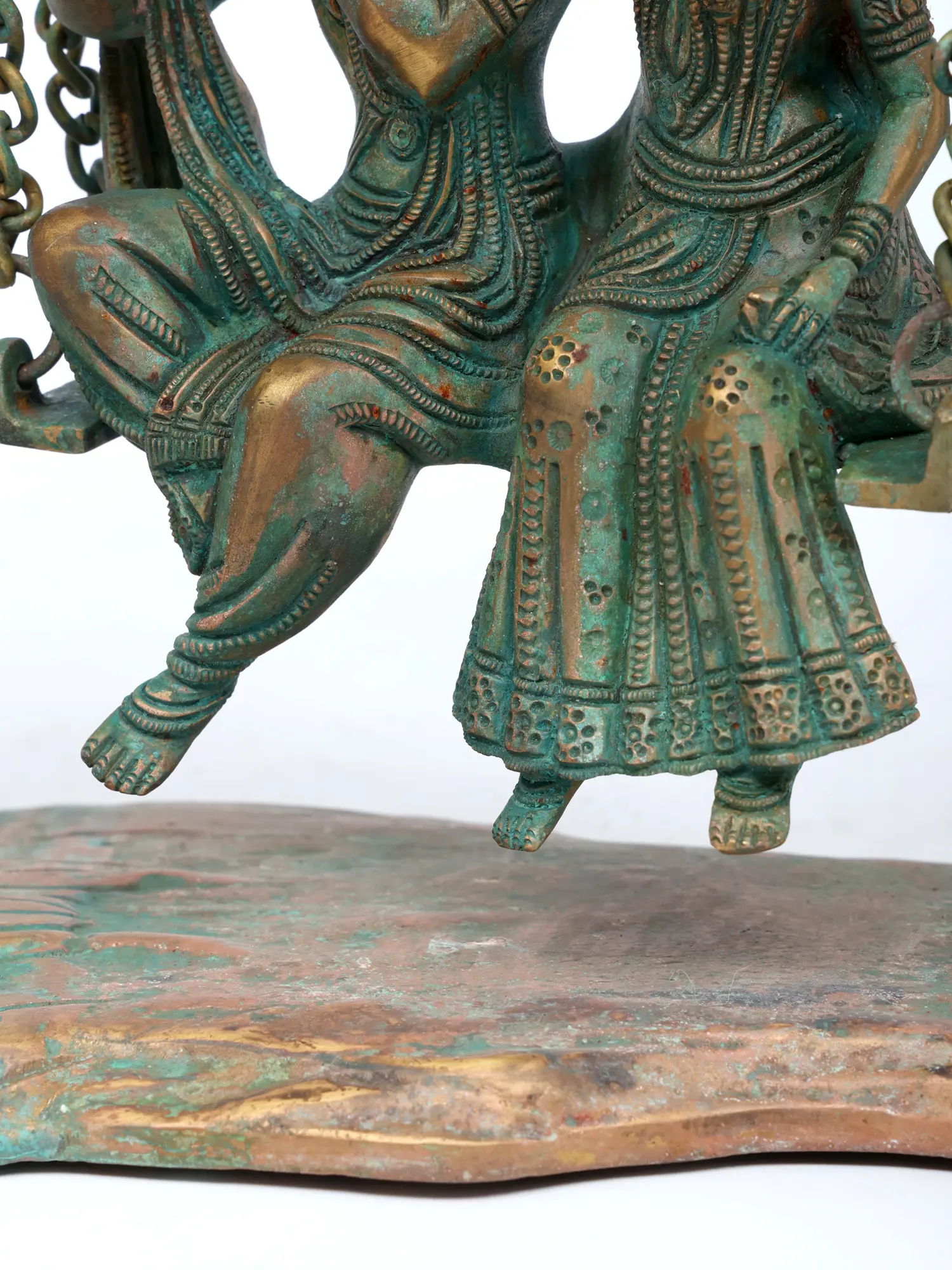 This exquisite 18-inch brass statue captures the enchanting love story of Radha and Krishna, depicted in a scene of idyllic romance. The meticulously crafted figures of Radha and Krishna are shown seated together on a swing suspended from the branches of a Kadamba tree – a tree deeply significant in Hindu mythology, often associated with Krishna’s playful pastimes and divine love. The Kadamba tree, with its vibrant blossoms and sweet fragrance, is believed to be a sacred abode for Krishna, and its presence in this artwork amplifies the spiritual aura of the piece.