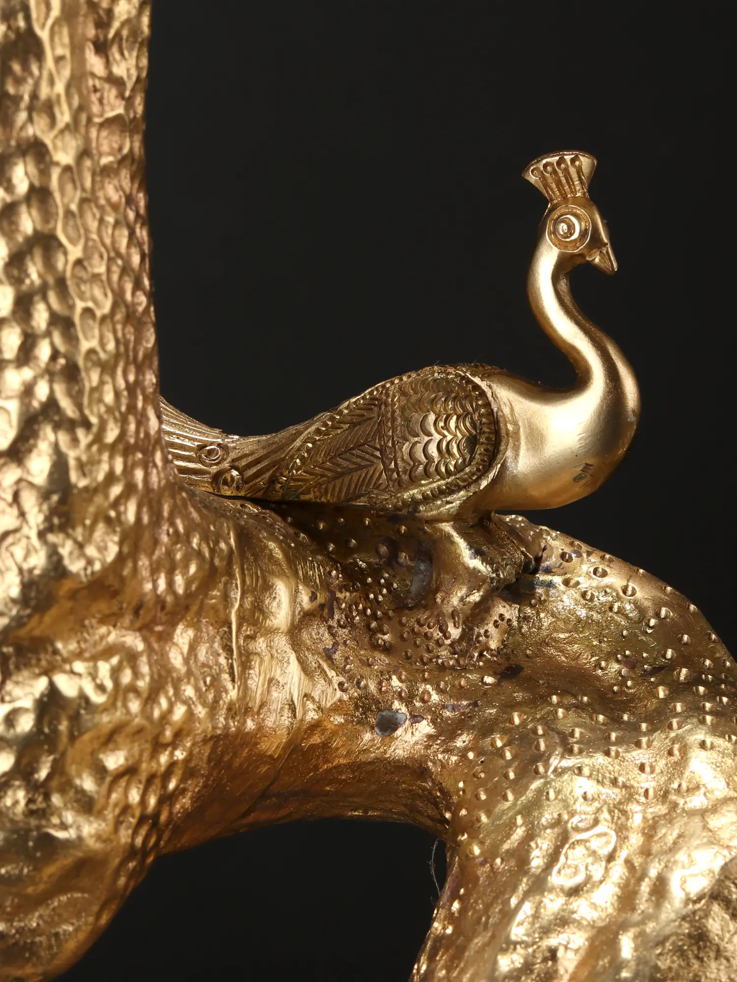 The statue is masterfully crafted from brass, with an antique finish that enhances its timeless appeal. Each detail, from the intricate folds of Radha's attire to the delicate features of Krishna’s face and the lifelike representation of the Kadamba tree's leaves and branches, reflects exceptional artistry. The aged patina adds depth and texture, making the piece look as though it has been treasured for generations. Two peacocks, revered birds in Indian culture often associated with beauty, grace, and divine messengers, are featured alongside the lovers, further enriching the symbolic narrative. Their presence underscores the divine nature of this profound relationship. This is not just a decorative piece, but a work of art that embodies a rich cultural heritage.