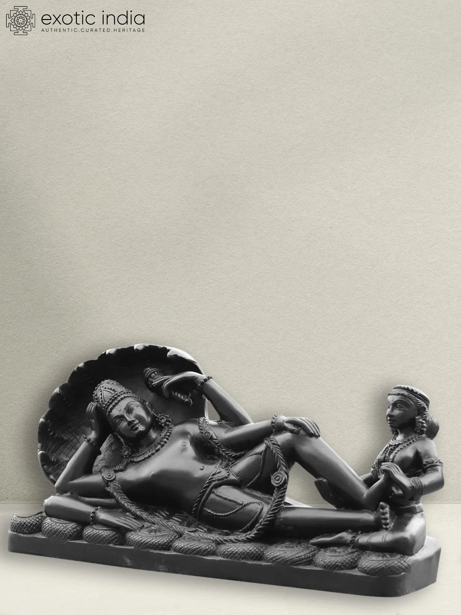Carved from the distinctive Rajasthan black marble, this statue possesses a unique gravitas and timeless beauty. The deep, lustrous black of the marble lends a profound sense of mystery and ancient wisdom to the sculpture. Rajasthan is renowned for its rich artistic heritage, and the artisans of this region have a centuries-old tradition of working with marble to create masterpieces. The smooth, polished finish of the stone enhances the subtle contours of Vishnu's form and the intricate details of Sheshnag's scales and hoods. The precision of the carving, from the delicate ornamentation adorning Vishnu to the majestic spread of Sheshnag's heads forming a protective canopy, speaks to the skill and devotion of the craftspeople. This material choice imbues the piece with a connection to the earth while representing the ethereal qualities of the divine. ––––––––––––––––––––