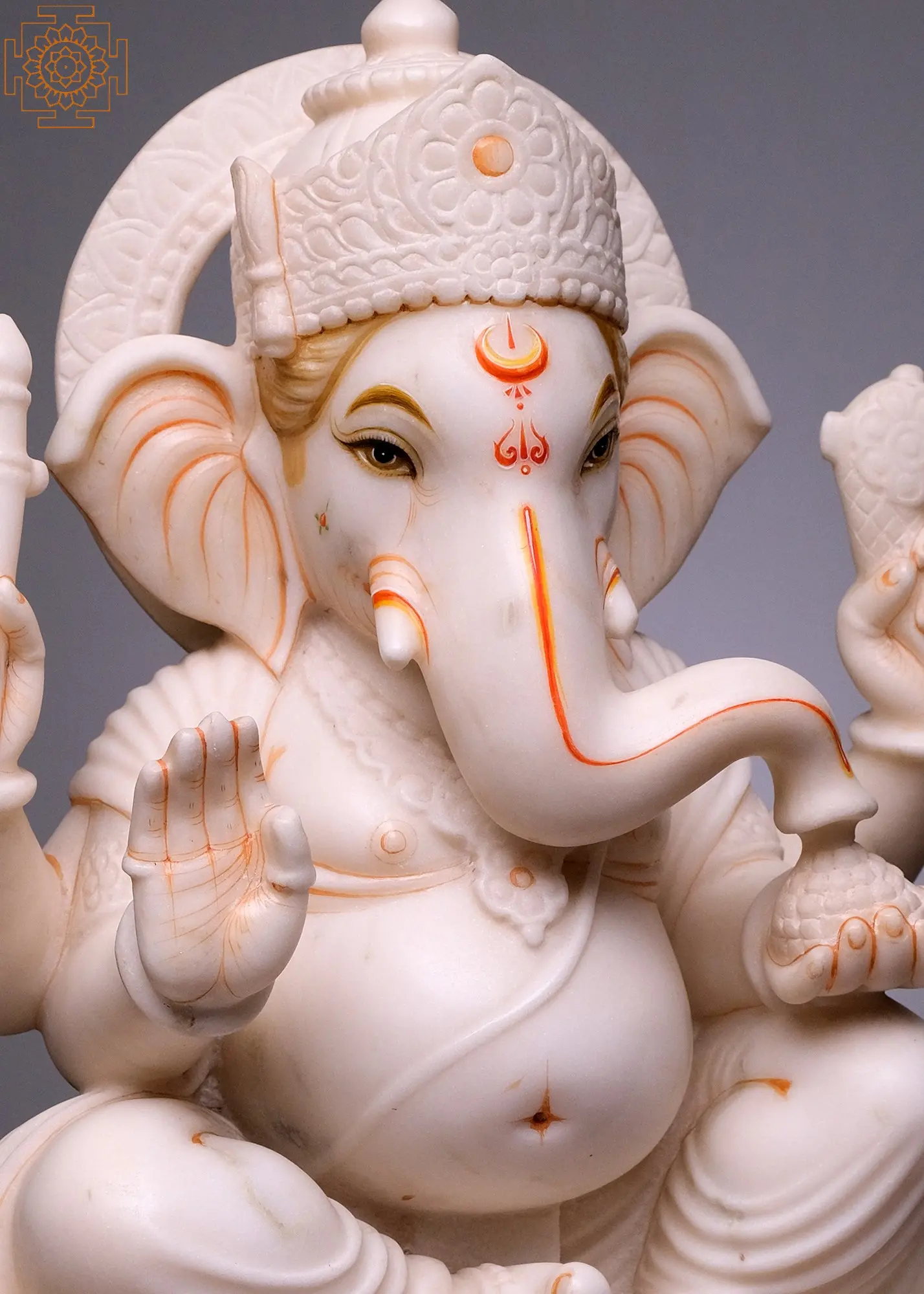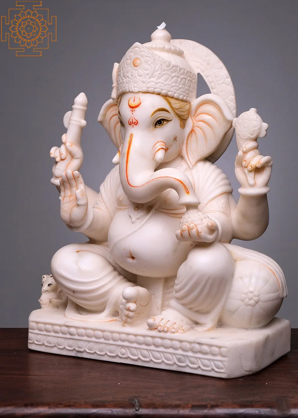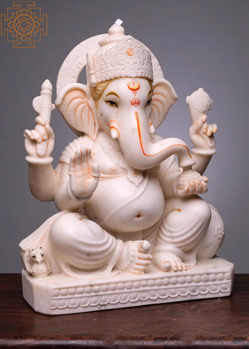 Crafted from high-quality white marble, this statue is a testament to the enduring beauty and artistry of traditional Indian sculpture. The smooth, cool surface of the marble enhances the divine aura of the deity, while the subtle detailing in orange and gold accents, especially on his forehead, eyes, and ears, adds a touch of warmth and vibrancy. The figure is adorned with traditional ornaments, and his multiple arms, a characteristic depiction of Ganesha, hold symbolic objects, each representing a different aspect of his divine power. The serene expression on his face invites peace and auspiciousness into any space. The inclusion of his vahana, the mouse, subtly placed near his feet, adds another layer of traditional iconography, representing his control over desires and his humble nature. This piece is not merely a decorative item but a sacred object, designed to bring blessings, wisdom, and good fortune to its owner.