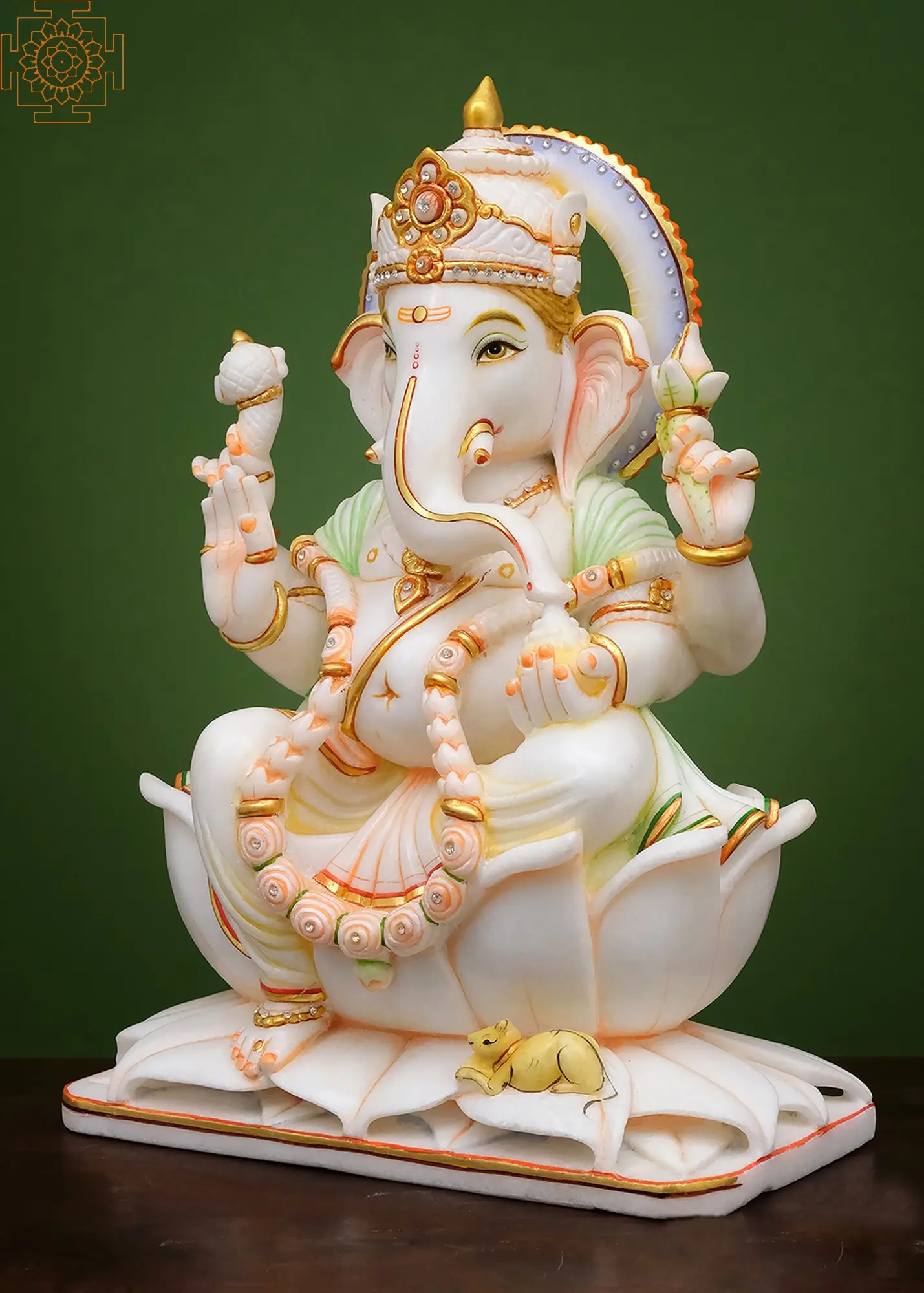 Each detail of this statue is a testament to the skill and dedication of our artisans. The smooth, cool touch of the white marble is enhanced by delicate gold accents and vibrant detailing, bringing the divine form to life. The serene expression, the subtle curves of his trunk, and the gentle posture all speak of his immense wisdom and compassion. The lotus upon which he is seated symbolizes purity, fertility, and the potential for spiritual growth, mirroring the divine essence of Ganesha himself. The inclusion of his vehicle, the mouse (Mushika), represents his mastery over earthly desires and his ability to navigate the smallest of paths to achieve his goals.