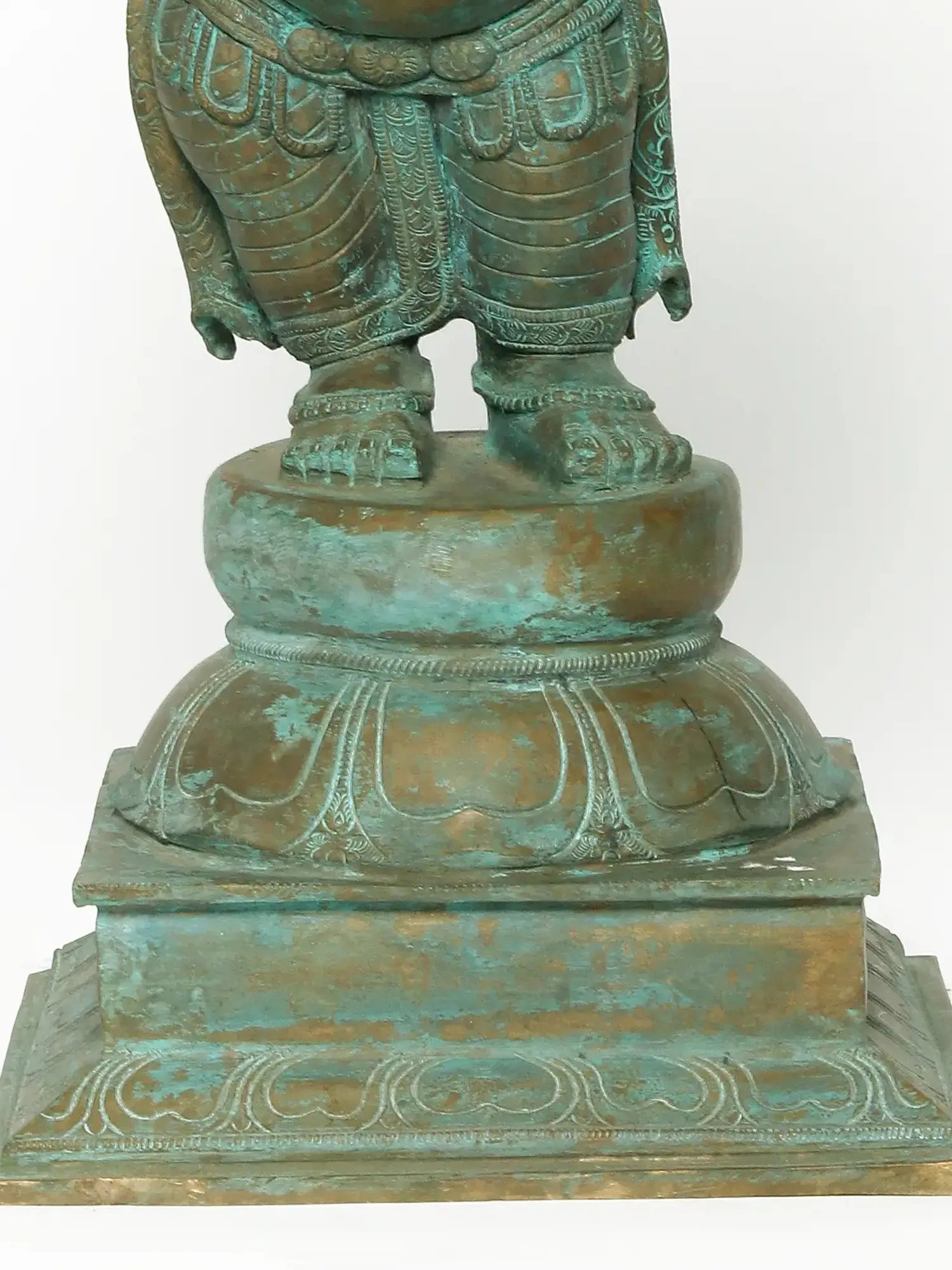 This 18-inch standing Chaturbhuja Lord Ganesha bronze statue is a breathtaking masterpiece, meticulously crafted to capture the essence of this beloved Hindu deity. The rich, deep patina of the bronze, achieved through traditional methods, lends an air of antiquity and reverence, making it a stunning addition to any home or sacred space. Ganesha, the elephant-headed god, is revered as the remover of obstacles, the patron of arts and sciences, and the bringer of good fortune. His image evokes feelings of joy, prosperity, and wisdom. This particular depiction showcases Ganesha in his Chaturbhuja form – possessing four arms – each holding a symbolic object that further enhances his divine attributes. The intricate details of his attire, jewelry, and the serene yet powerful expression on his face are testaments to the skill and dedication of the artisans. The statue stands on a substantial, ornately carved base, adding to its overall majestic presence. The weight and feel of the bronze, a testament to its quality, inspire a profound sense of connection to the artistry and spirituality inherent within.