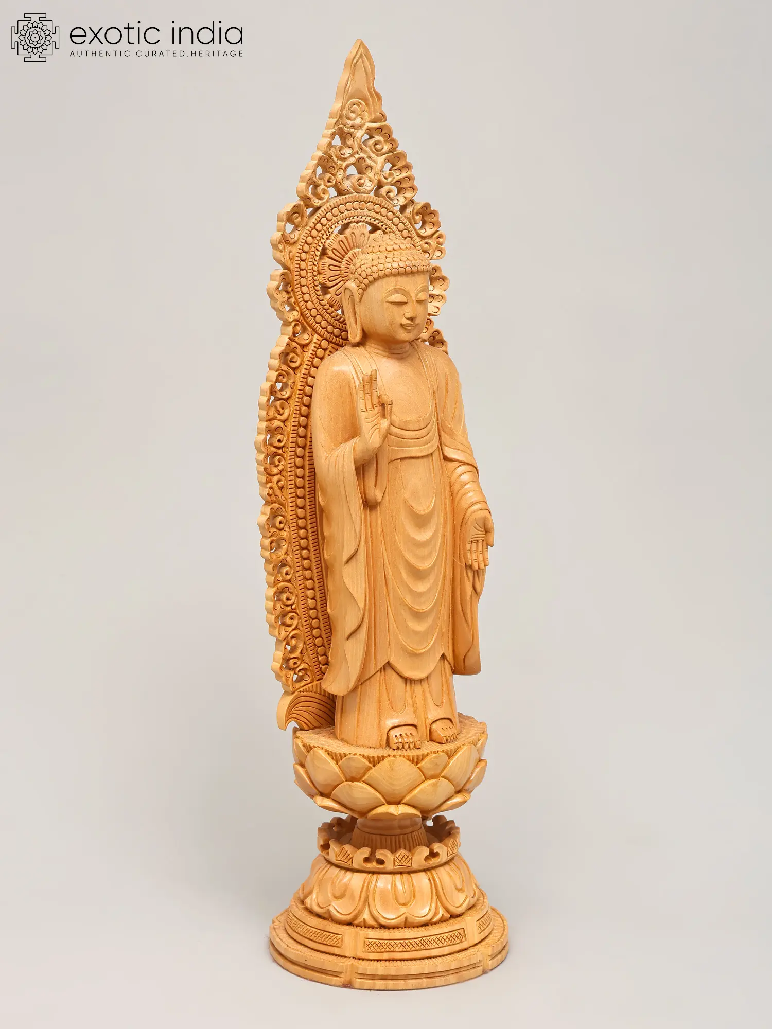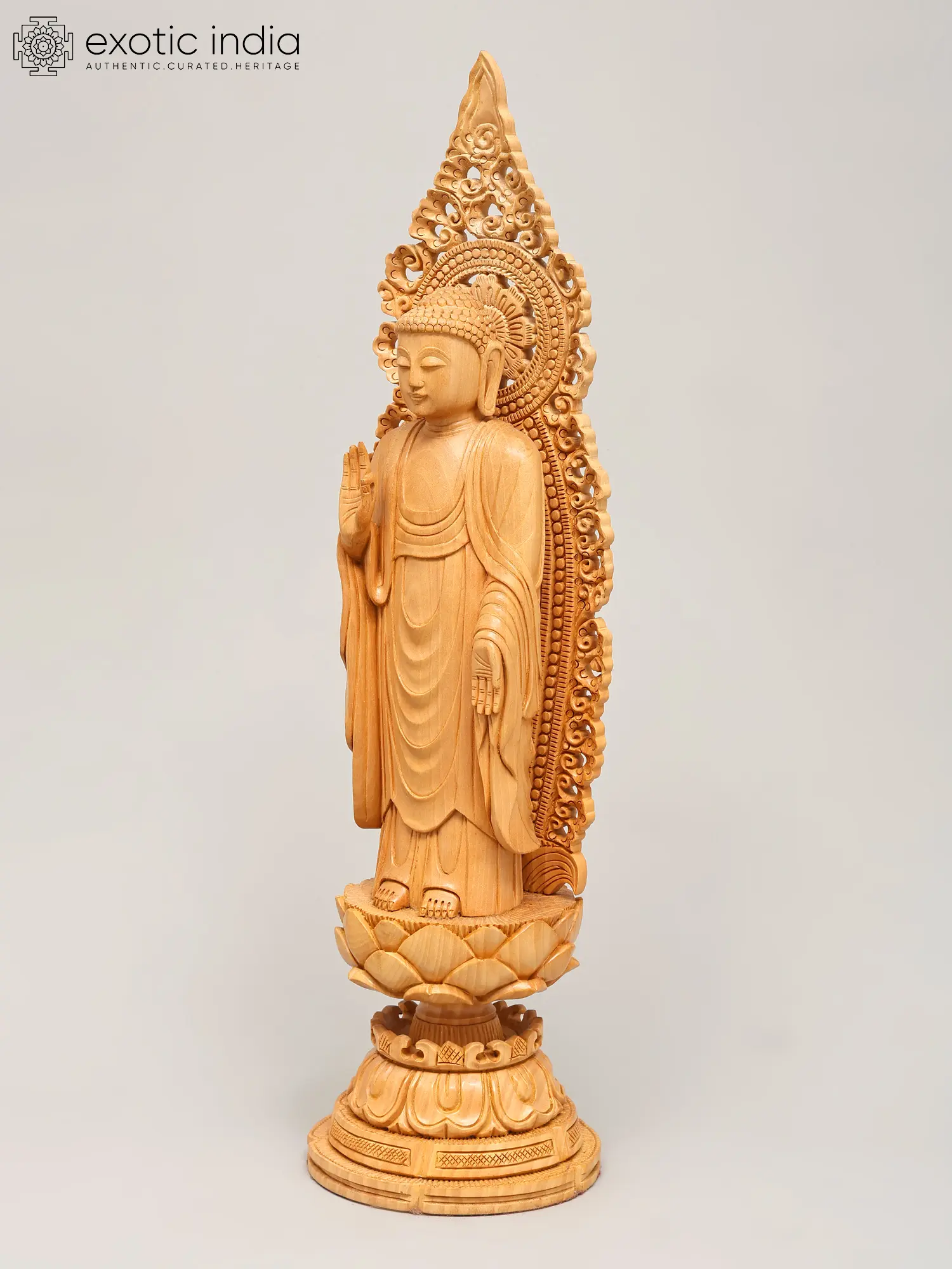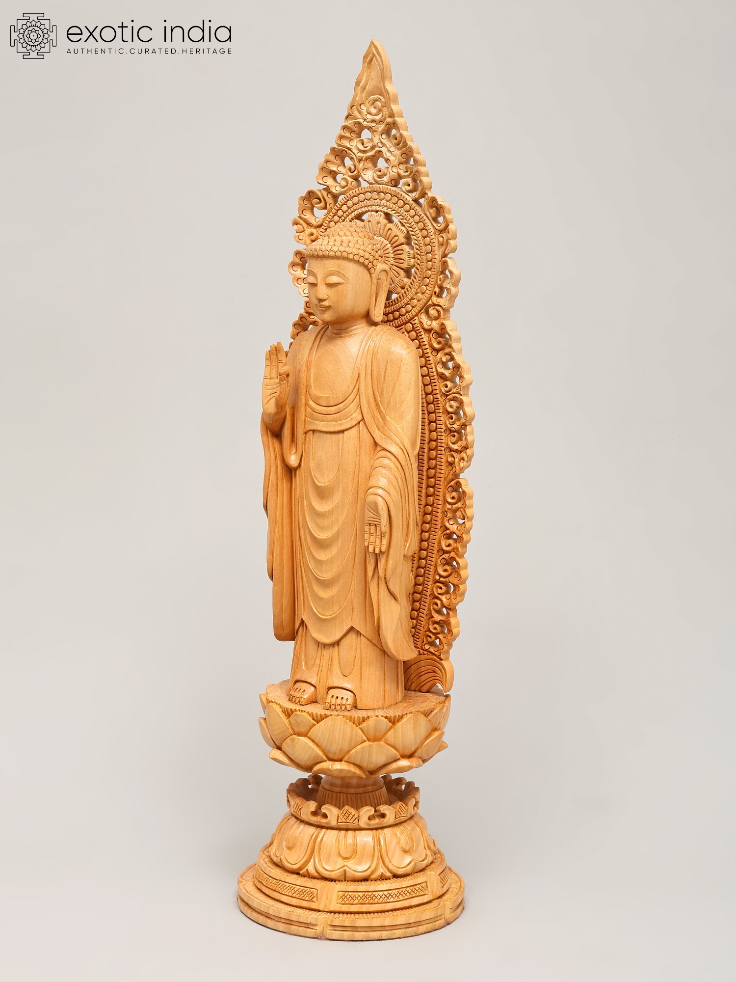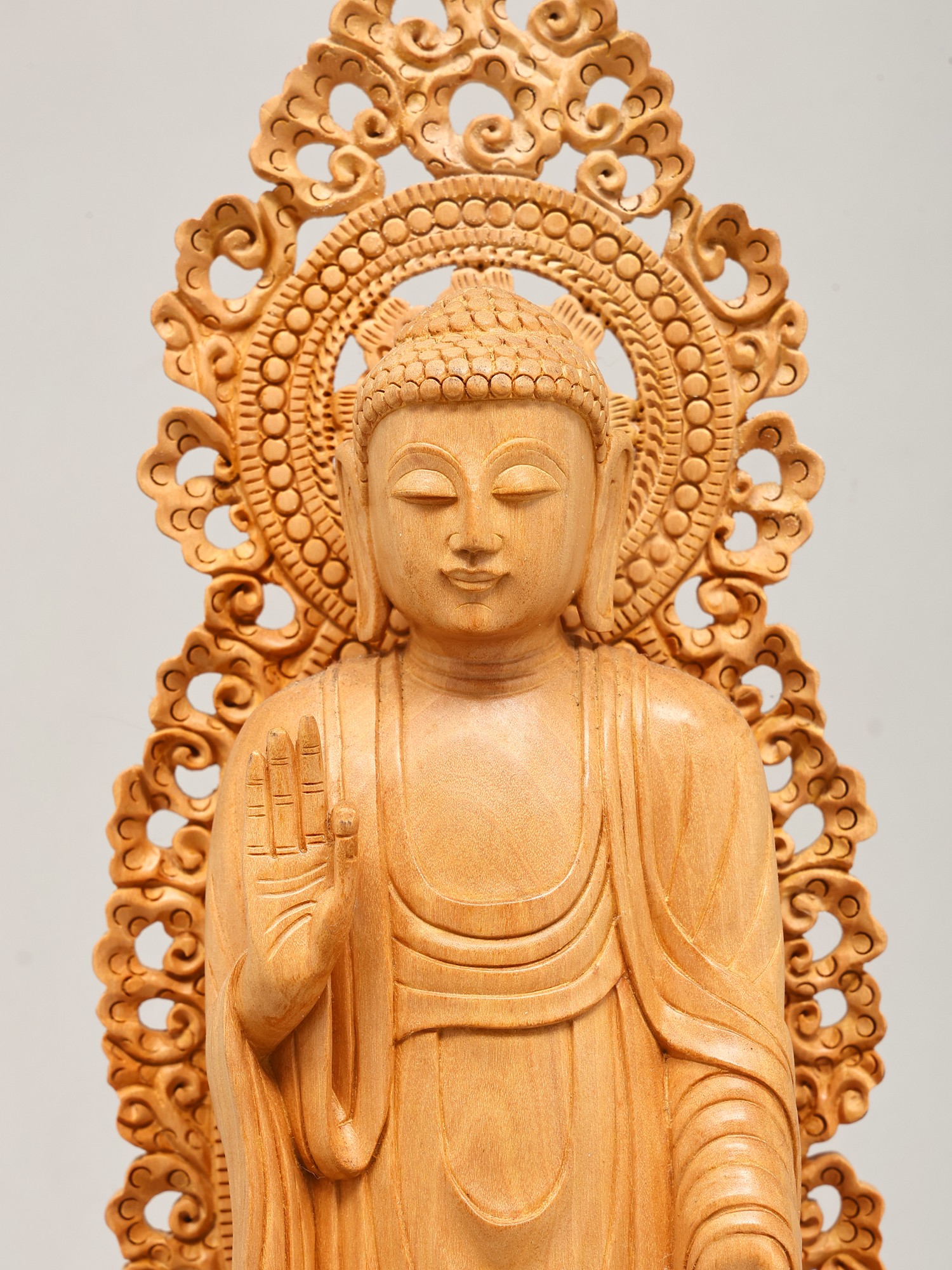 Crafted from fine wood, this statue showcases exceptional artisanal skill. The natural grain of the wood adds a warm, organic feel, while the detailed carving brings the figure to life. The flowing robes are depicted with remarkable realism, conveying a sense of movement and softness. The elaborately designed halo or *prabhavali* behind the Buddha's head, with its intricate scrollwork and delicate patterns, further accentuates the divine aura and spiritual significance of the sculpture. Each element, from the gentle curve of the lips to the subtle folds of the robes, speaks of dedication and mastery. This piece is not merely an object of devotion but a work of art, a testament to the enduring legacy of traditional wood carving.