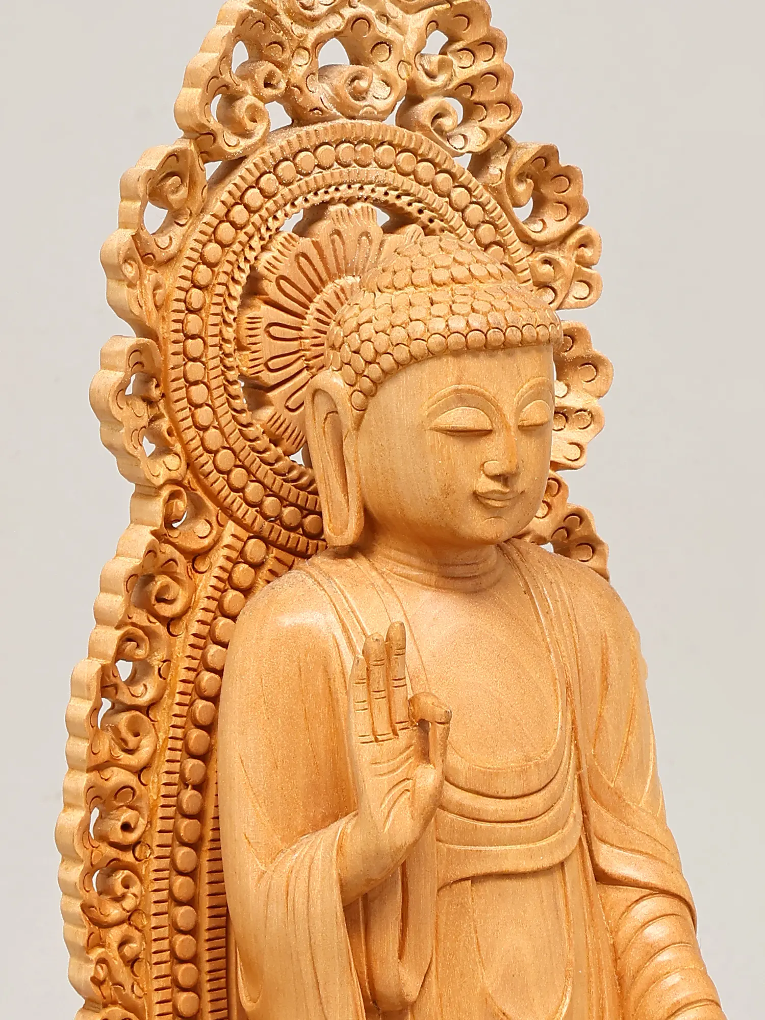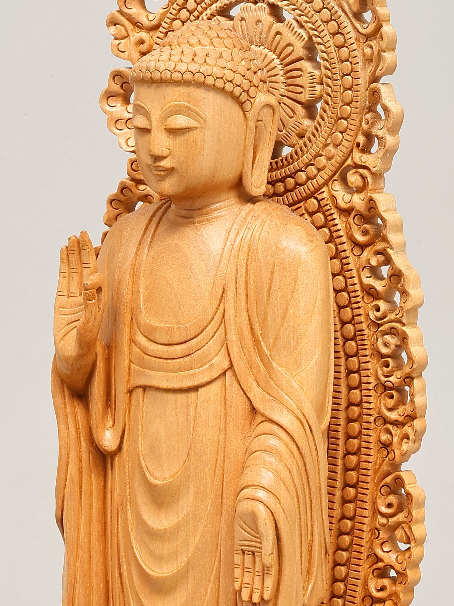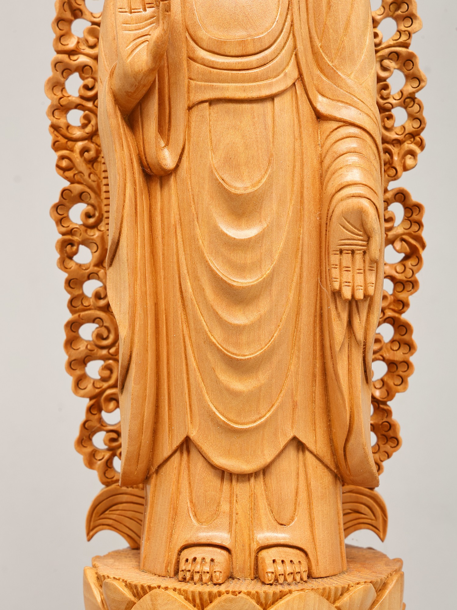 Crafted from fine wood, this statue showcases exceptional artisanal skill. The natural grain of the wood adds a warm, organic feel, while the detailed carving brings the figure to life. The flowing robes are depicted with remarkable realism, conveying a sense of movement and softness. The elaborately designed halo or *prabhavali* behind the Buddha's head, with its intricate scrollwork and delicate patterns, further accentuates the divine aura and spiritual significance of the sculpture. Each element, from the gentle curve of the lips to the subtle folds of the robes, speaks of dedication and mastery. This piece is not merely an object of devotion but a work of art, a testament to the enduring legacy of traditional wood carving.