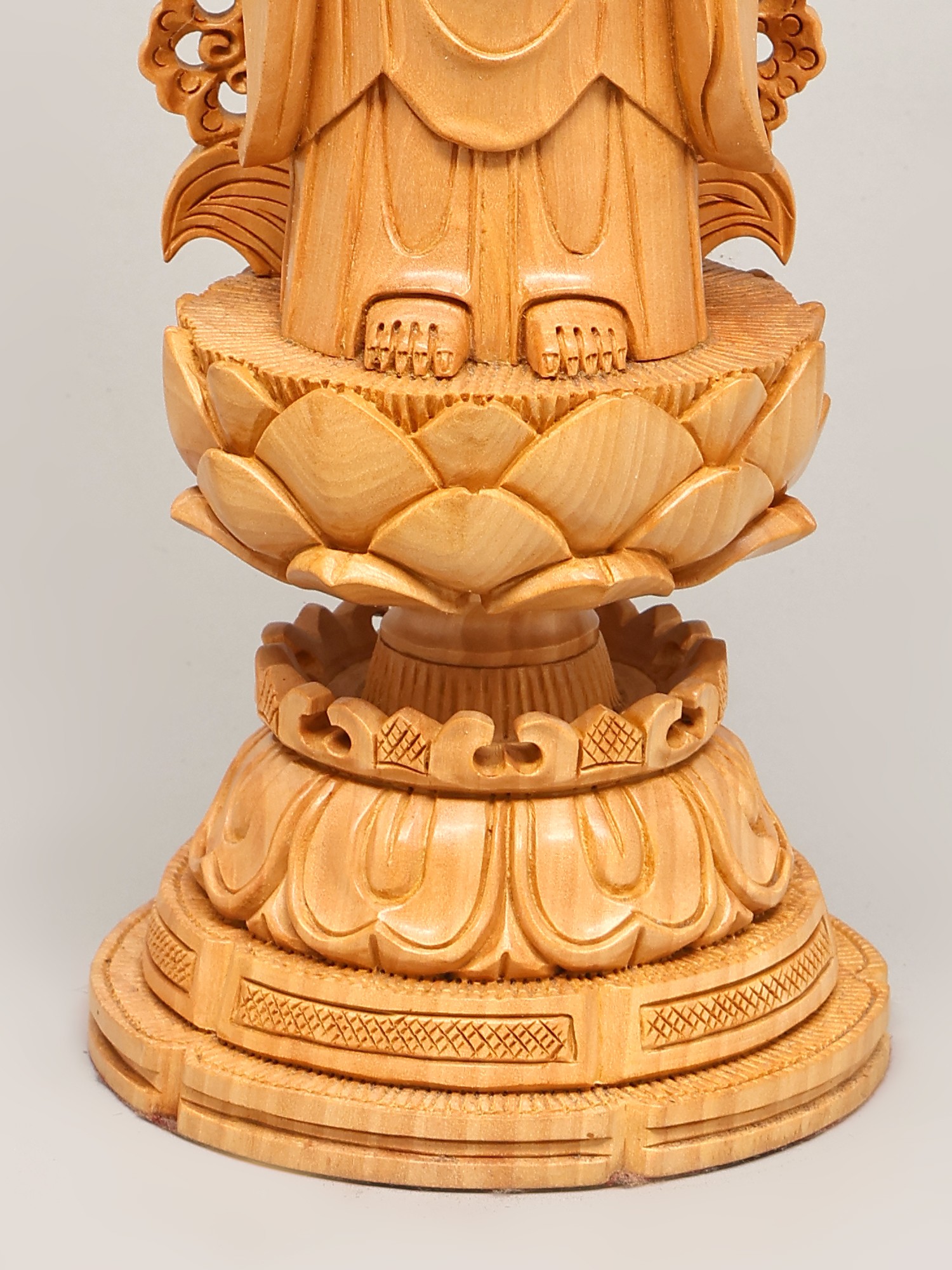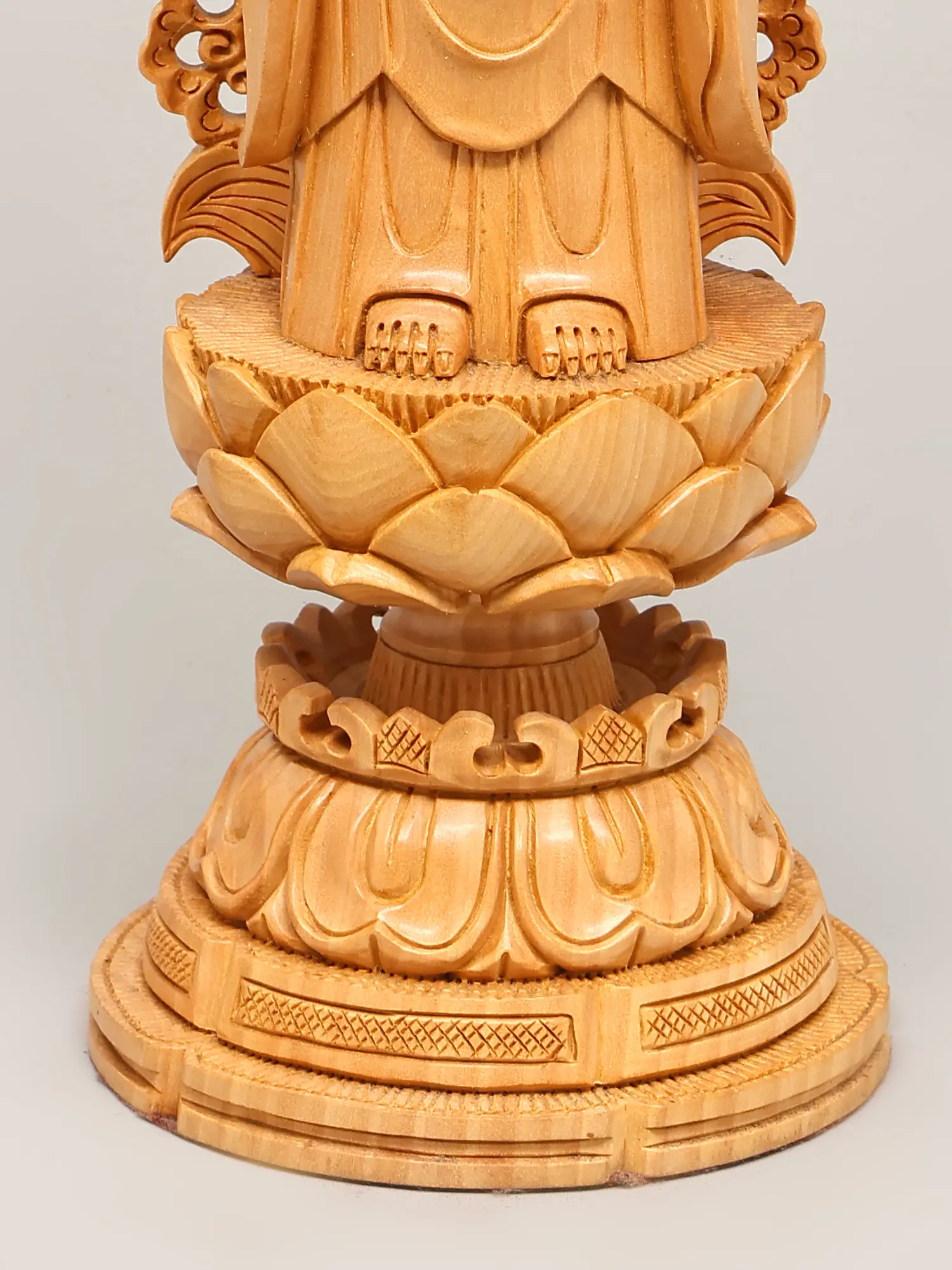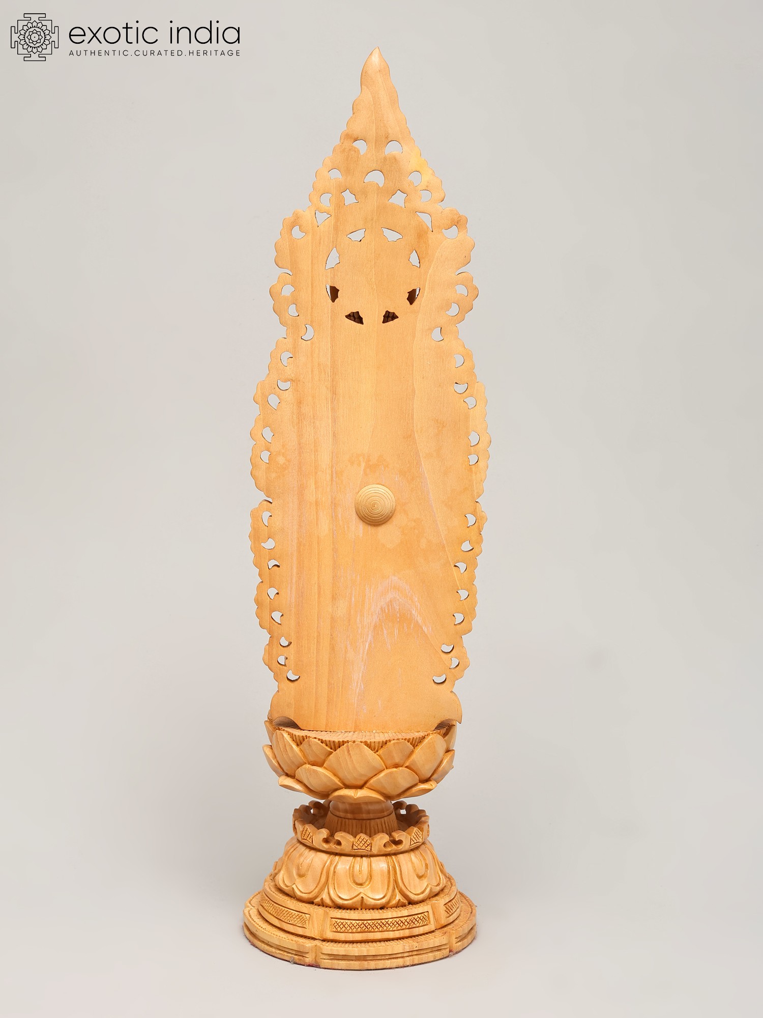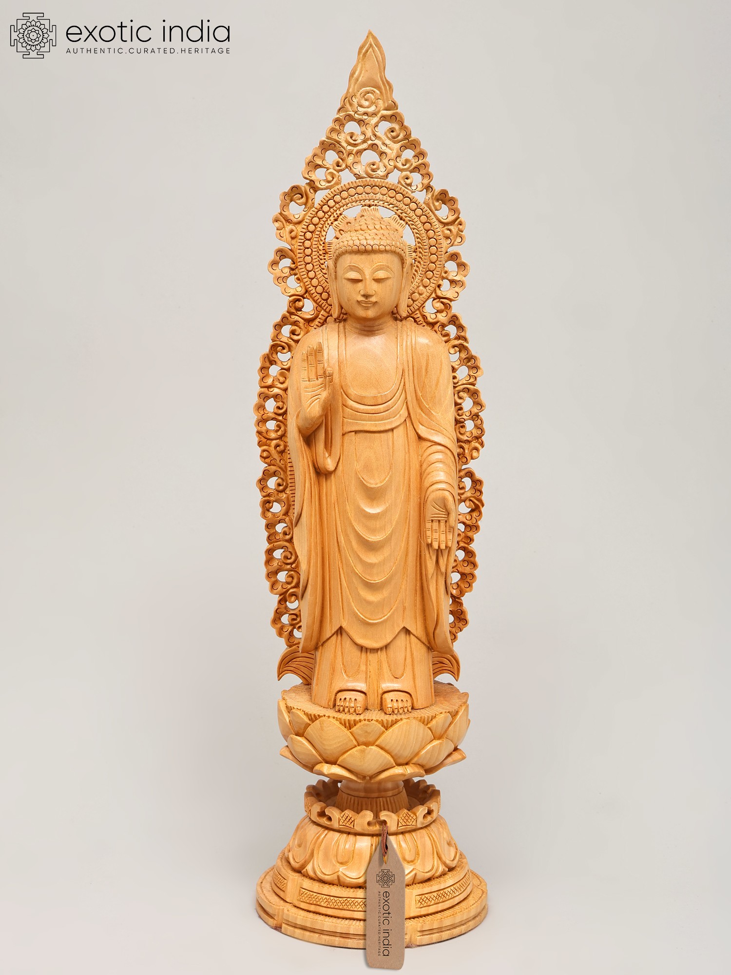 Crafted from fine wood, this statue showcases exceptional artisanal skill. The natural grain of the wood adds a warm, organic feel, while the detailed carving brings the figure to life. The flowing robes are depicted with remarkable realism, conveying a sense of movement and softness. The elaborately designed halo or *prabhavali* behind the Buddha's head, with its intricate scrollwork and delicate patterns, further accentuates the divine aura and spiritual significance of the sculpture. Each element, from the gentle curve of the lips to the subtle folds of the robes, speaks of dedication and mastery. This piece is not merely an object of devotion but a work of art, a testament to the enduring legacy of traditional wood carving.