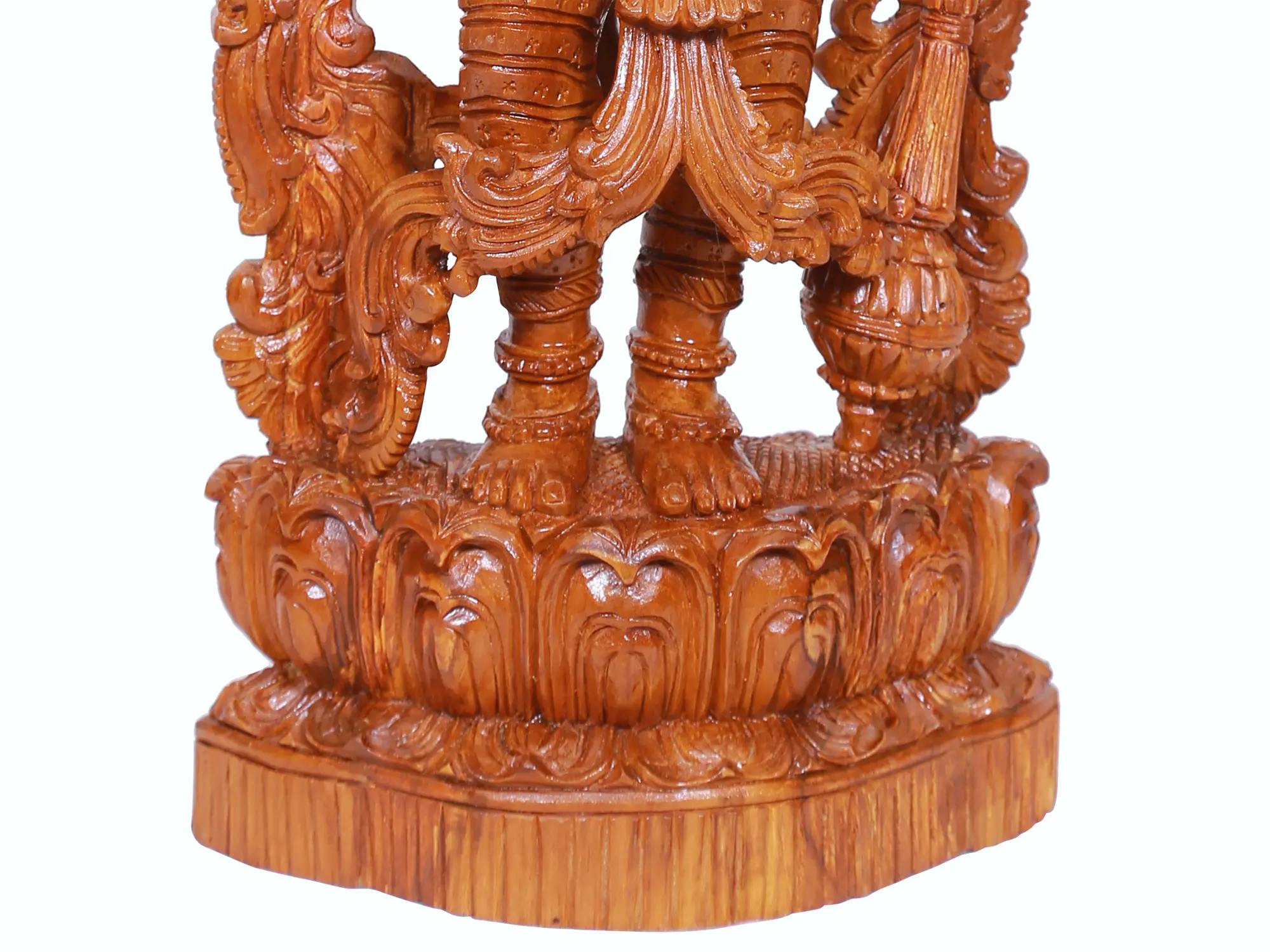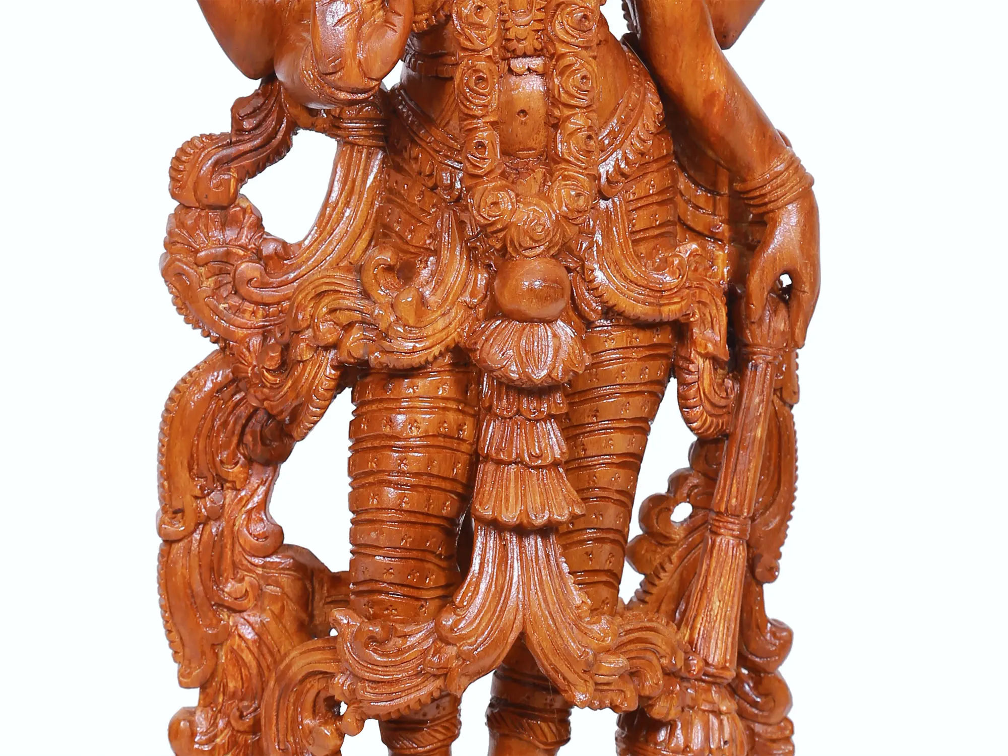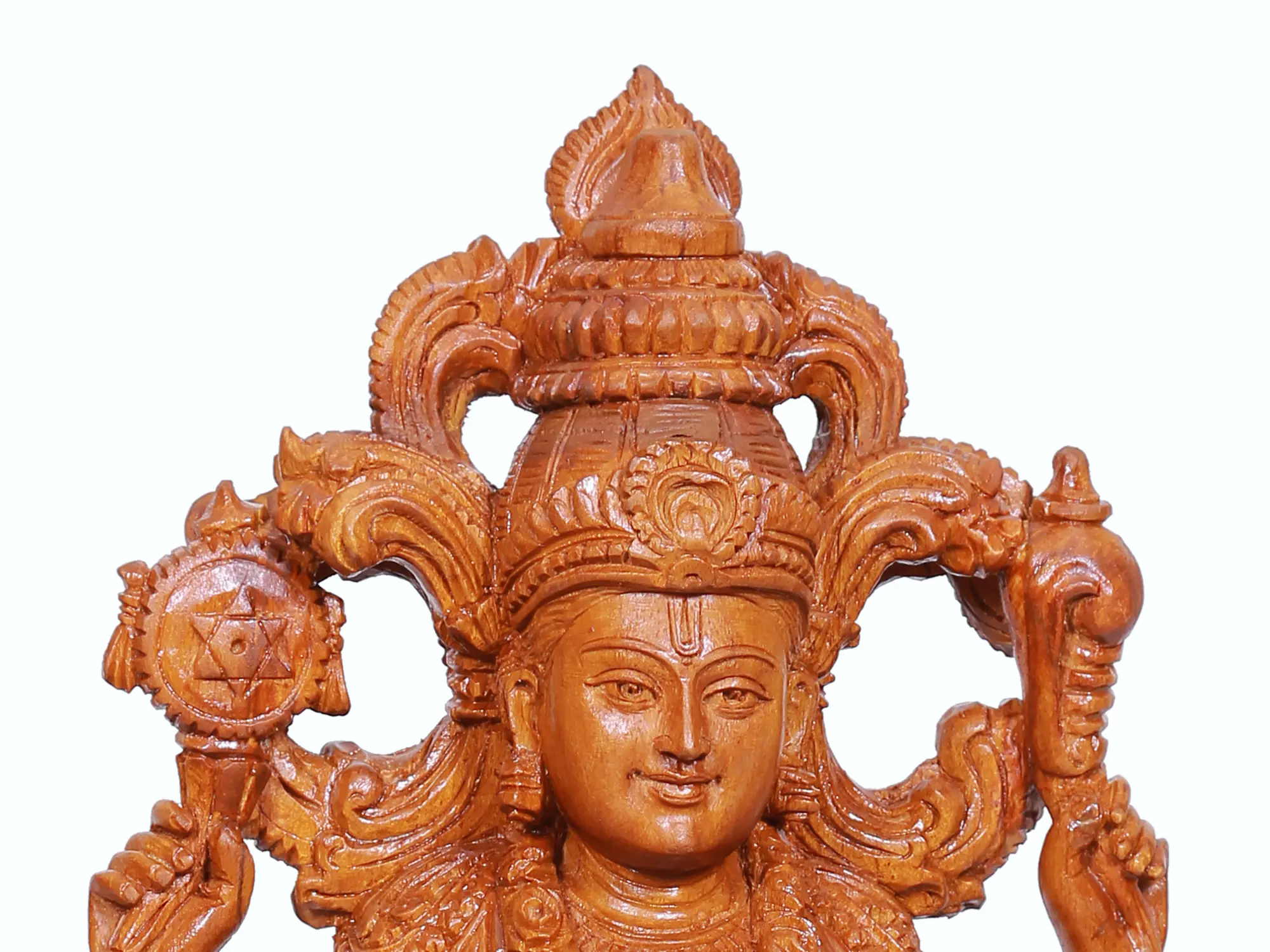 With his graceful limbs ornamented with regal ornaments, Vishnu is surrounded by bustling floral vines and wears a garland as a symbol of nature or Prakriti, which runs to embrace the primordial male or Purusha, resulting in the origin of life and auspiciousness. The tilak-marked forehead, lotus eyes, and blissfully smiling lips infuse a heavenly life into the artwork, making this teakwood statue a magnificent ode to the Sripati (the Lord of Sri, goddess of wealth).