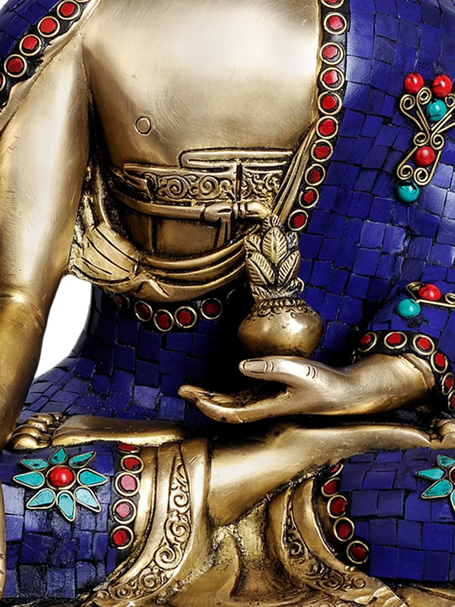 He is known as the Medicine Buddha, the supreme healer. Legend tells of his vow, made while still a bodhisattva, to liberate all beings from physical and mental illness. He is believed to manifest in many forms, accessible to those who call upon him with sincerity. His right hand extends in the Varada Mudra, the gesture of generosity and compassion, offering blessings and assistance. In his left hand, he holds a bowl filled with healing nectar and herbs, symbolizing his power to cure not only physical ailments but also the deeper wounds of the spirit.