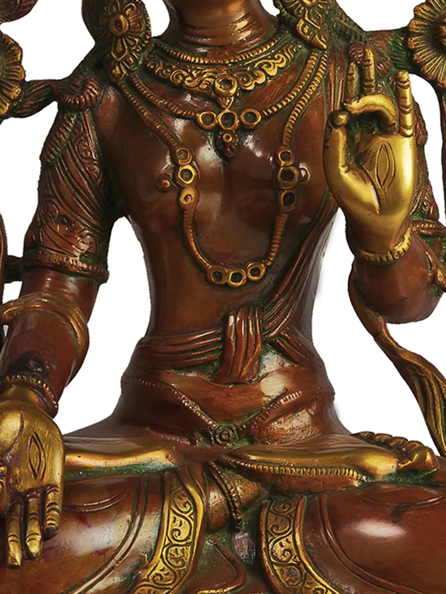 The fine details of this brass sculpture speak to the skill and dedication of the artisans who created it. From the intricate crown adorned with symbolic ornaments to the delicate folds of her robes, every aspect of the statue has been meticulously rendered. Seated in the lotus position on a double lotus throne, she holds her right hand in the varada mudra, the gesture of giving, symbolizing her generosity in bestowing blessings upon her devotees. In her left hand, she holds the stem of a lotus flower, further emphasizing her purity and compassion. The warm, golden hues of the brass add a sense of radiance to the statue, enhancing its overall aesthetic appeal. The lotus throne on which she sits signifies purity, spiritual awakening, and detachment from worldly desires.