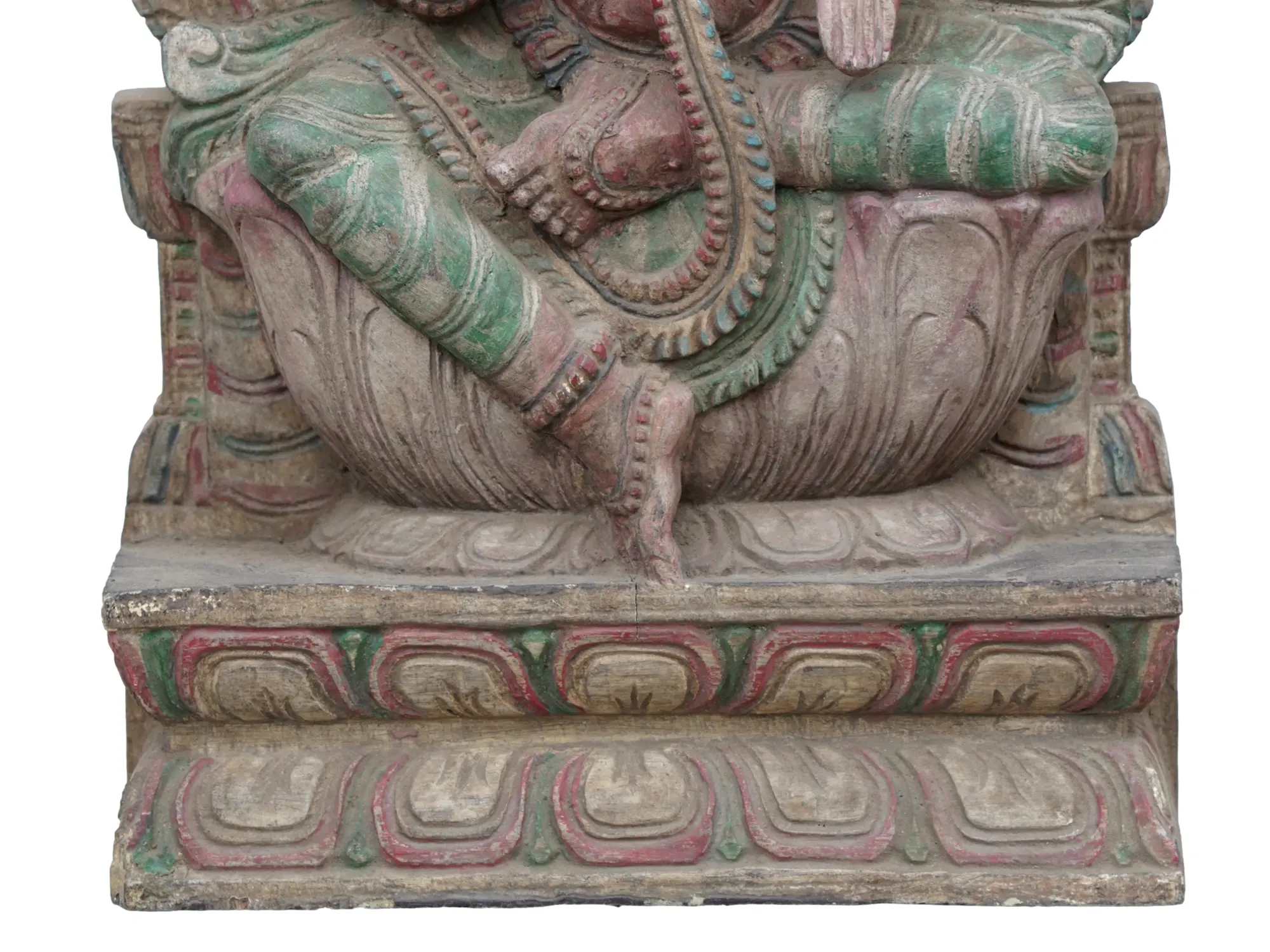This wooden sculpture is a testament to traditional Indian craftsmanship. The intricate carving, from the delicate facial features to the ornate headdress and the flowing drapes of fabric, showcases the skill of the artisan. The seated posture signifies stability and groundedness, inviting Lakshmi to reside permanently and bless her devotees with unwavering prosperity. The use of traditional pigments, applied with a classic touch, adds depth and character, hinting at stories and rituals passed down through generations. This idol is more than just a decorative item; it is a tangible connection to a rich cultural heritage and a conduit for invoking divine blessings. Place it on your altar, in your entryway, or any space where you wish to cultivate an environment of prosperity and auspiciousness.
