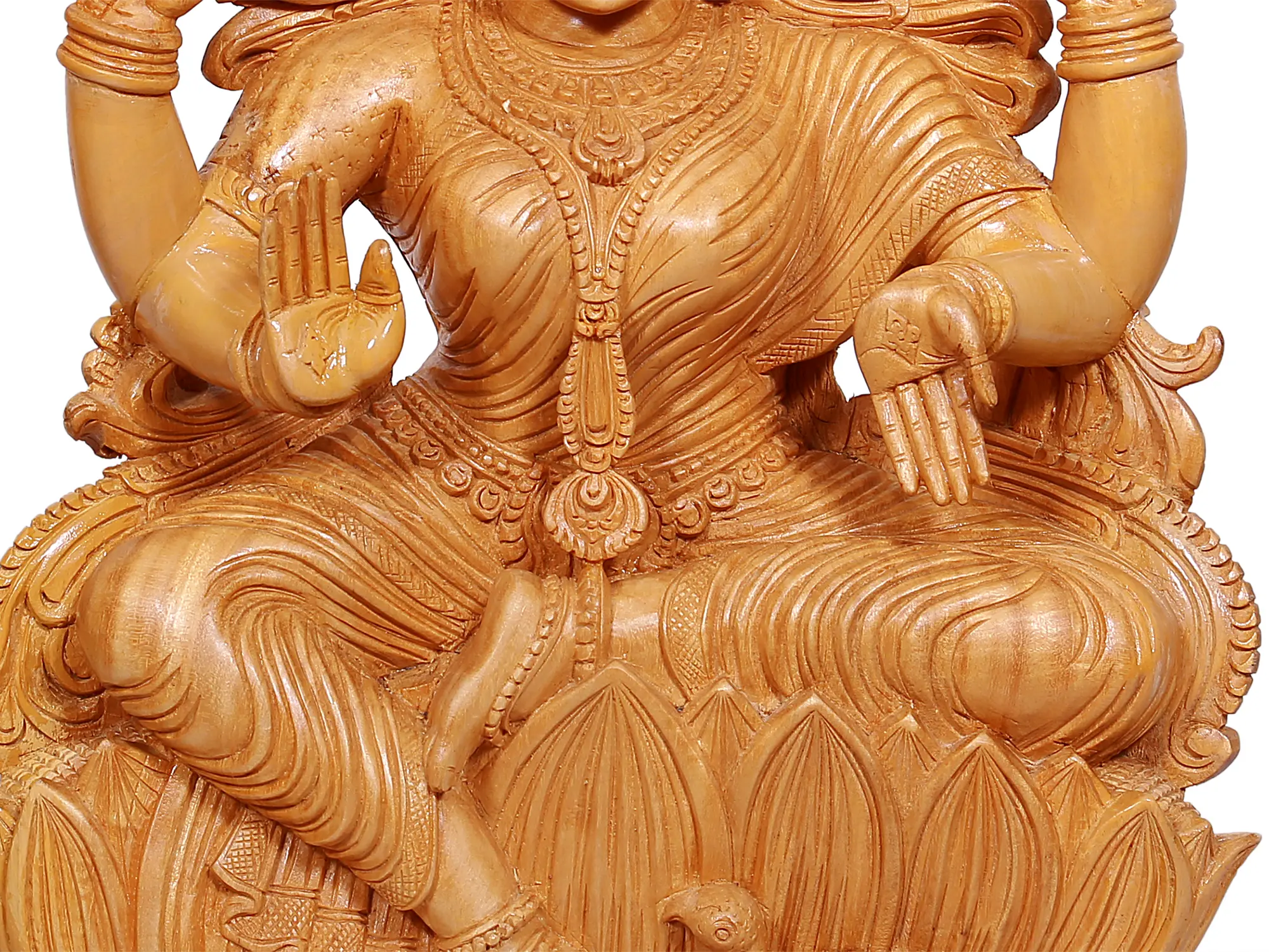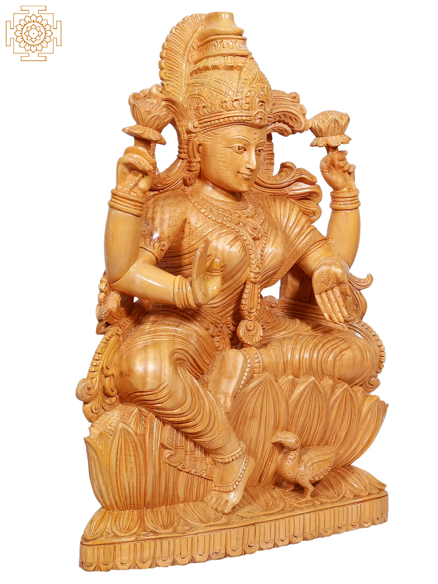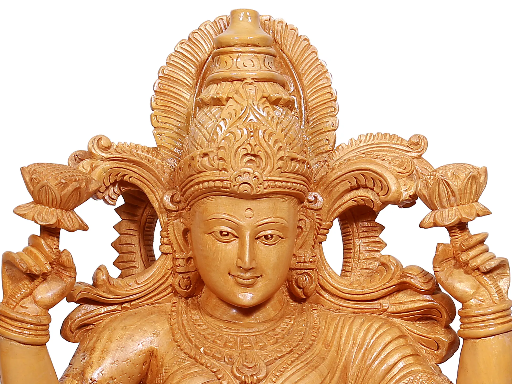 18" Wooden Idol of Devi Lakshmi Seated on Lotus Throne