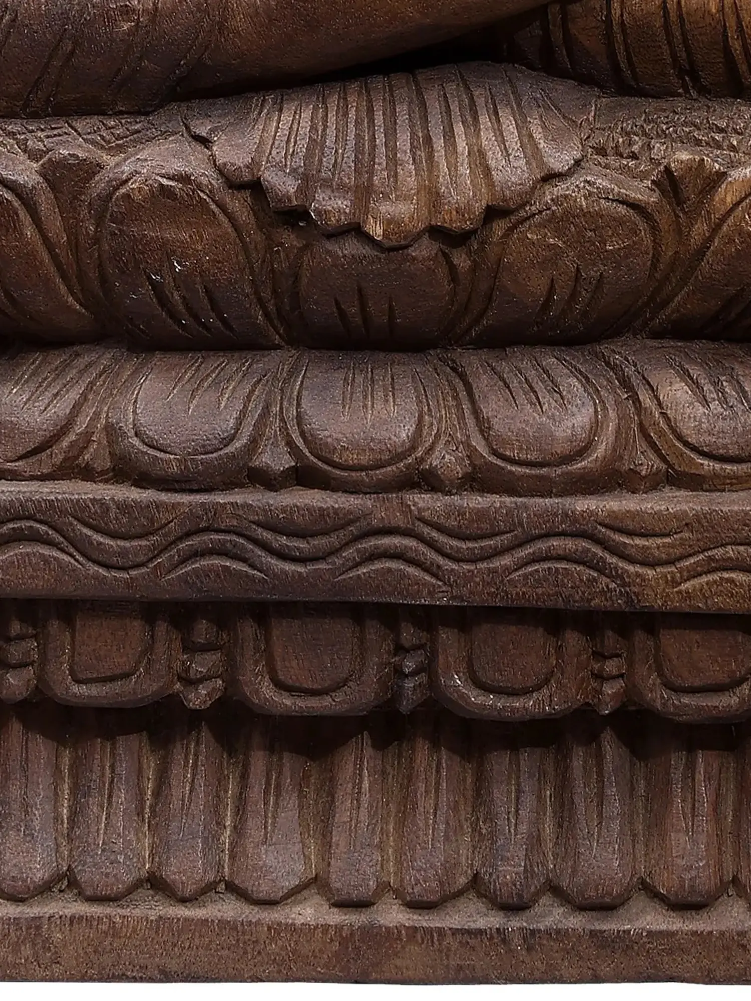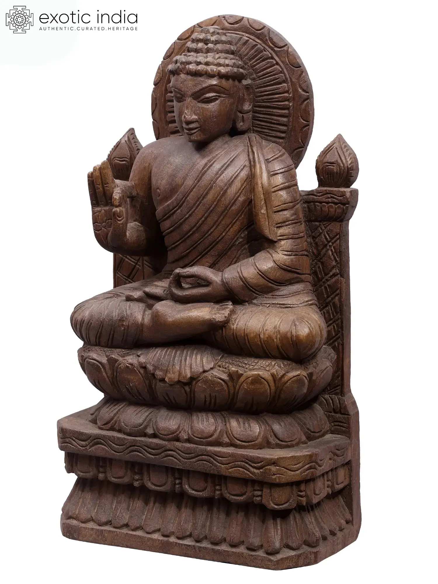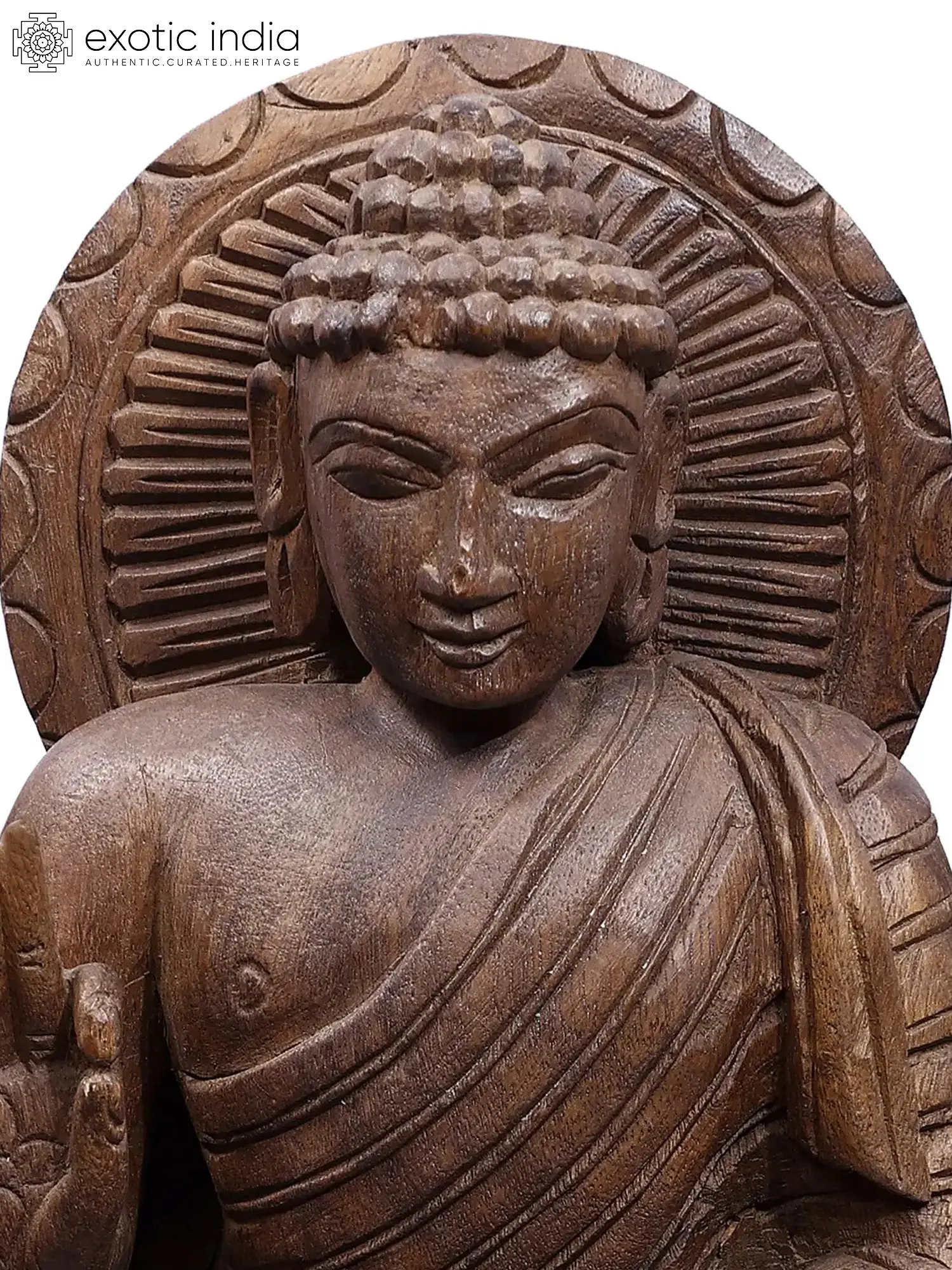 In this wooden statute, carved with simple yet perfect details, the sublime aura of Tathagata is captured. Though Dharmachakra-pravartan mudra or the gesture of turning the wheel of Dhamma is associated with the first sermon of Buddha, this statue uses the gesture of Vitarka to present Buddha as the eternal master, whose teachings live and guide followers beyond time and space.