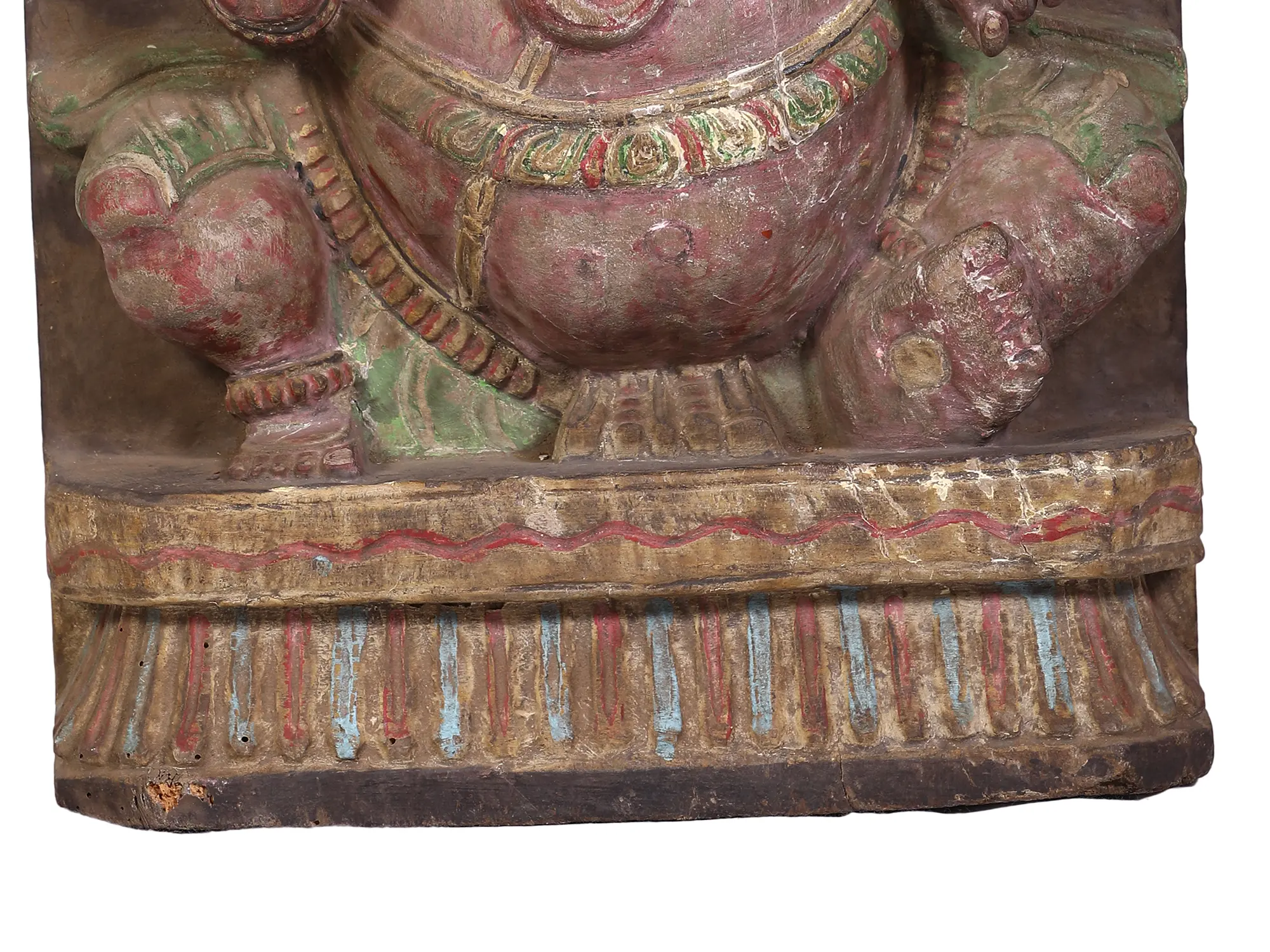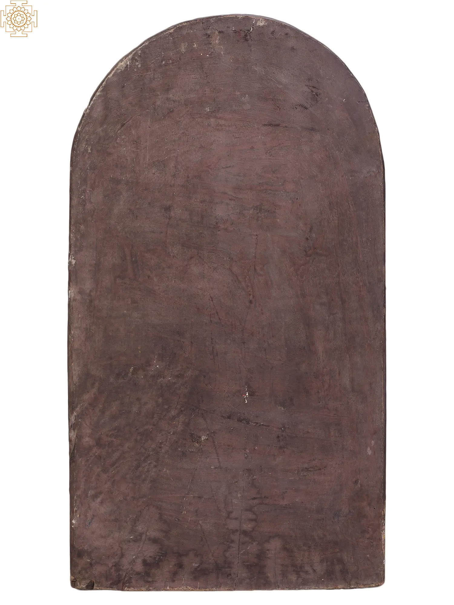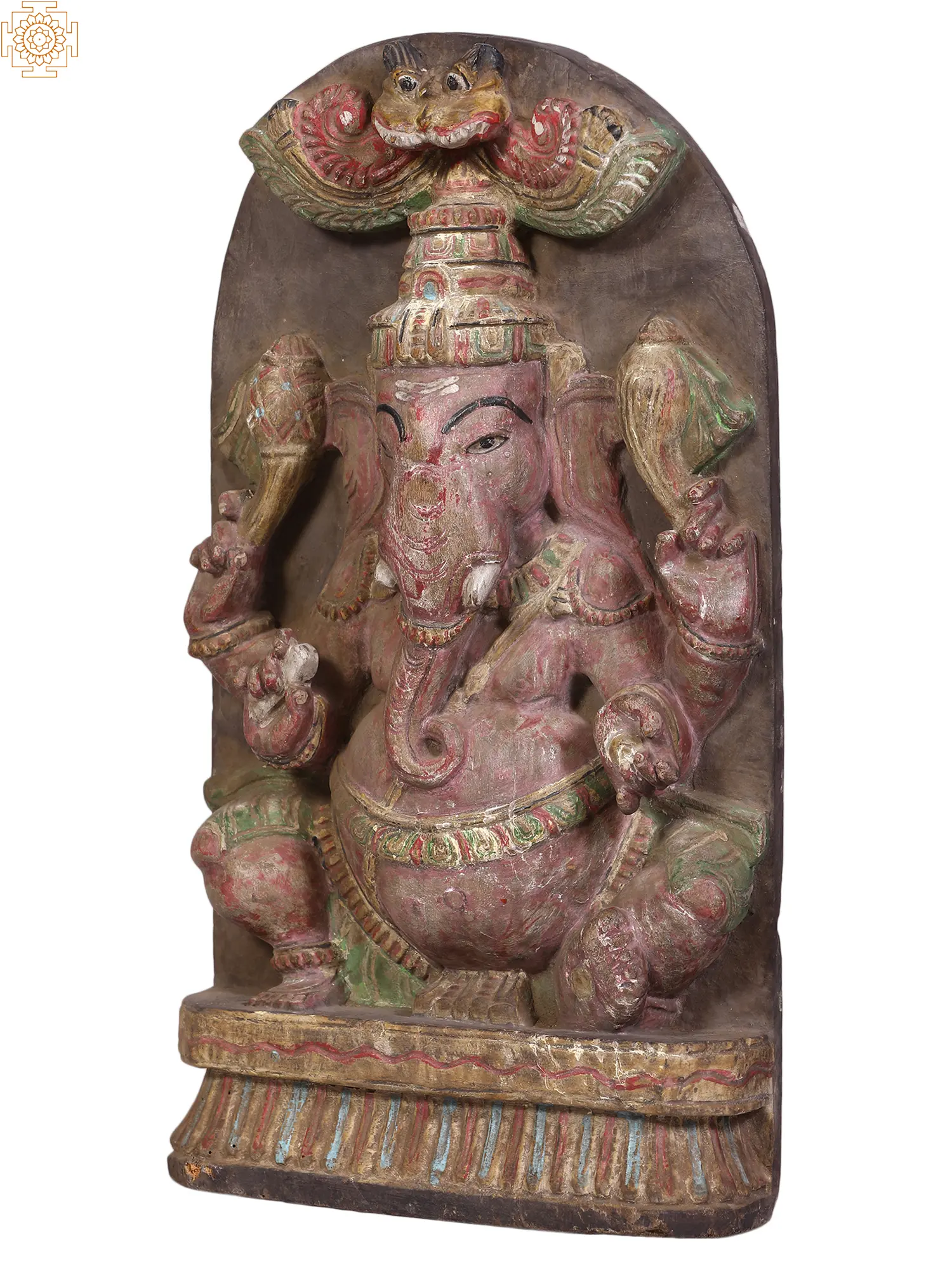 Crowning this sacred image is the formidable Kirtimukha, a fearsome, lion-like face often depicted as devouring itself or surrounded by flames. In Hindu mythology, the Kirtimukha, meaning "Face of Glory," is a symbol of protection and ultimate authority. It is believed to ward off evil spirits and negative energies, acting as a powerful guardian of sacred spaces. Its integration above Lord Ganesha underscores the deity's role as a supreme protector, ensuring that all endeavors undertaken are shielded from harm and blessed with success. The vibrant, yet subtly aged, painted accents on the Kirtimukha and Ganesha’s attire add a layer of depth and historical character to the carving, hinting at its journey and the blessings it carries.