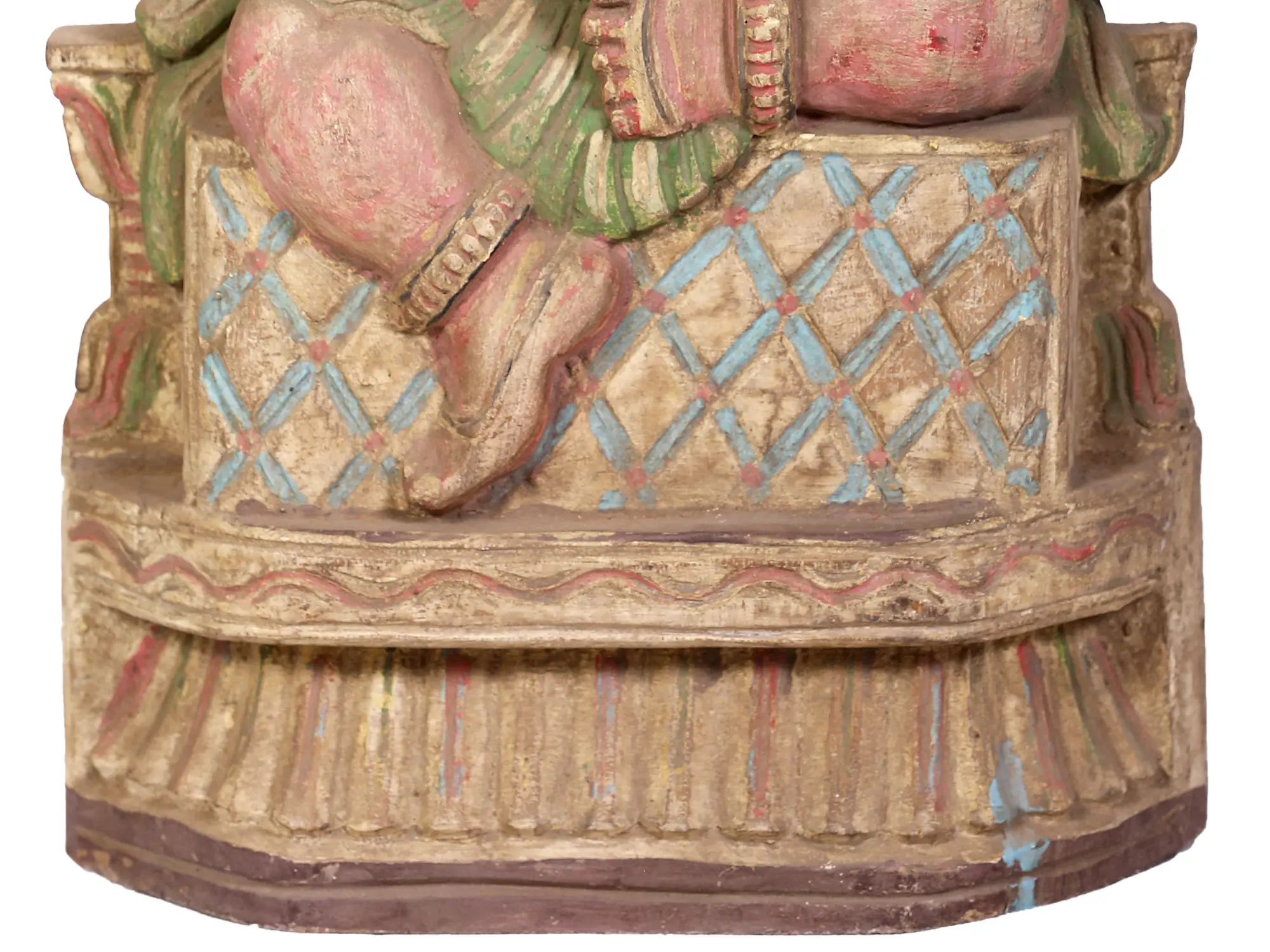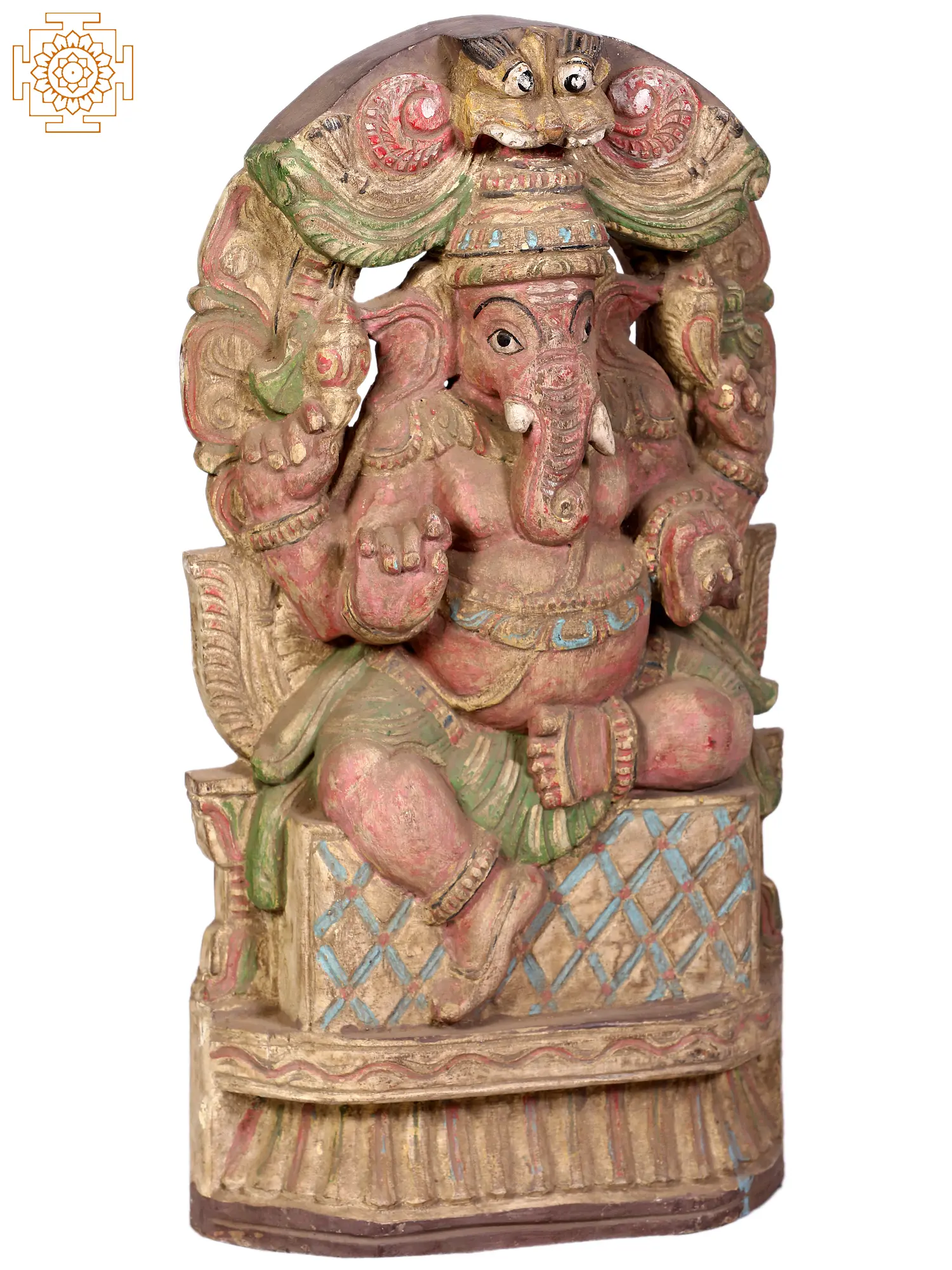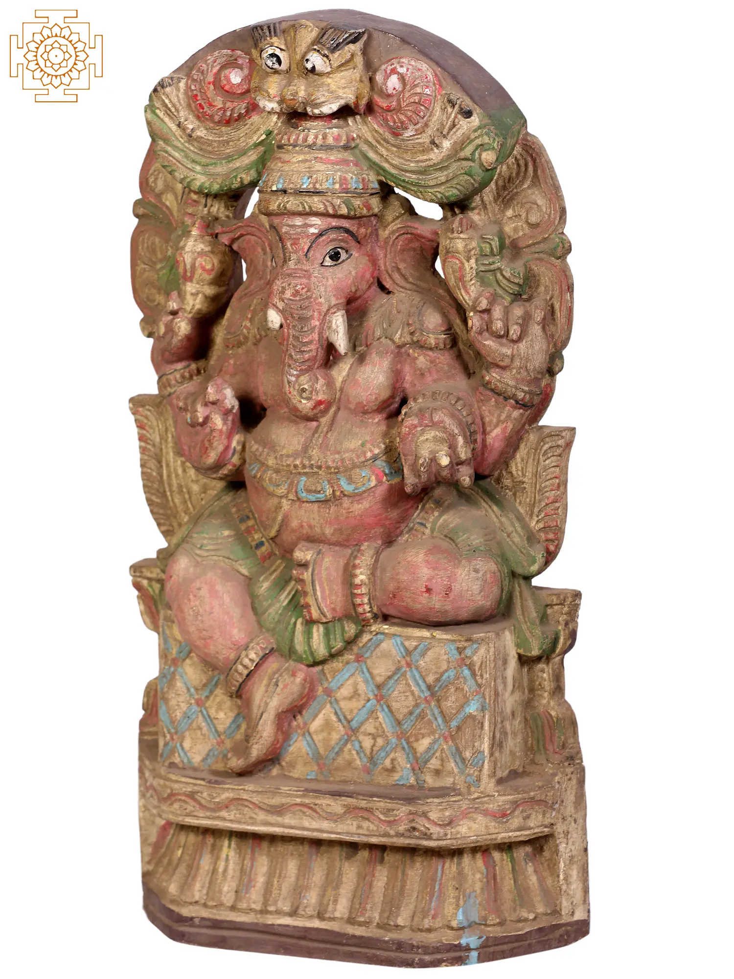 Invite the divine presence of Lord Ganesha into your home with this exquisitely carved wooden masterpiece. Seated majestically upon a Kirtimukha throne, this eighteen-inch sculpture is more than just a decorative piece; it is a conduit of blessings, a symbol of wisdom, and the remover of obstacles. The rich, aged wood, intricately detailed and painted with subtle hues, imbues the deity with a timeless aura, making it a focal point for devotion and contemplation. The craftsmanship evident in this statue speaks to a tradition of artistry passed down through generations. Each curve of Ganesha's form, from the gentle roundness of his belly to the delicate tilt of his trunk, is rendered with remarkable skill. His multiple hands, a common depiction symbolizing his omnipresent nature and ability to bestow various boons, are held in gestures that convey power, protection, and grace. The painted details, though artfully aged, hint at the vibrant palettes that traditionally adorn such sacred icons, adding depth and character to the wooden form.