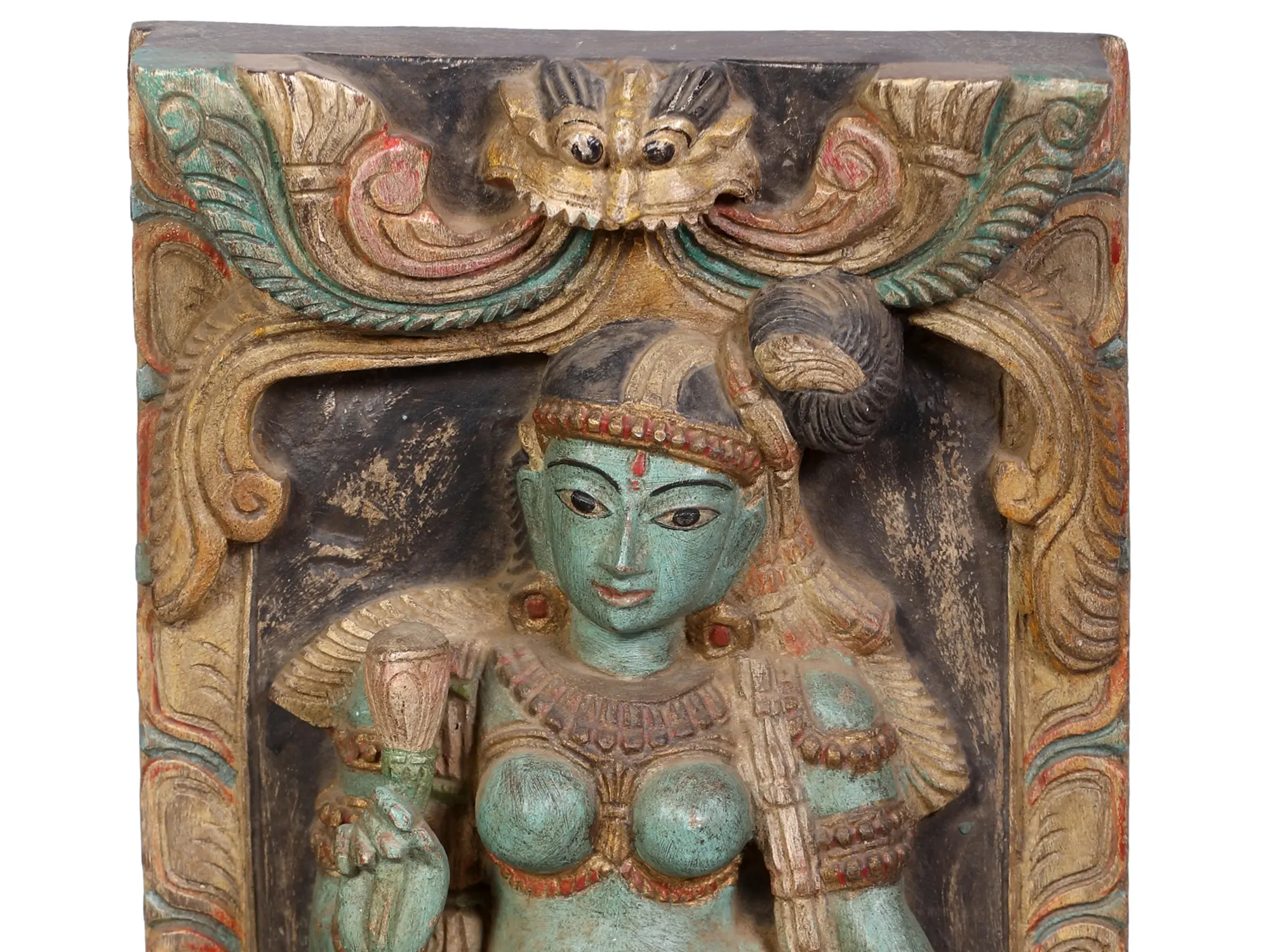 This exquisite wooden sculpture captures the grace and allure of a Nambudri lady, a figure deeply woven into the cultural tapestry of Kerala. Carved with remarkable attention to detail, this piece is a testament to the rich artistic heritage of South India, where wood carving has been a revered craft for centuries. The Nambudri community, historically known for their scholarly and priestly roles, also possessed a deep appreciation for arts and aesthetics, which is beautifully reflected in this representation. The lady is depicted in a dignified posture, adorned with traditional jewelry and flowing garments. Her serene expression and the gentle curve of her form evoke a sense of timeless beauty. The vibrant, albeit aged, pigments used in her decoration – the striking turquoise of her skin, the warm hues of her attire, and the gilded accents – speak to a bygone era of opulence and artistic expression. The surrounding carved frame, with its intricate patterns and the stylized depiction of a mythical creature at the apex, further enhances the regal aura of the central figure, creating a miniature sanctuary for her presence.