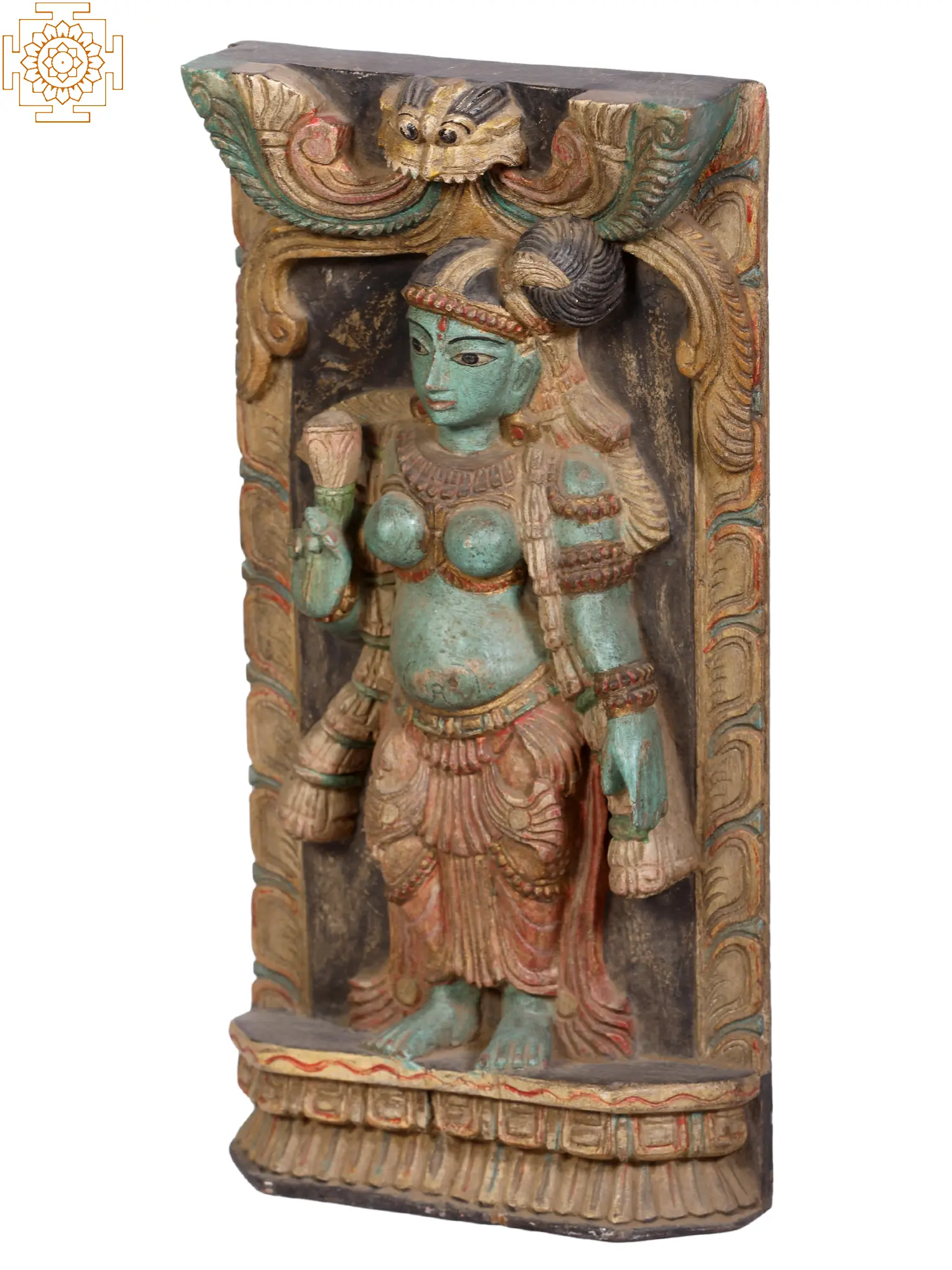 The portrayal of women in South Indian art often carries profound mythological and spiritual significance. While this specific depiction may not overtly represent a goddess, the dignified stance and the symbolic elements often found in such carvings can allude to feminine divine principles. In Hindu mythology, various goddesses embody different aspects of nature, power, and creation. The serene countenance and the gentle hold of an object in her hand (which could be interpreted as symbolic of knowledge or a blessing) can be seen as echoes of goddesses like Saraswati, the patron of arts and knowledge, or Lakshmi, the goddess of wealth and prosperity. The presence of the elaborate decorative elements and the protective carving at the top might also suggest a guardian or a divine messenger, embodying the protective and nurturing qualities often associated with feminine deities. The use of wood, a natural and organic material, further connects the sculpture to the earth and the cycle of life, a common theme in Indian iconography.