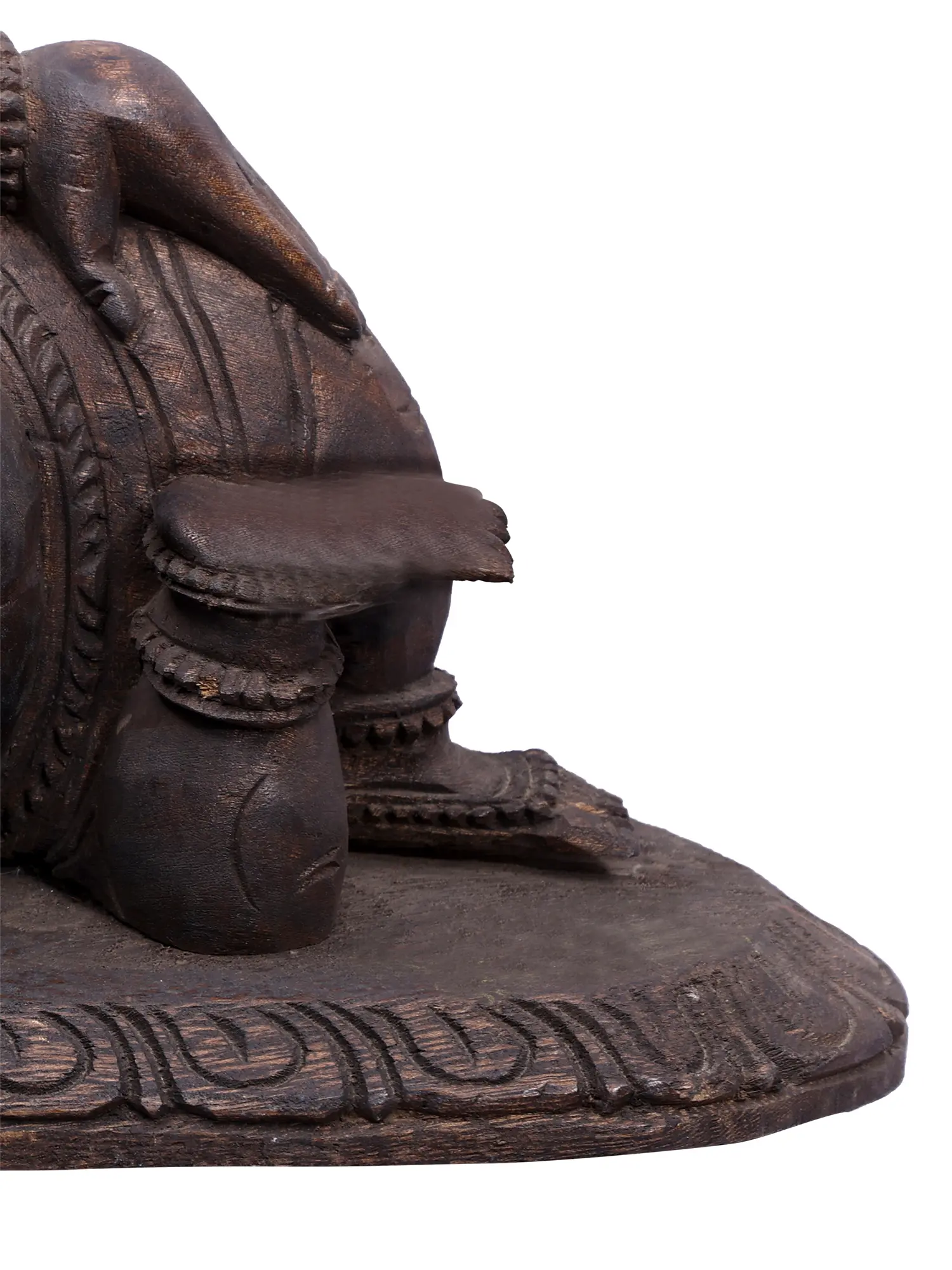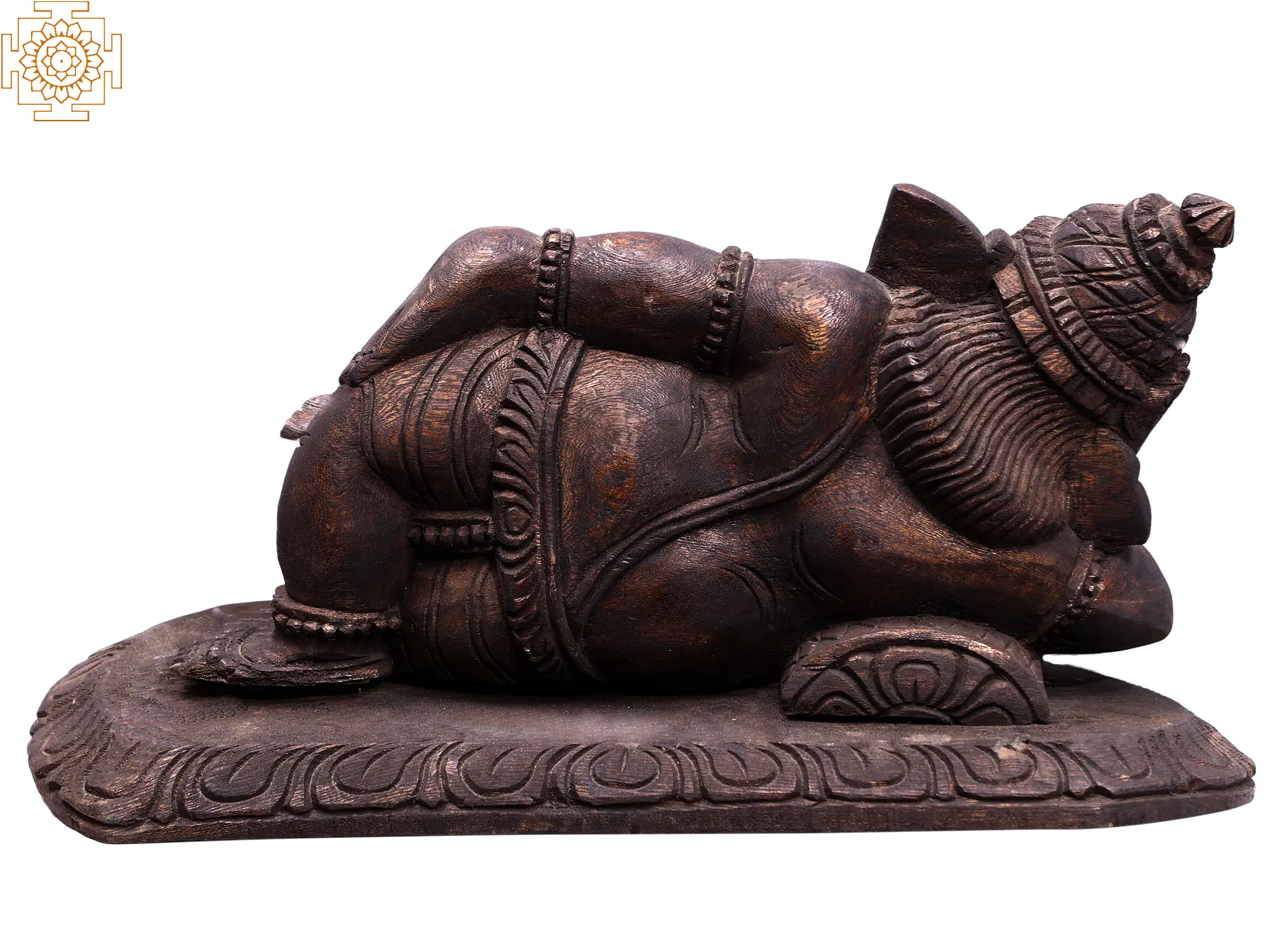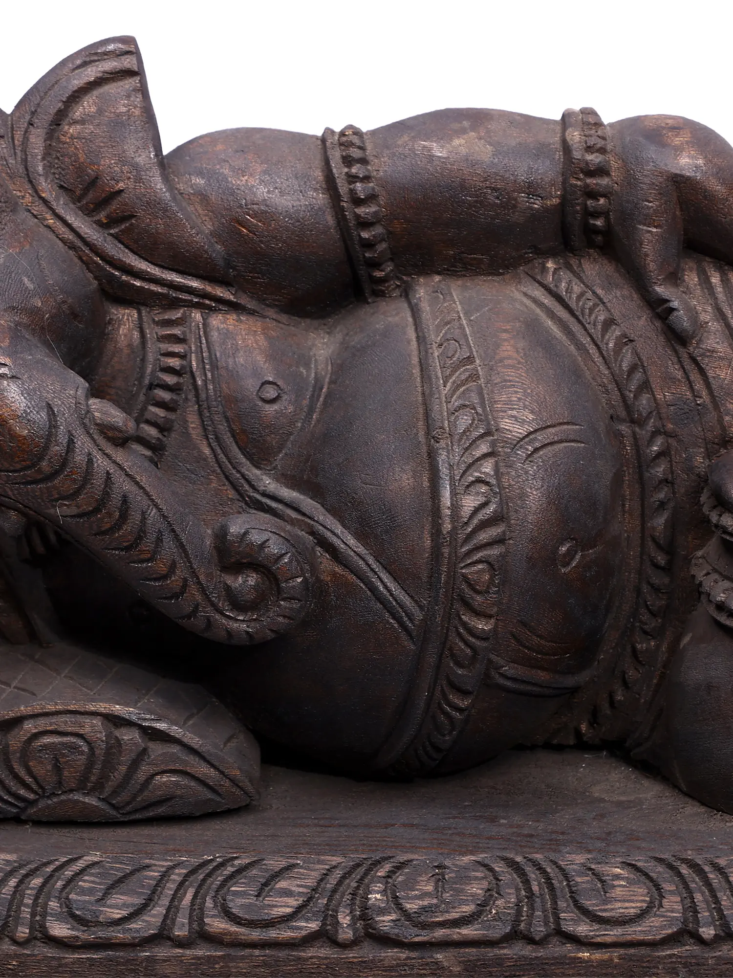 In a sacred corner of eternity, the divine form of “Lord Ganesha” reclines, an embodiment of serenity and grace. Carved in wood, this enchanting sculpture captures the tranquil essence of the elephant-headed deity. With his head cradled in his right hand, “Ganesha” rests, an epitome of profound relaxation. His left hand, gently resting on his lap, symbolises inner peace and the tranquillity that arises from unwavering wisdom. This wooden masterpiece signifies the harmonious balance of strength and stillness, teaching us that even amidst life’s chaos, we can find reprieve and wisdom through embracing a tranquil heart. This artwork reminds us that in repose, we can conquer all obstacles and challenges, nurturing our inner divinity with profound calmness.