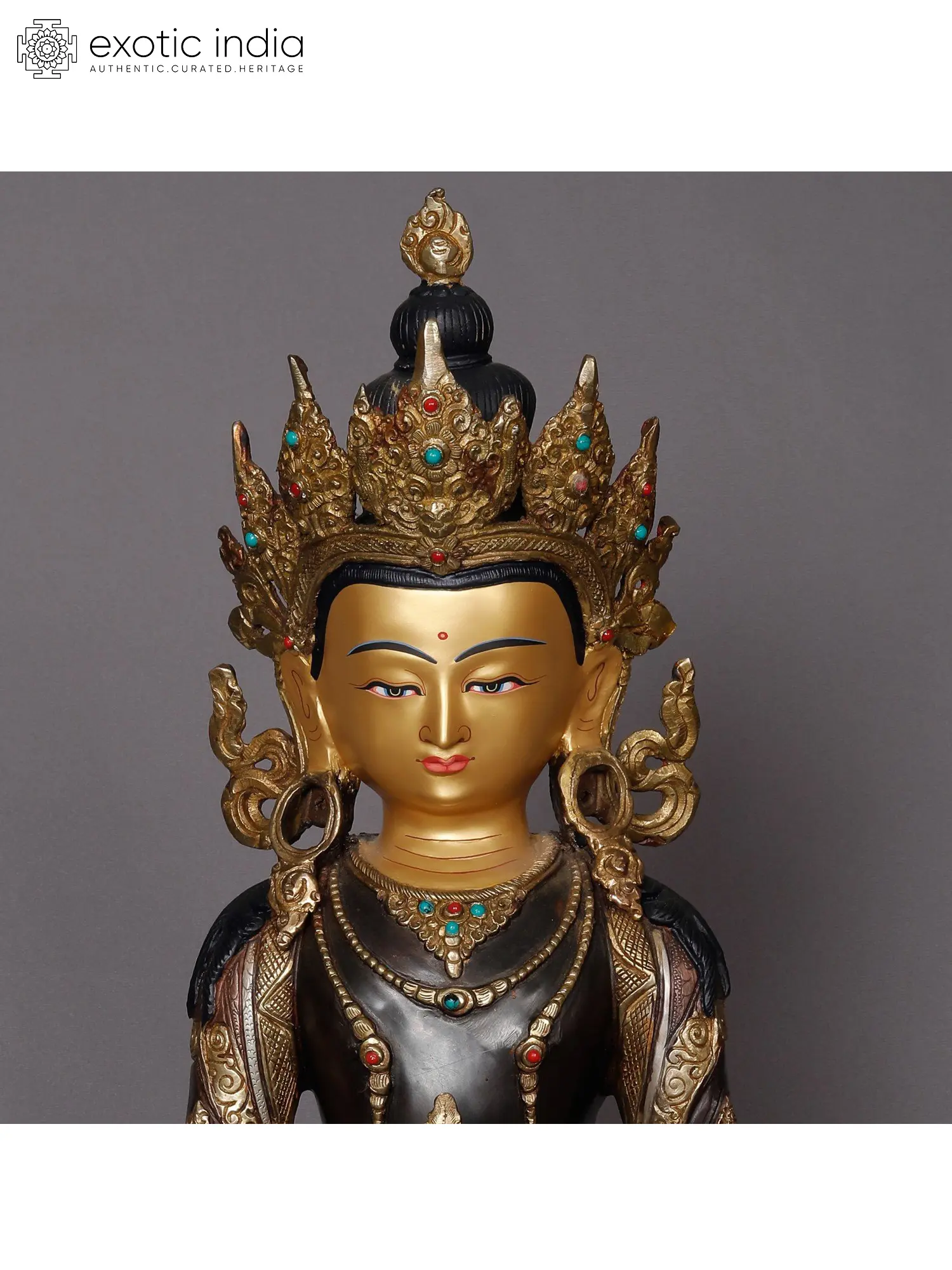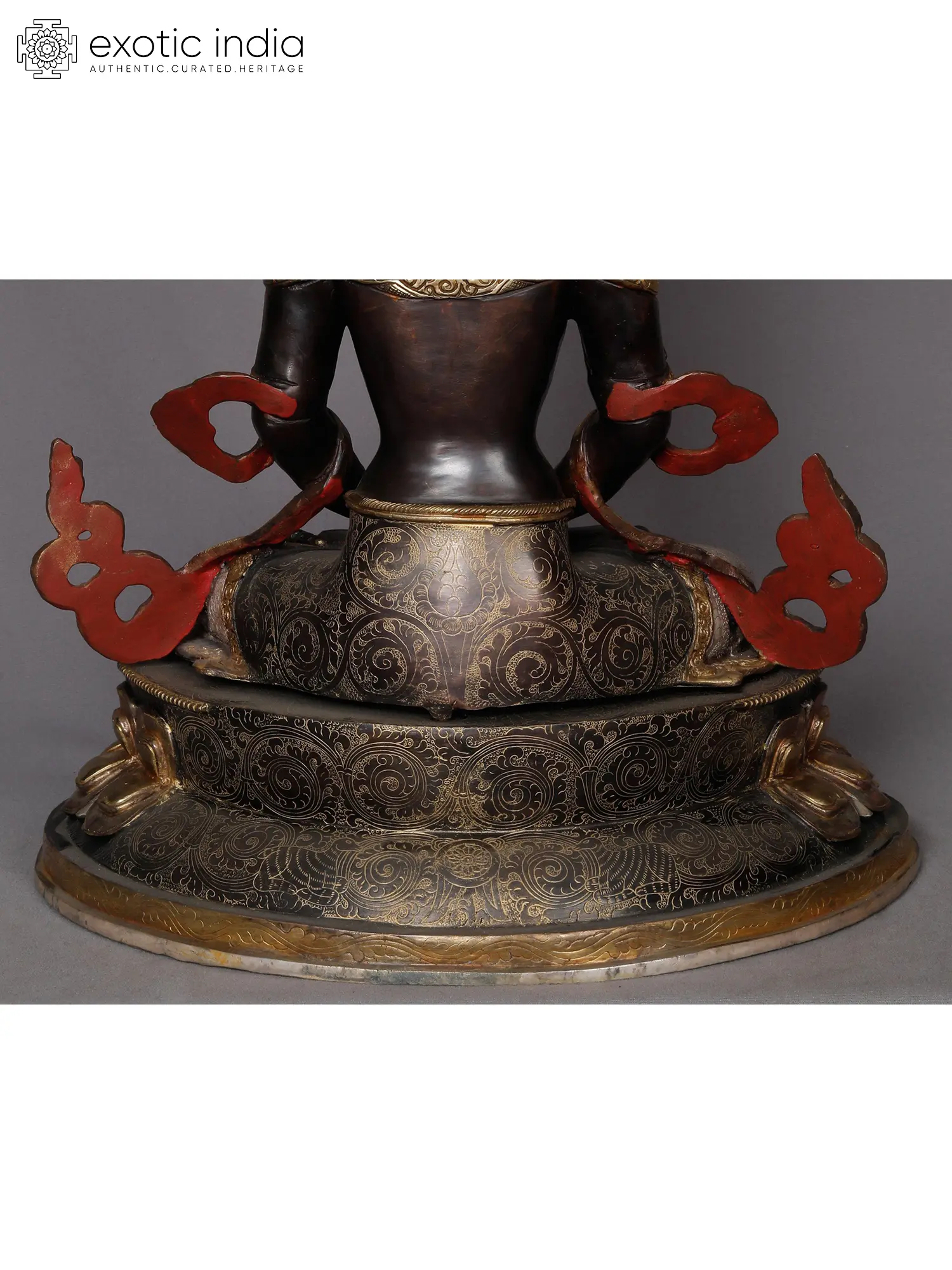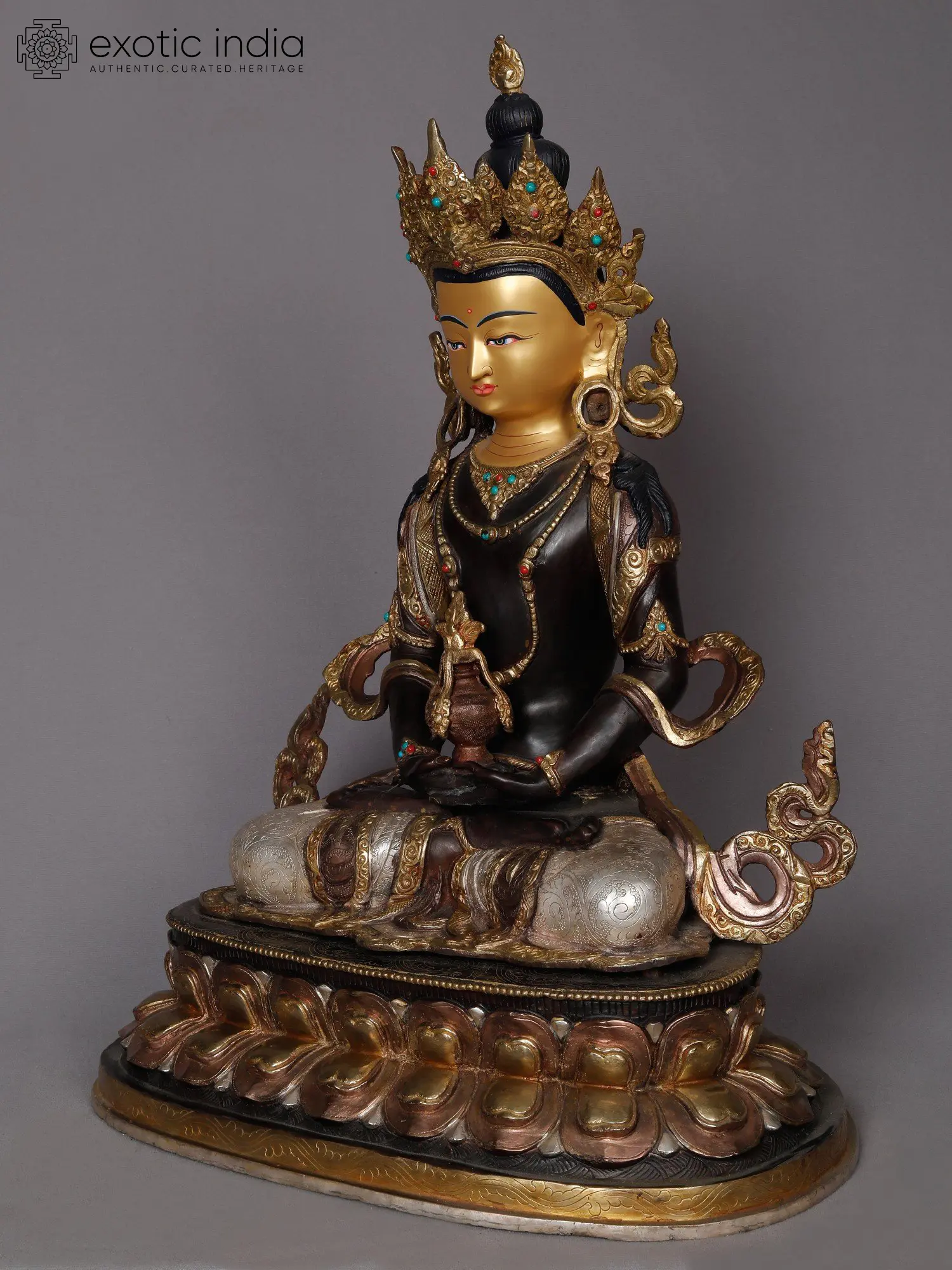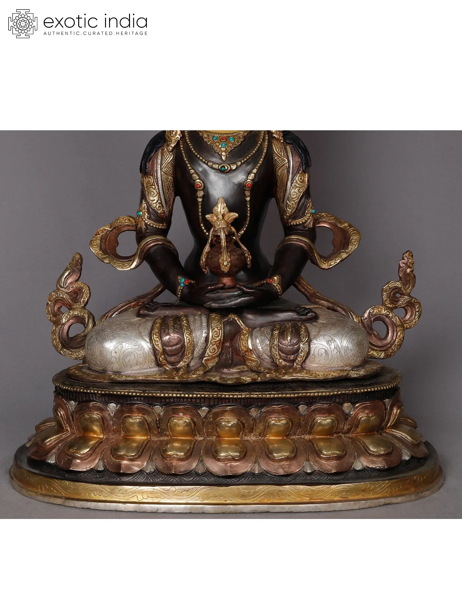 Aparmita is elegantly seated in a tranquil Dhyana Asana, holding a sacred vase in his hands. The centerpiece of the Aparmita statue is the ambrosia vessel, cradling the elixir of longevity. Adorned with the regal accouterments of a Bodhisattva, Aparmita's majestic presence is further accentuated by the ushnisha top knot, a symbol of ancient Indian royalty, positioned above his crown.