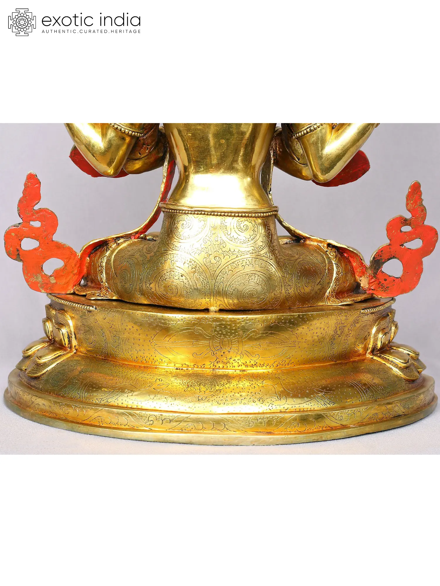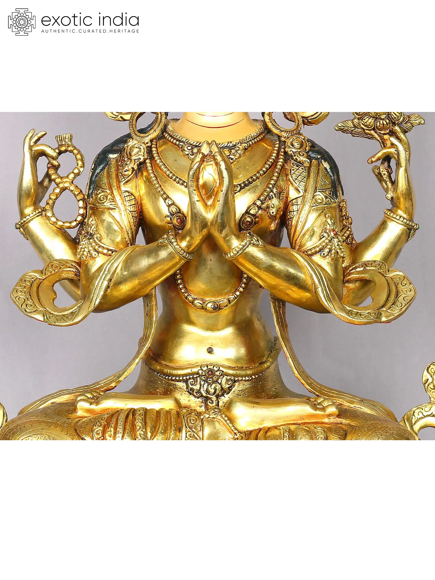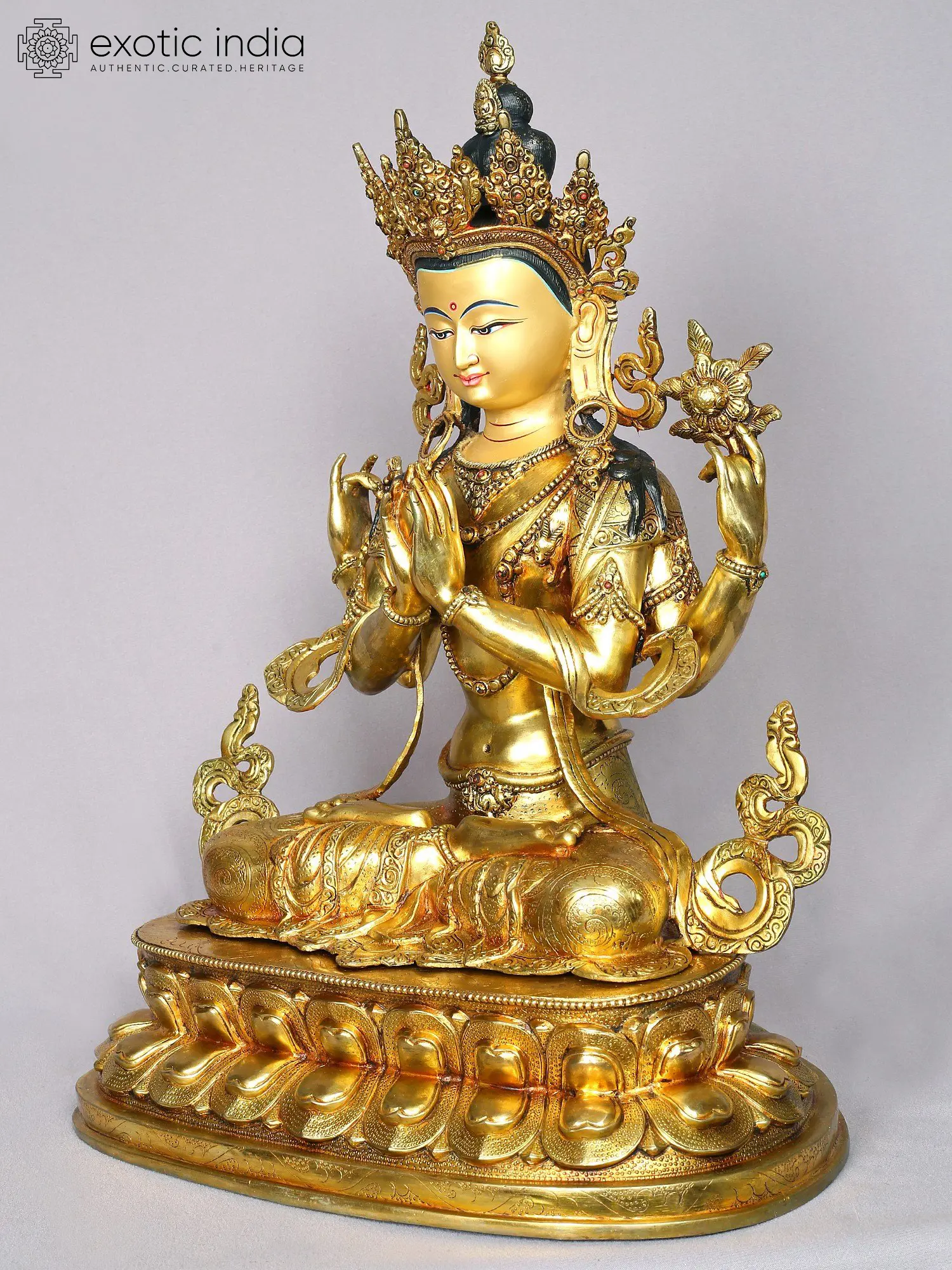 Holding the Chintamani- the wish-fulfilling jewel between his joined palms, dressed in divine attire, seated on a Padmasana (lotus throne) is Bodhisattva Avalokiteshvara or Chenrezig in this Nepalese gilded copper statue. The Bodhisattva sits tranquilly with a rosary symbolizing eternal knowledge and lotus in his secondary hands. Chenrezig’s enlightened wisdom shines on his face, especially in the serenity of his eyes. With a beautiful smile swept across his face, Avalokiteshvara stirs and calms the mind, simultaneously.