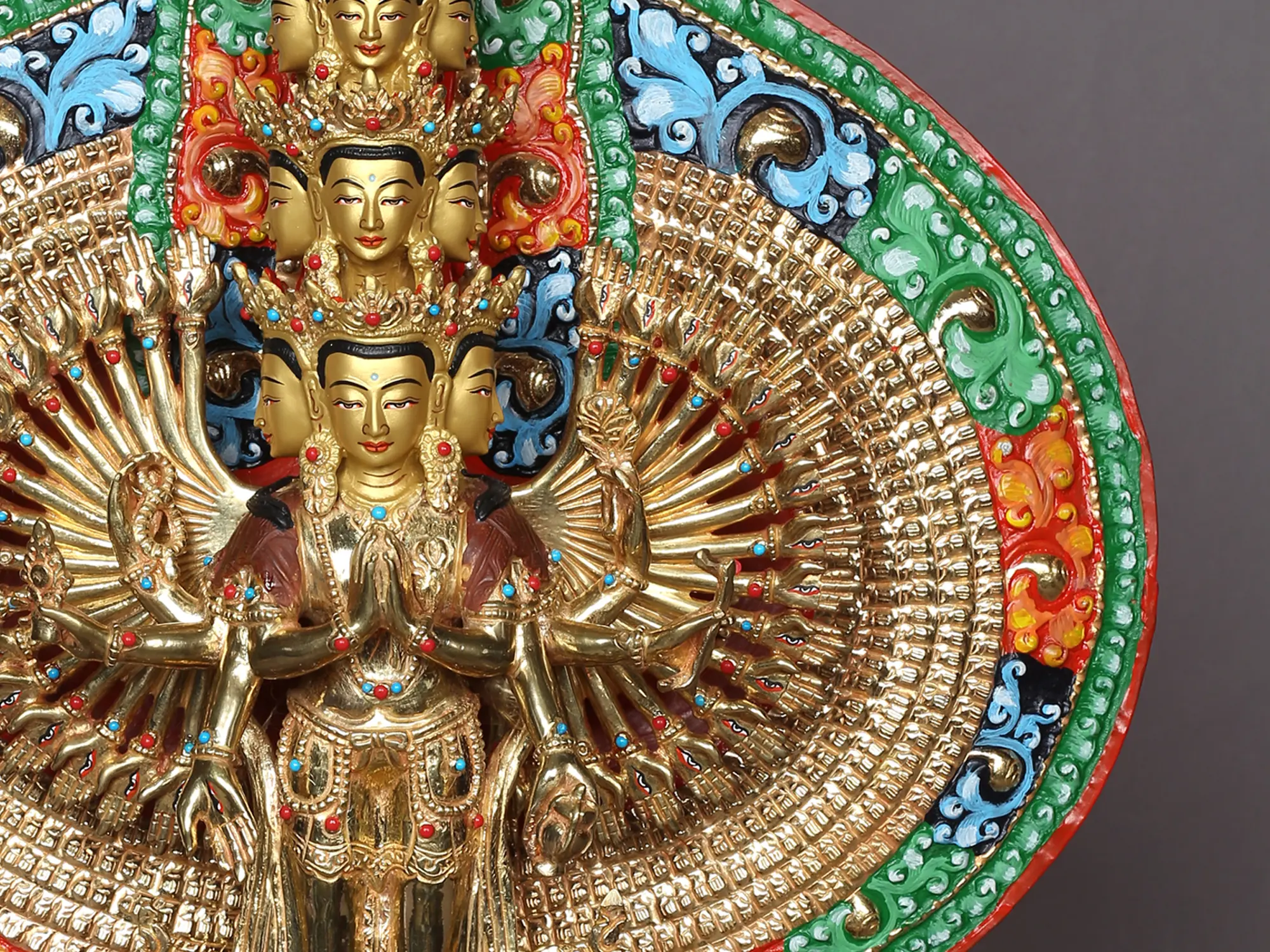 This resplendent statue captures the essence of Avalokiteshvara's omniscient gaze and all-encompassing embrace. The central figure stands with hands pressed together in prayer, a posture of deep reverence and mindfulness. Radiating outwards are hundreds of golden arms, each hand gracefully positioned, some holding symbolic objects, others extended in gestures of blessing and protection. These numerous arms symbolize the Bodhisattva's limitless power to help and guide all beings in their spiritual journeys. The intricate details of each hand, the serene expression on the multiple faces, and the flowing drapery of the robes are all rendered with exceptional skill, reflecting the rich artistic heritage of Nepalese craftsmanship. The vibrant halo, adorned with colorful motifs and auspicious symbols, frames Avalokiteshvara's benevolent countenance, further enhancing the divine aura of the piece.