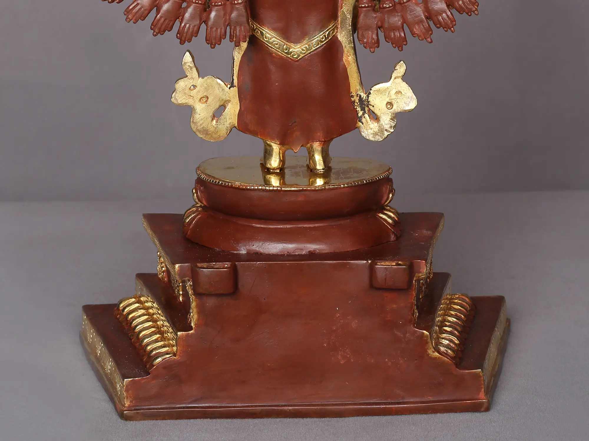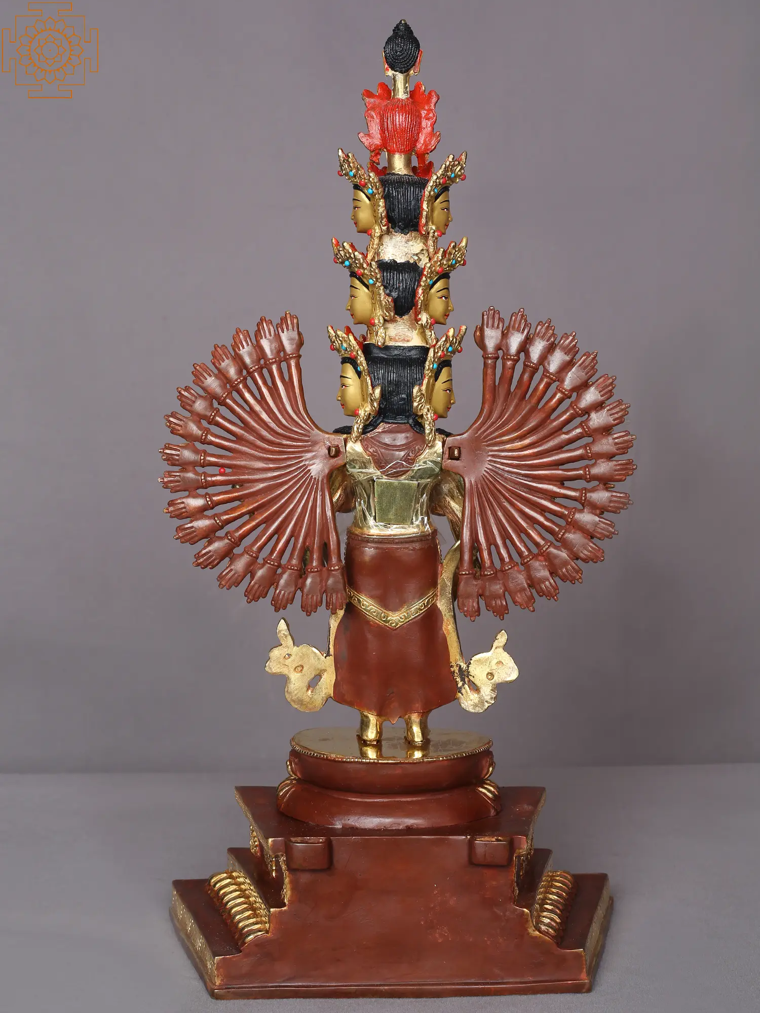 This majestic Nepalese statue of Bodhisattva Avalokiteshvara with 1,000 arms and 11 heads is displayed on a golden platform adorned with beautiful tones with a perfection that lends the composition a riveting animation. It symbolizes the god's limitless strength and compassion. The balance between Avalokiteshvara's numerous hands and bodies, the symmetry and unity of his face, and the magnificent aureole highlight the artisan's expertise in creating this gilded copper statue. The tiny stones that are skillfully set in the lavish jewelry worn by Avalokiteshvara display the refined aesthetics of Nepalese art. Standing like a cosmic pillar, Avalokiteshvara in this celestial form embodies the pinnacle of his compassion for earthly beings, seeing whose pain he was transformed into this awe-inspiring form.