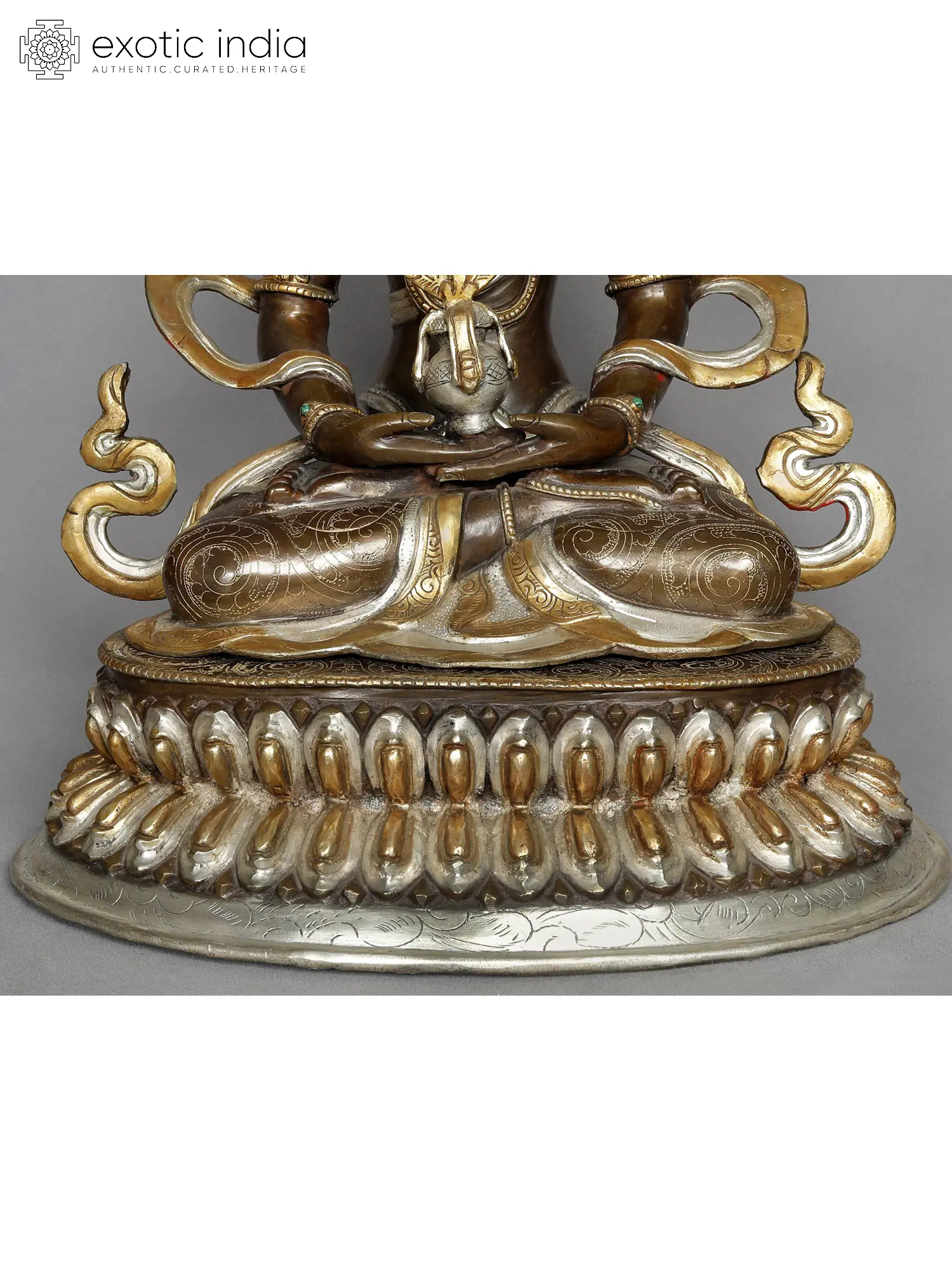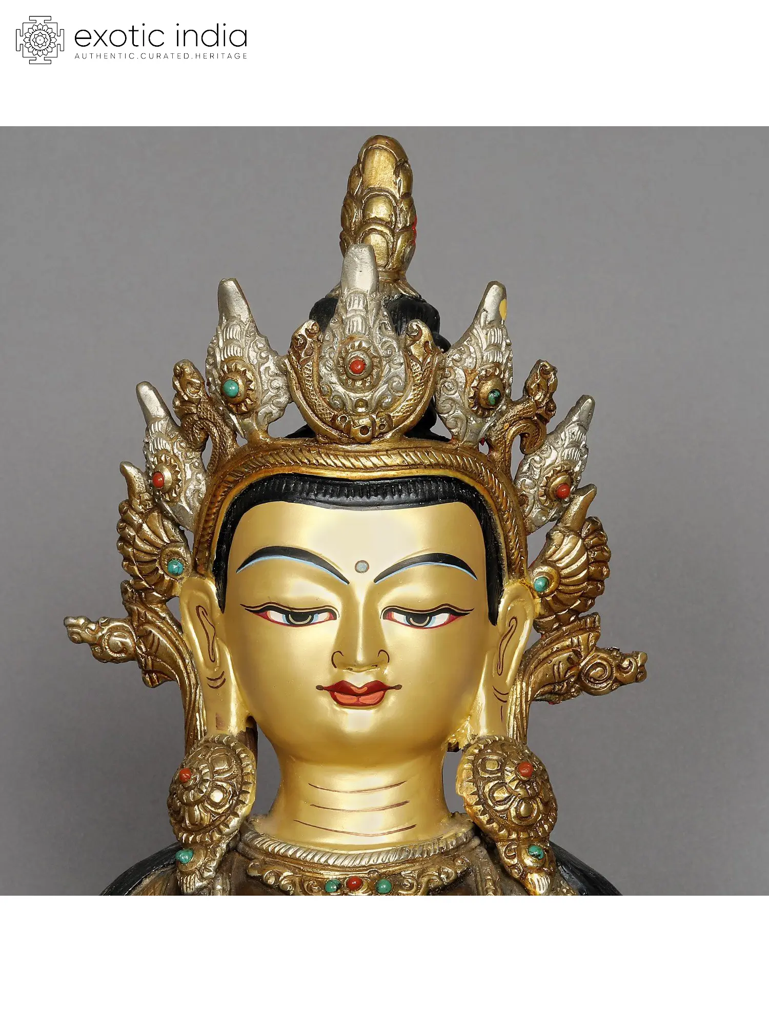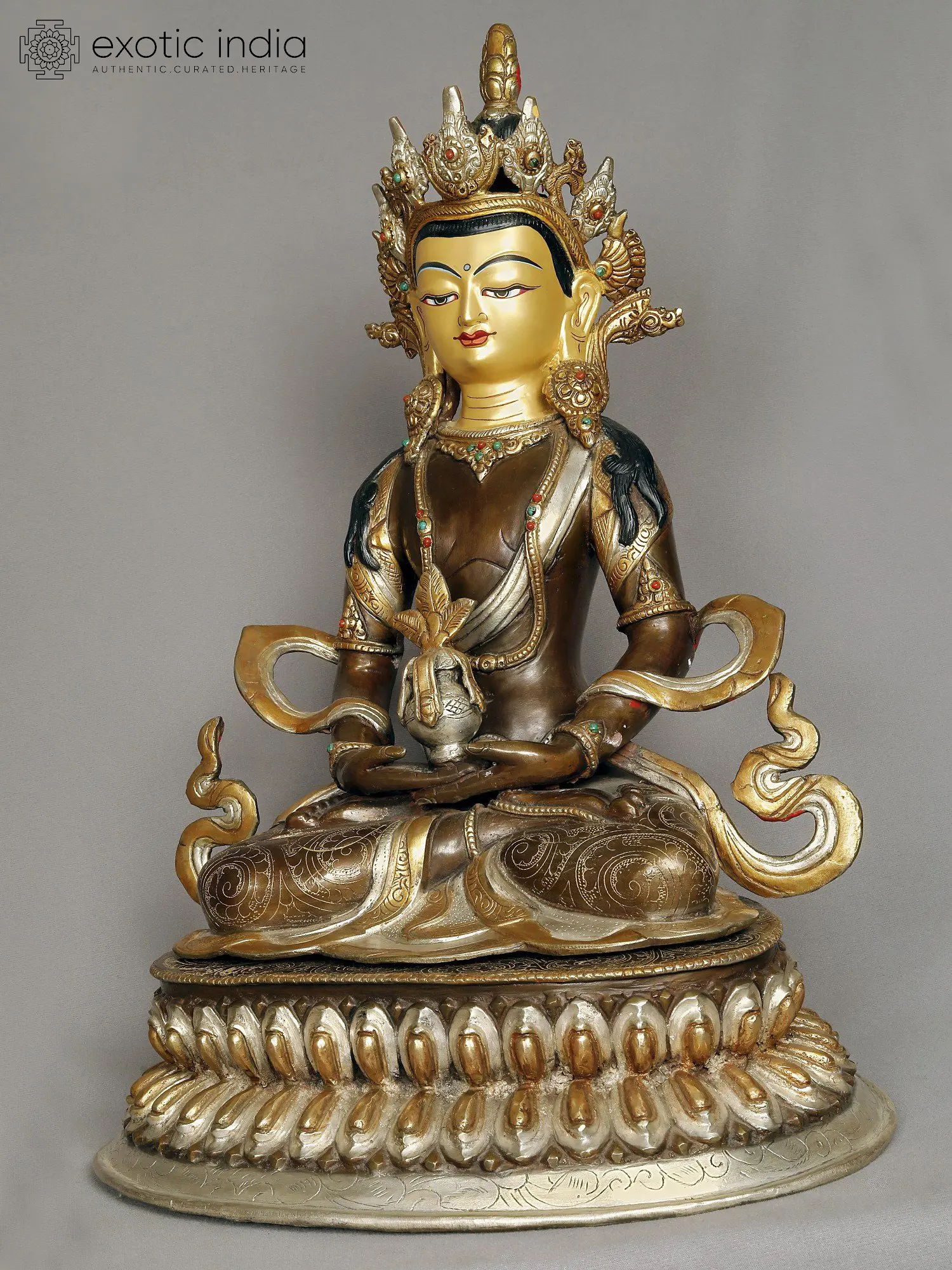 Dynamism in his flowing attire, mystically swaying frills of the golden crown and a stillness held in his blissful facial expressions, Aparmita also known as Amitayus is a source of soothing serenity for the devotee. This magnificent carving of Aparmita from Nepal made with brown copper and gold is holding a pot of ambrosia in his hands placed in the mudra or gesture of meditation. Aparmita, the deity of long life is depicted in life-affirming waters from the pot and heavenliness in Aparmita’s eyes bring an awe-inspiring richness to this Nepalese statue. It is believed that his presence brings wisdom, blessings and spiritual abundance.
