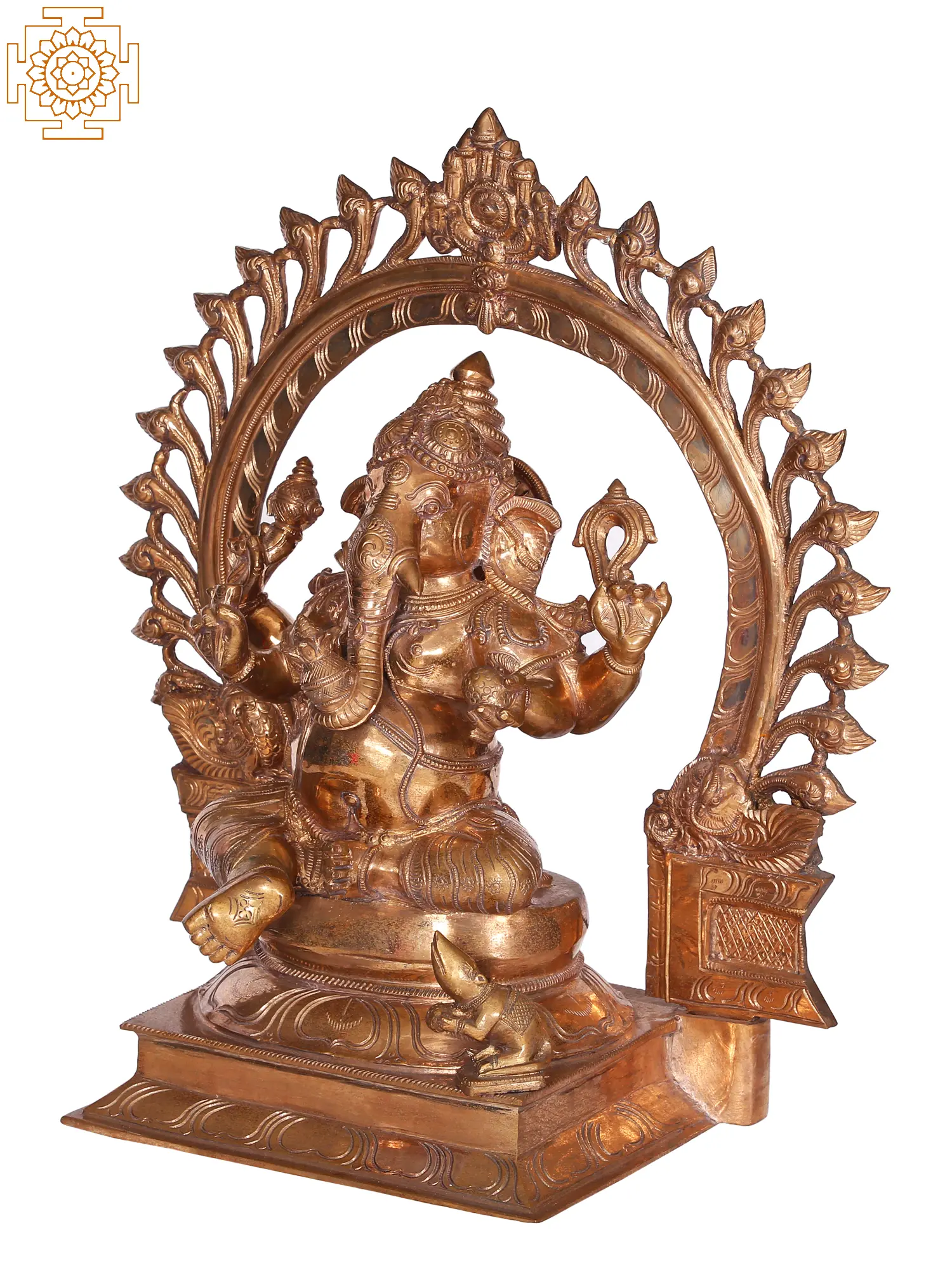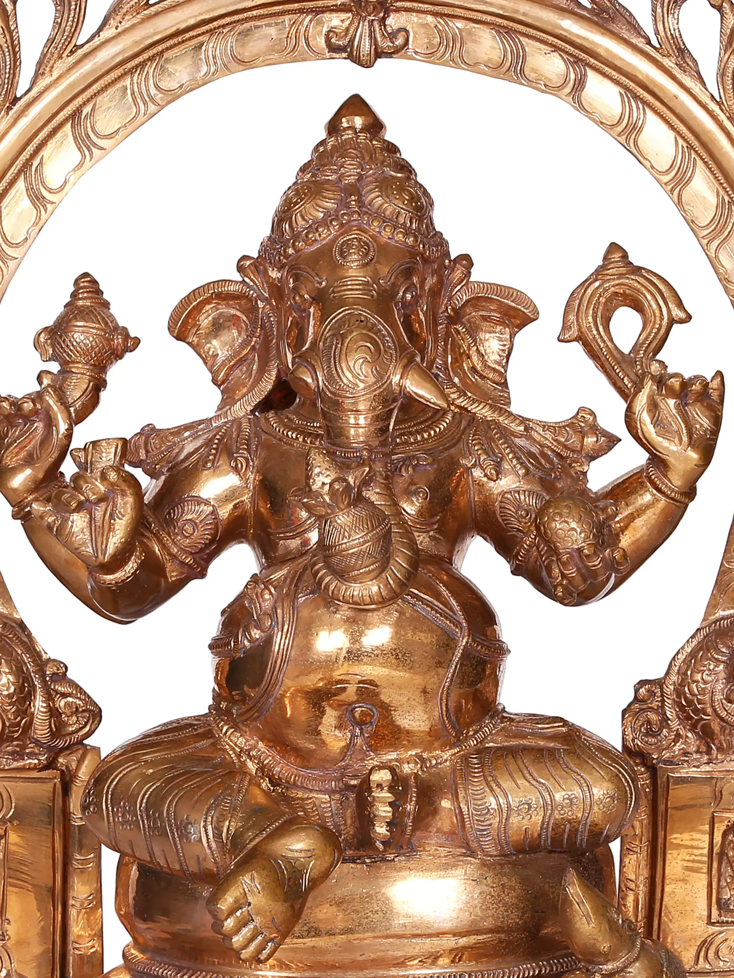 Majestically seated on an elaborate throne, radiating divine grandeur with his presence, Lord Ganesha in this Panchaloha murti carries all grandeur and auspiciousness of the three realms.