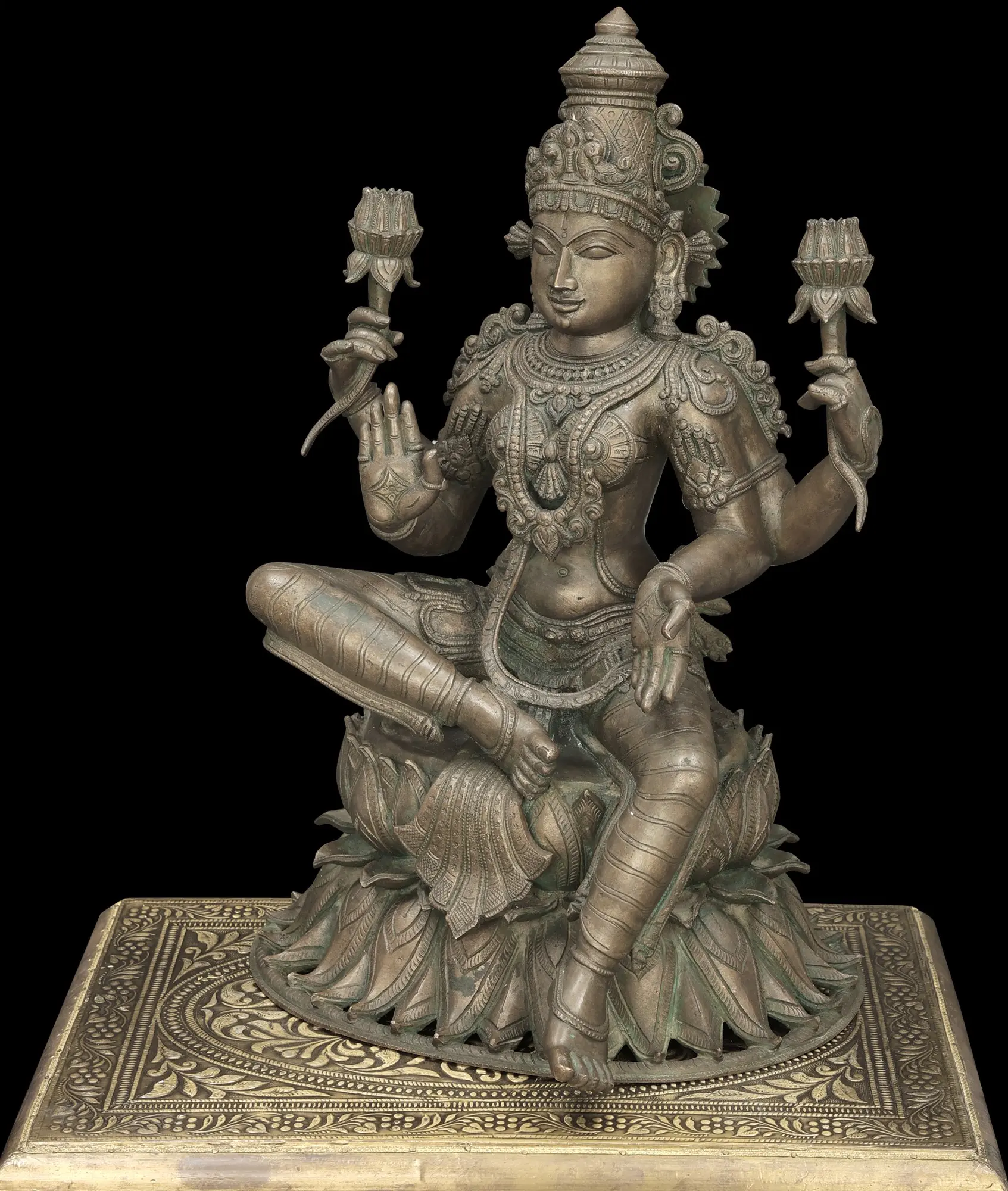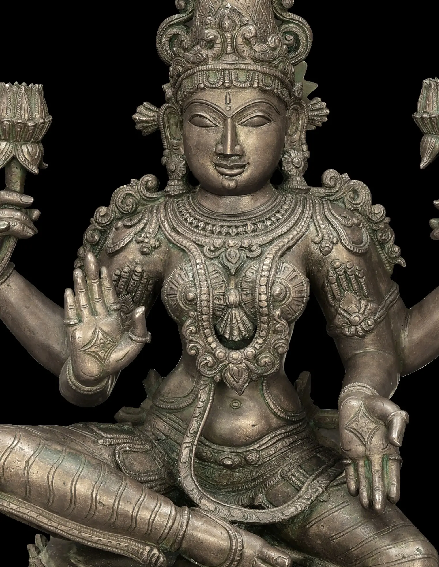 In Hindu mythology, Lakshmi is the goddess of wealth, fortune, power, beauty, prosperity, and auspiciousness. She is the consort of Lord Vishnu, the preserver of the universe, and is often depicted emerging from the cosmic ocean during the Samudra Manthan (churning of the ocean). This divine birth signifies her inherent purity and her role in bringing forth prosperity and joy to the cosmos. Tales tell of her boundless generosity, her ability to bestow immense riches and material comforts, but also her deeper connection to spiritual wealth and inner peace. She is worshipped not only for material gain but also for the blessings of contentment, harmony, and spiritual growth. This magnificent statue serves as a focal point for devotion and a tangible representation of these profound divine qualities. The rich patina of the bronze, achieved through skilled artisanal techniques, adds depth and character, suggesting a lineage of spiritual veneration. The serene yet powerful aura of the goddess invites contemplation and a sense of inner tranquility, while her presence is believed to attract positive energies and ward off negativity. Whether placed in a puja room, a living space, or an office, this statue is a testament to ancient traditions and a beautiful expression of faith and aspiration. It is an heirloom-quality piece that can be cherished for generations, continuously radiating the blessings of Goddess Lakshmi.