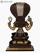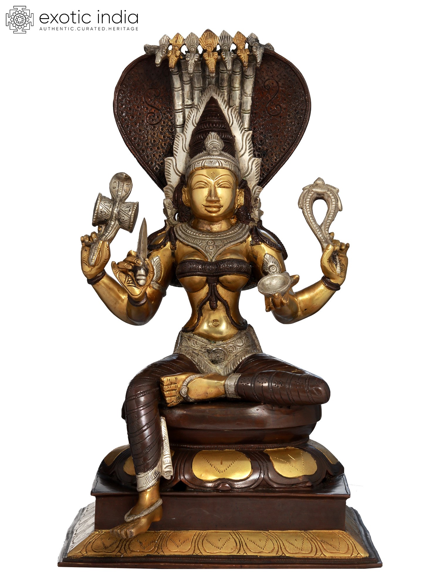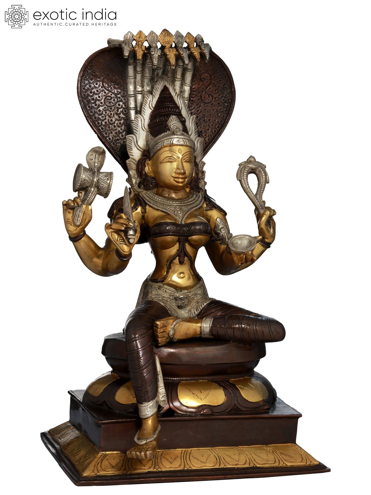 It is also believed that Vibhuti (ashe) received as prasada in her temples have great curative powers. Here the goddess is in a typically benign form with four arms. Sometimes she is shown with only two arms, at other times with as many as eight arms. She is seated in a relaxed posture [ardhaparyankasana], much as she might be found in many of her local shrines. What immediately identifies her visually to her worshippers is the seven-hooded snake projection over her crown.