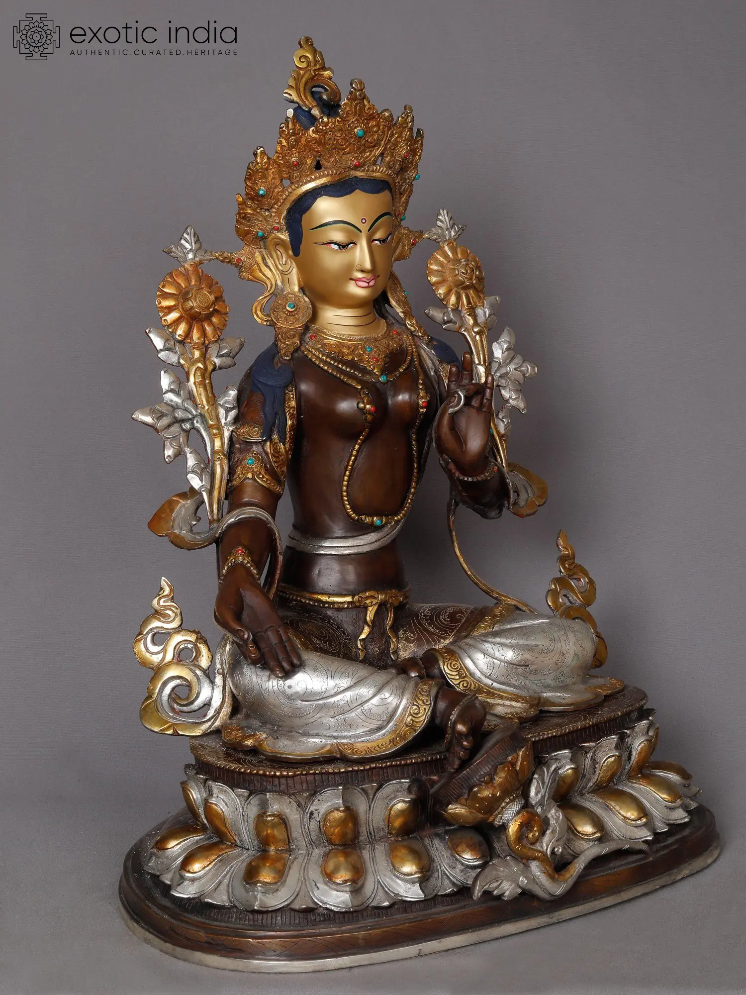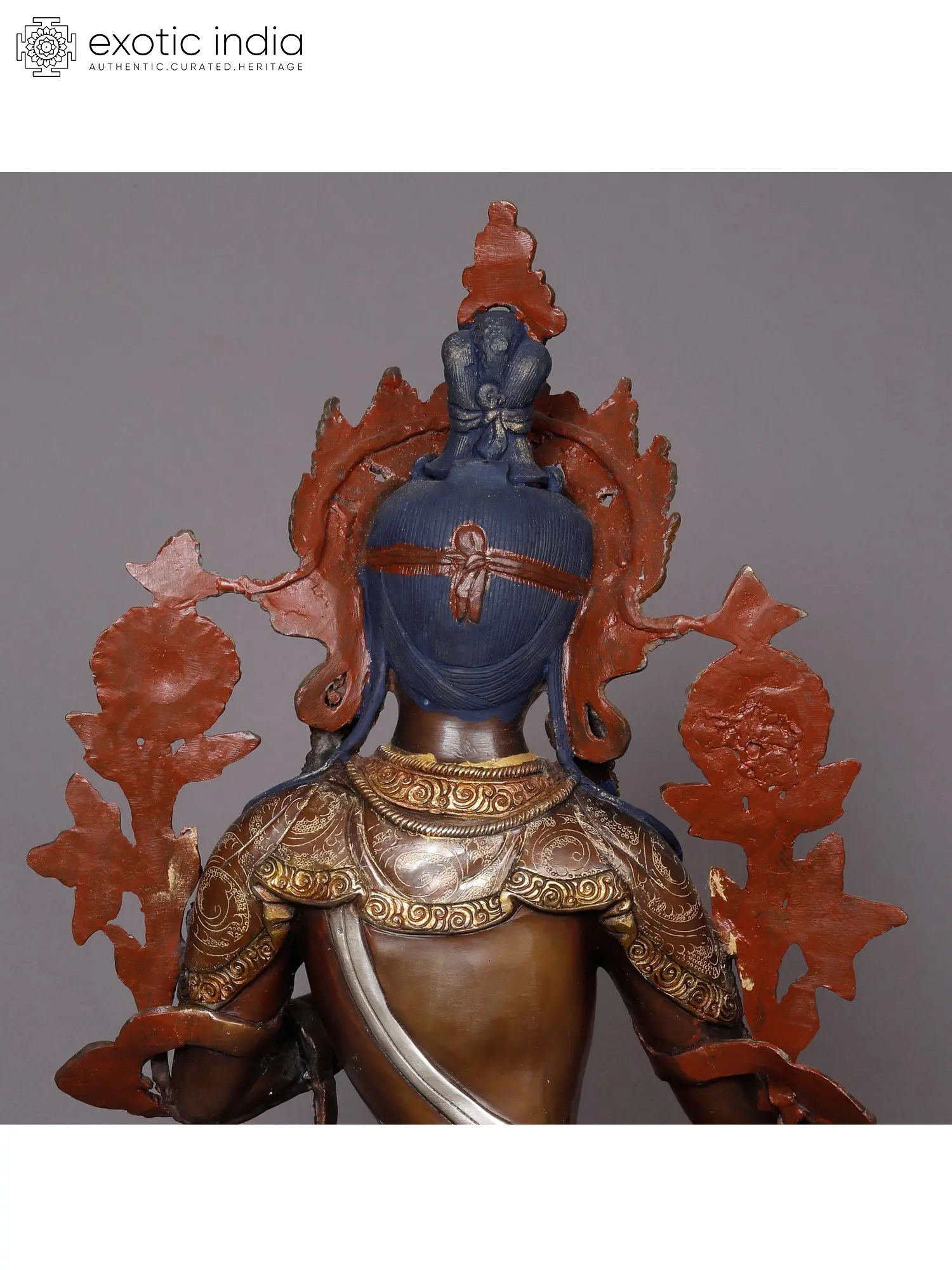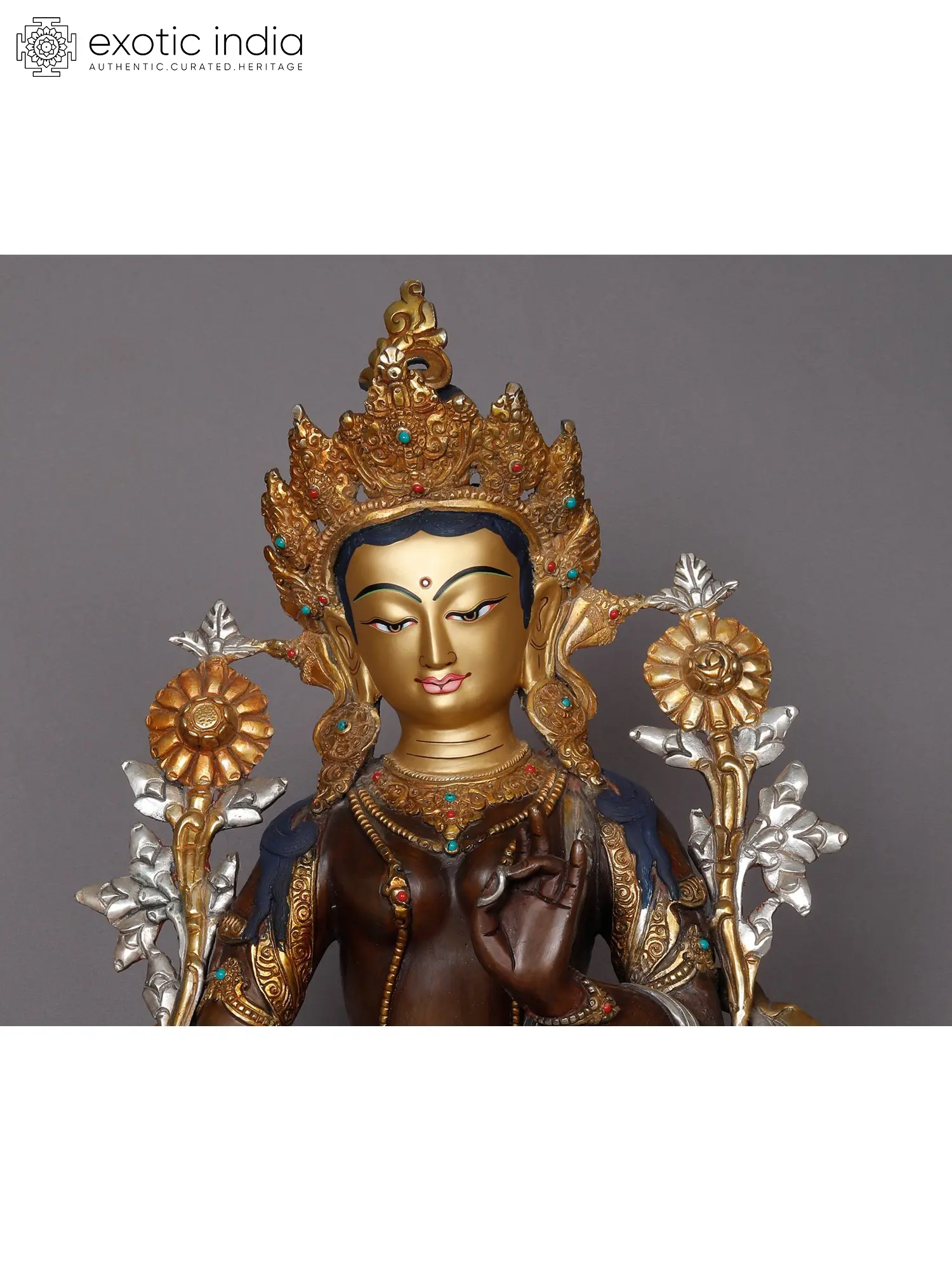 Tara's embellishments comprise a harmonious blend of red and blue jewels, harmonizing against the backdrop of a copper base adorned with resplendent gold accents.