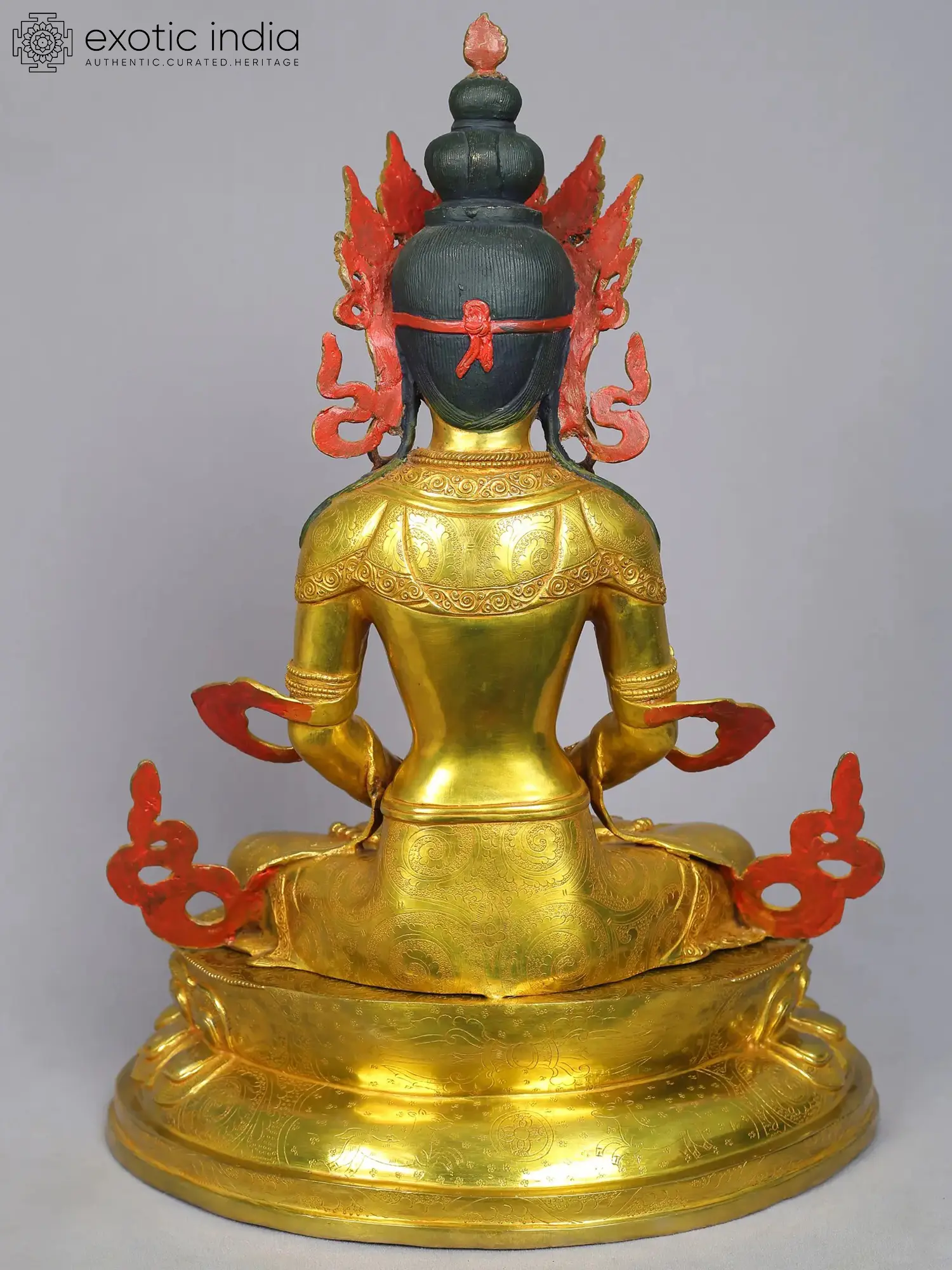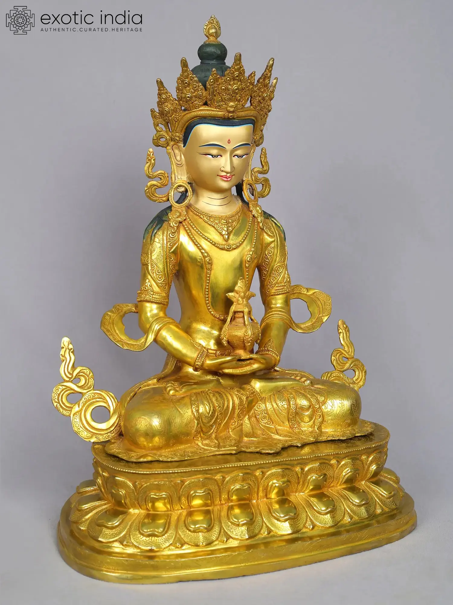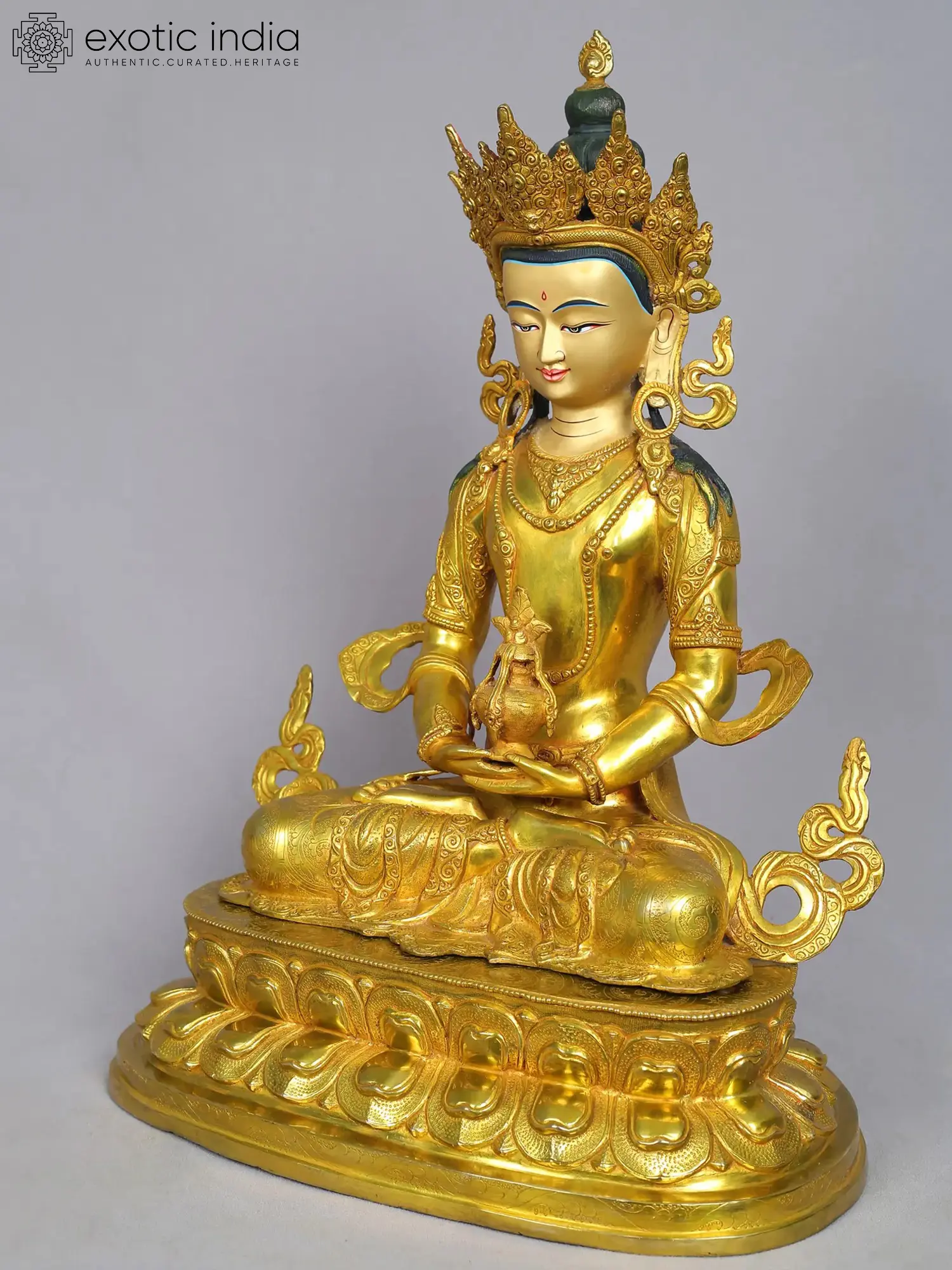 Lord Aparmita is renowned as the bestower of longevity and is invoked during rituals involving the prolongation of life. In this mesmerising sculpture, he is sitting on a lotus podium, in the padmasana (lotus position) with his right leg on top of his left and the soles of feet facing the sky. He is sitting with his hands together in the Dhyana Mudra (concentration gesture), carrying a vase or a Kalasha that is filled with a healing elixir. He is wearing a crown embellished with elaborate decorations, representing his spiritual authority and enlightened state. Over Aparmita Buddha’s body, the draped robes colossally emphasising his receptive character. It is believed that Lord Aparmita possesses infinite light. He is associated with love and compassion.