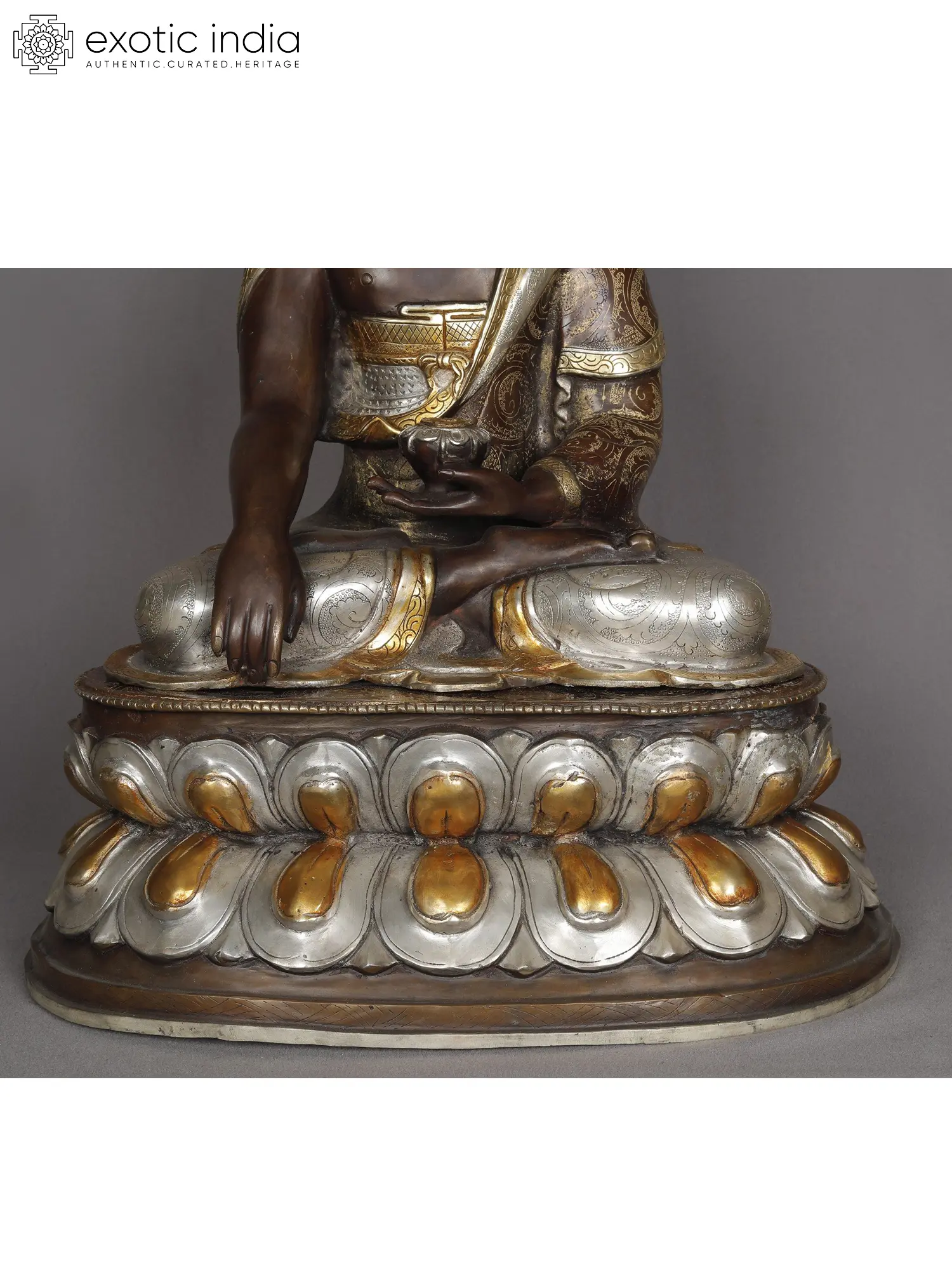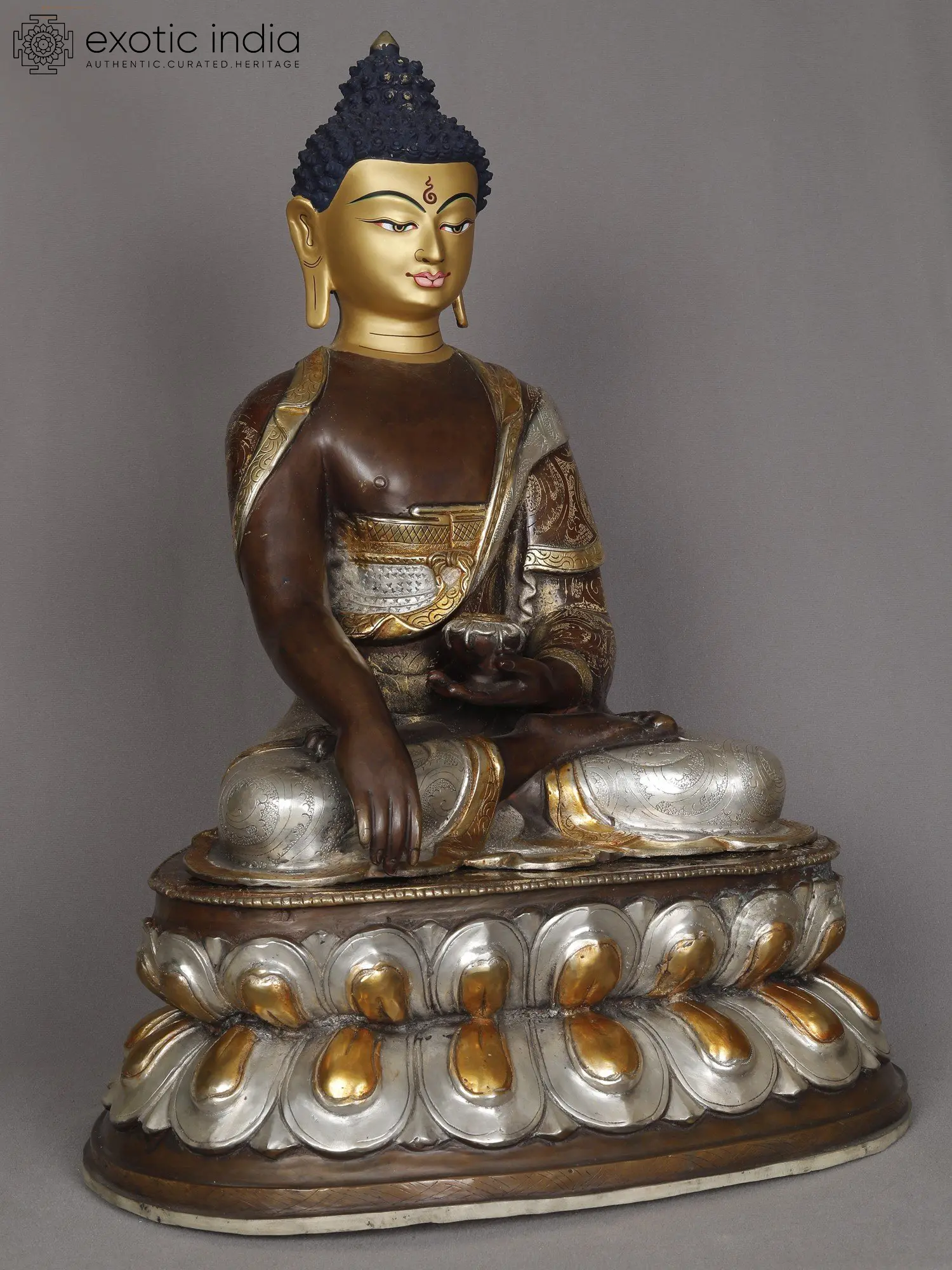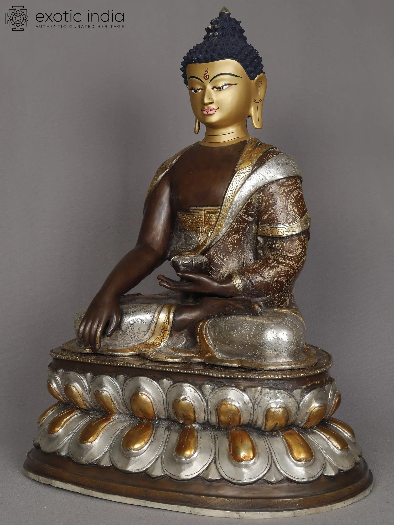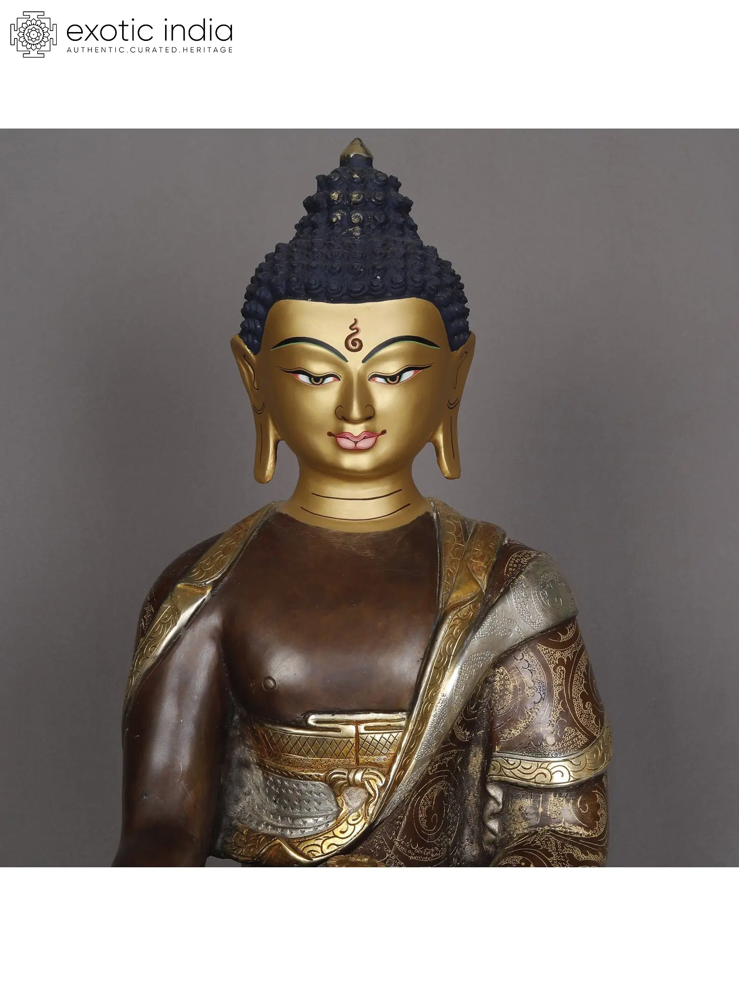 His right hand holds a pot while his left-hand forms the bhumisparsha mudra, symbolizing the earth-touching gesture during his encounter with Mara, the temptress. The vajra, signifying the Vajrayana sect, is placed in front. He is attired in a simple monastic robe or sanghati. Notably, his eyes exhibit inlaid marks, influenced by Kashmiri or Eastern Indian artistry.