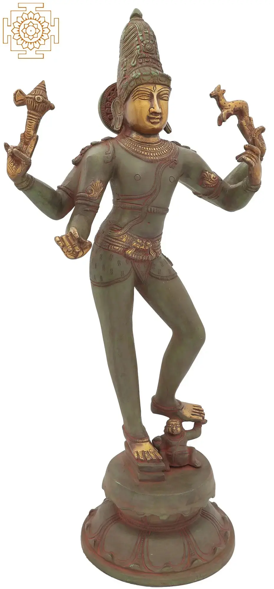 This magnificent brass statue captures the profound essence of Lord Shiva in his benevolent form as Pashupatinath, the Lord of Animals. Standing at an impressive 19 inches, this exquisite sculpture is a testament to the rich artistic heritage of India, meticulously handcrafted by skilled artisans. The warm, lustrous glow of the brass emanates a sense of peace and divinity, making it a captivating centerpiece for any sacred space or home decor. The posture of Lord Shiva is dynamic and graceful, hinting at the cosmic dance he is known for. His multiple arms are poised in gestures that speak of protection and blessings. In one hand, he holds a small, intricately detailed deer, symbolizing his compassionate dominion over all creatures, great and small. This imagery resonates with ancient tales of Shiva as the protector of the wild, the one who understands the silent language of the beasts and ensures their well-being. The presence of the deer signifies purity, gentleness, and the profound connection between the divine and the natural world.