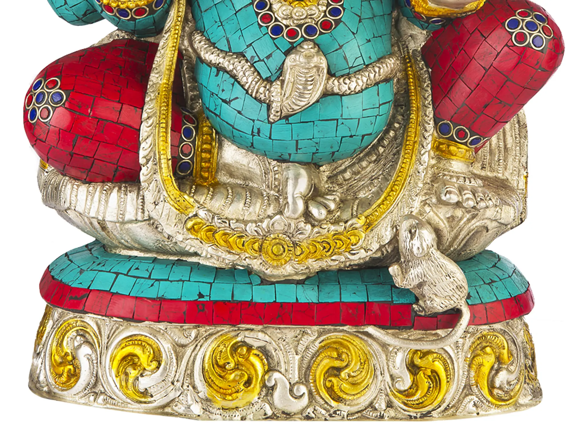 Invite prosperity and wisdom into your space with this meticulously handcrafted sculpture. Every detail, from the curve of his trunk to the serene expression on his face, reflects the dedication of the Indian artisans who have poured their skill and devotion into this piece. Crafted from brass, this representation is more than a mere object; it's a conduit to the divine. The colors are carefully integrated, showcasing a sophisticated and divine aesthetic. The presence of Ganesha is often invoked at the beginning of new ventures, journeys, and ceremonies. He is the remover of obstacles, the lord of new beginnings, and the patron of arts and sciences. Having this sculpture in your home can serve as a reminder of these auspicious qualities, encouraging you to approach life's challenges with grace and wisdom.
